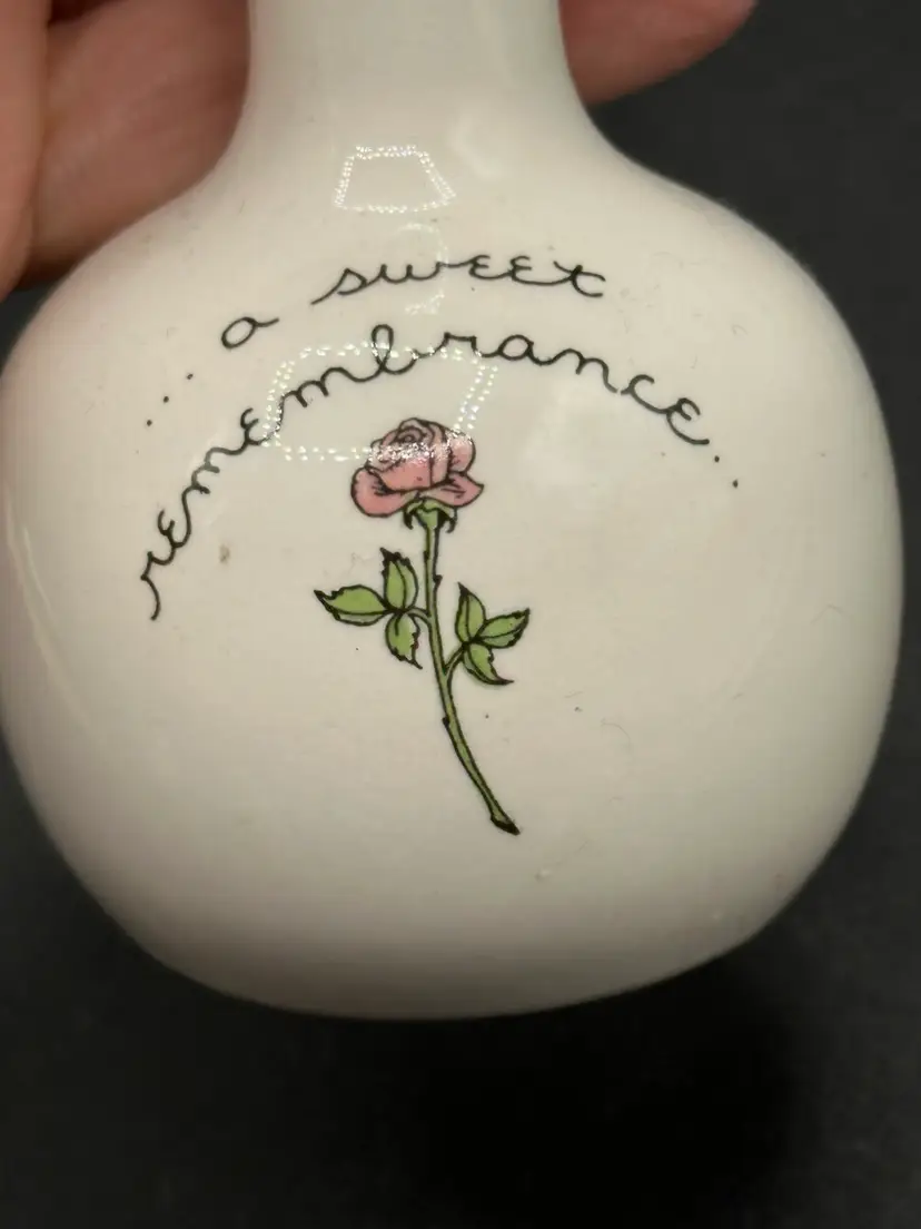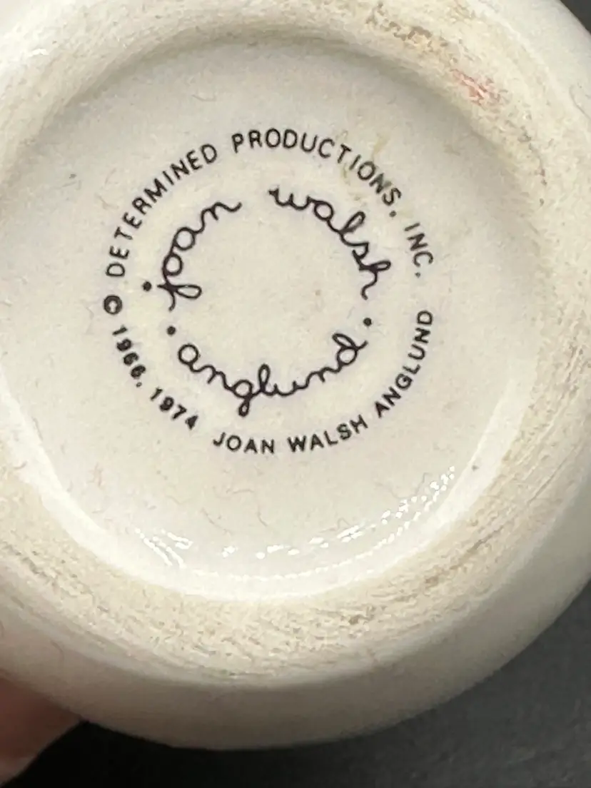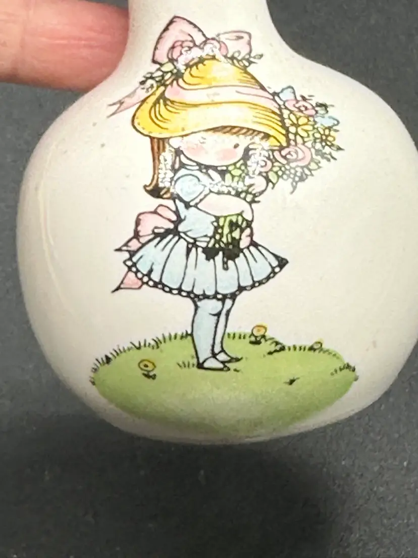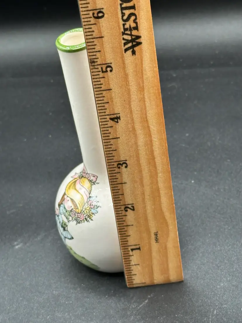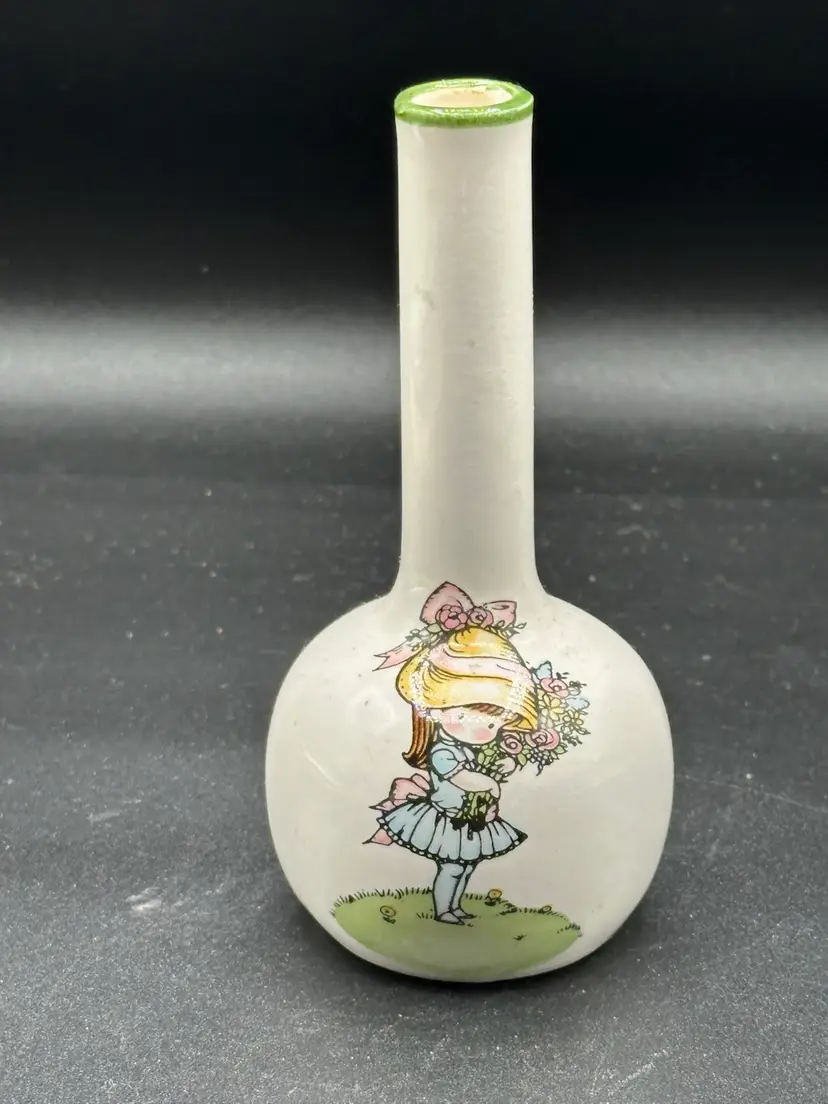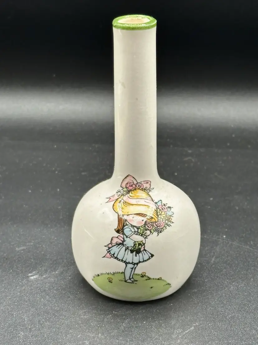 Joan Walsh Anglund vintage bud vase ....... a sweet remembrance Features girl holding a bouquet of flowers Dated 1974 Japan By Determined Productions Measures 5" tall In excellent pre-owned condition with no chips, cracks or crazing.