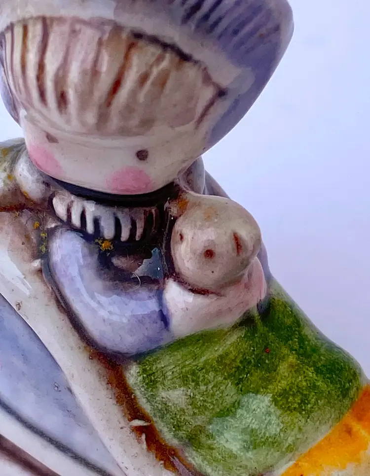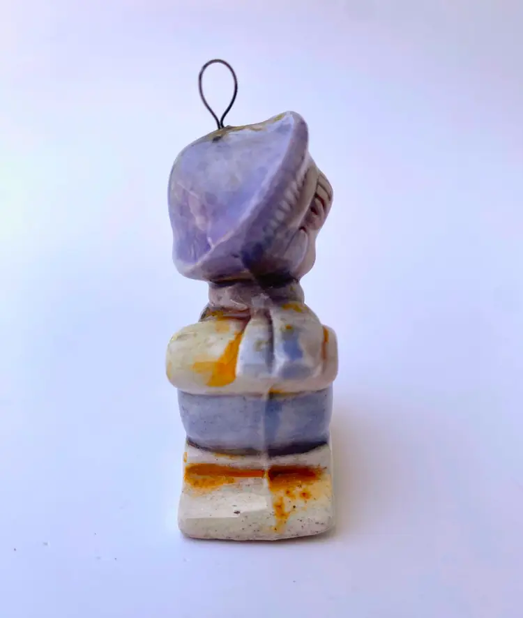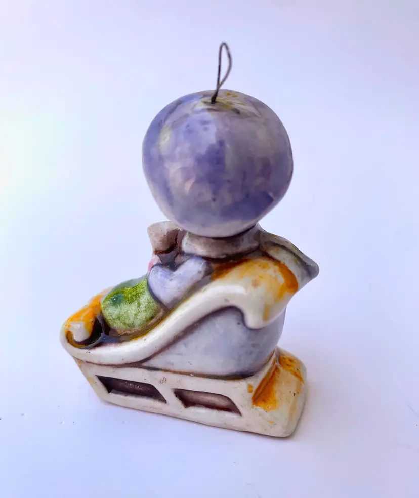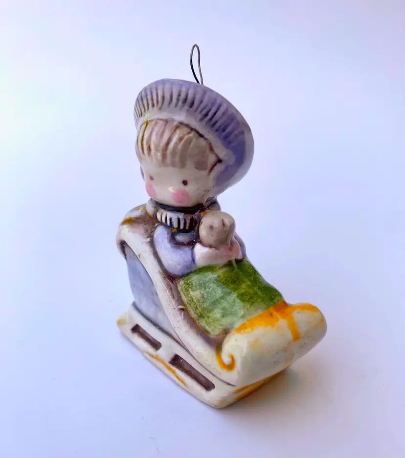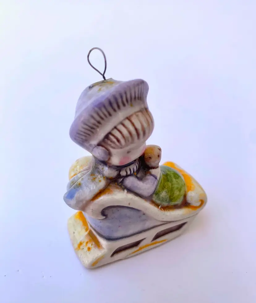 This is a vintage Joan Walsh Anglund 70's ceramic figurine ornament of a little girl in a sleigh holding her teddy bear. Great collectible ornament. Measurements: 2.25" Height x 1.75" Length x 0.75" Width Made in Japan.