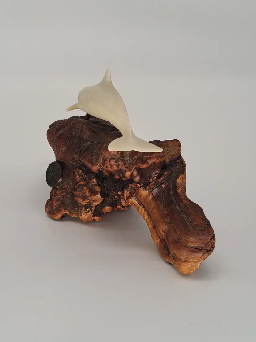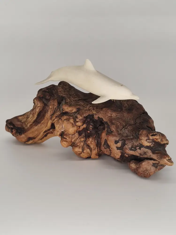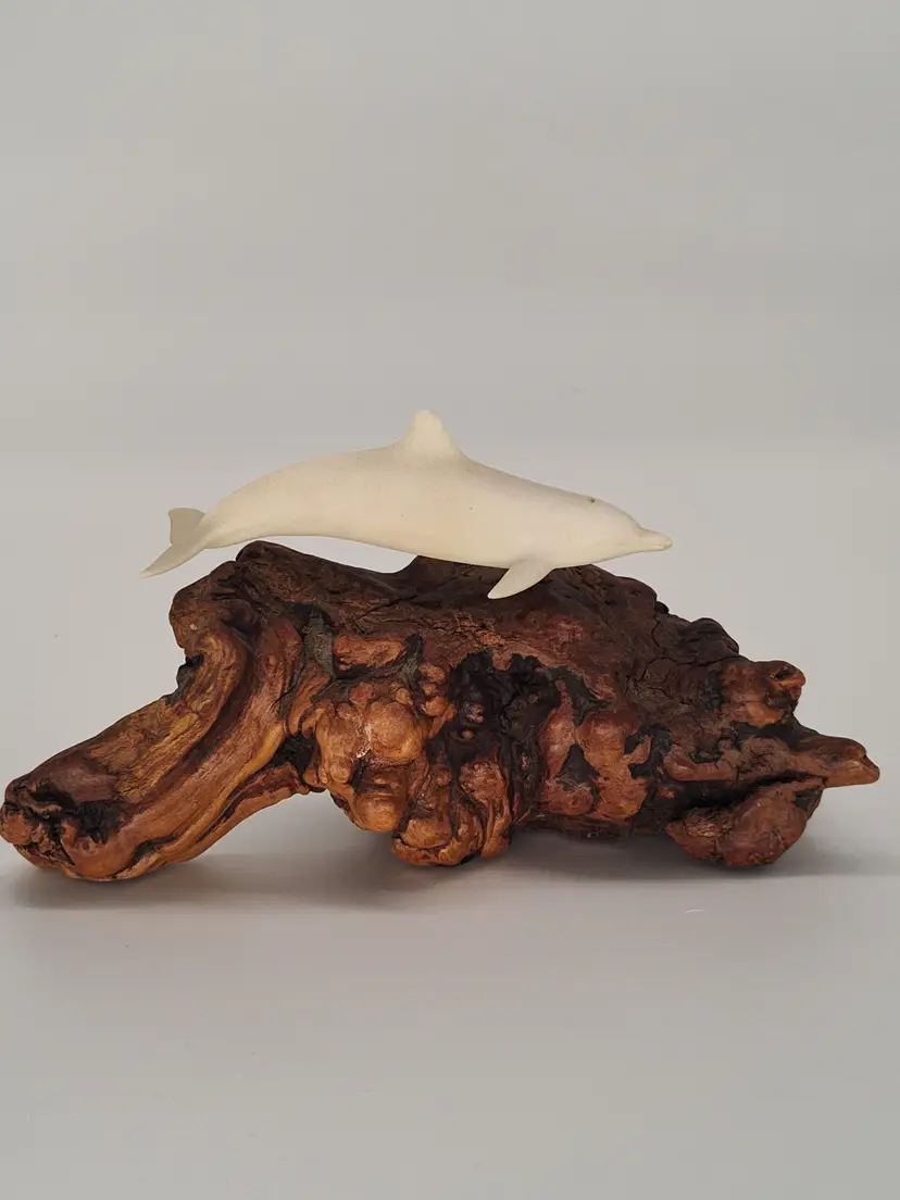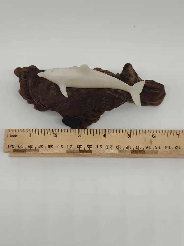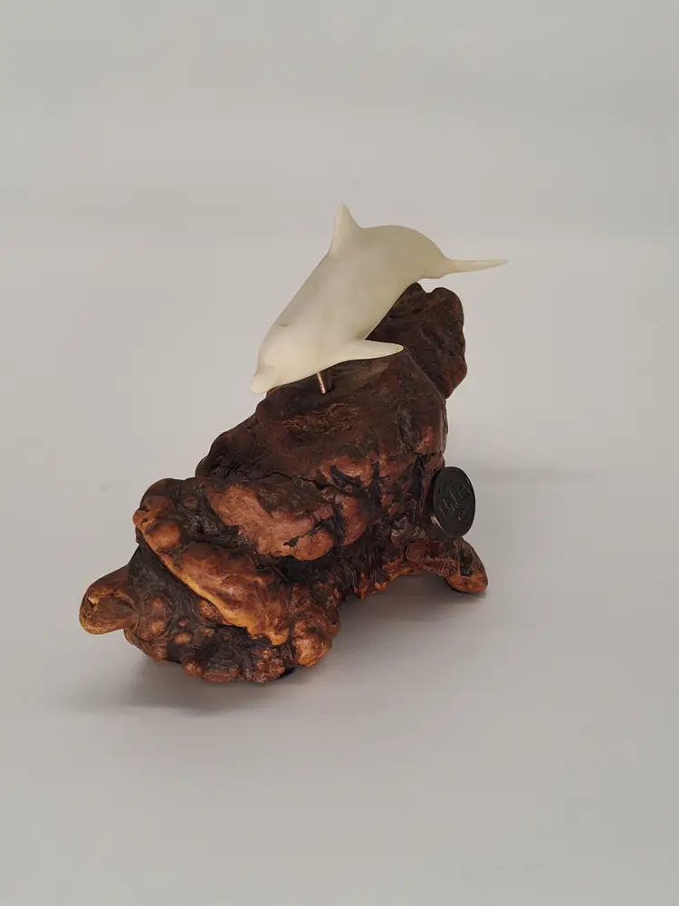 This is a white porcelain 3in dolphin mounted on a 5 in piece of burl wood.