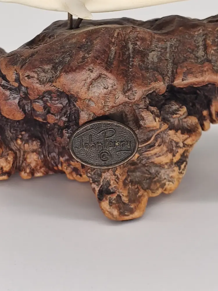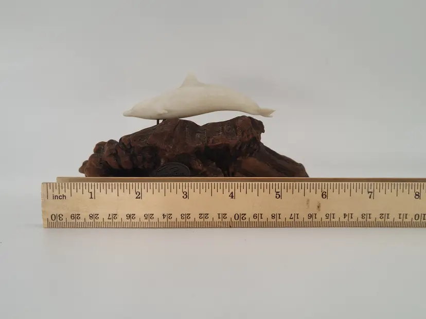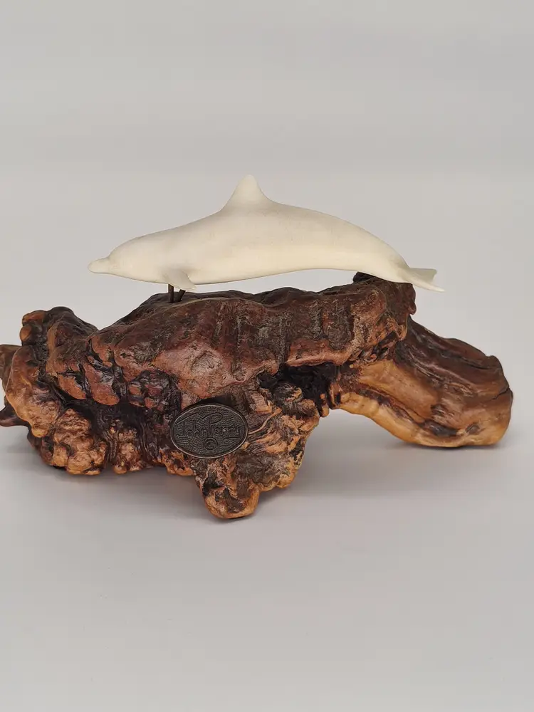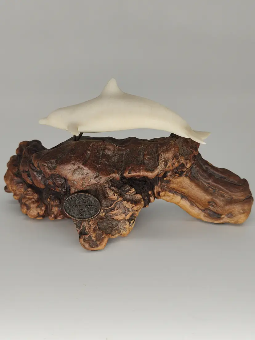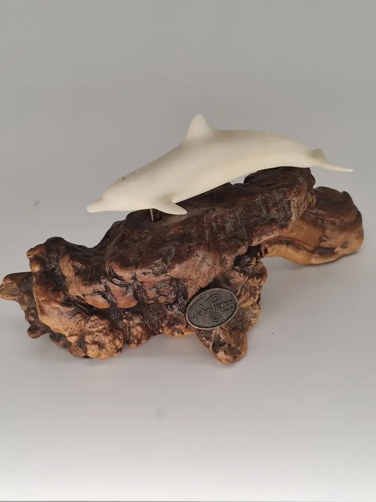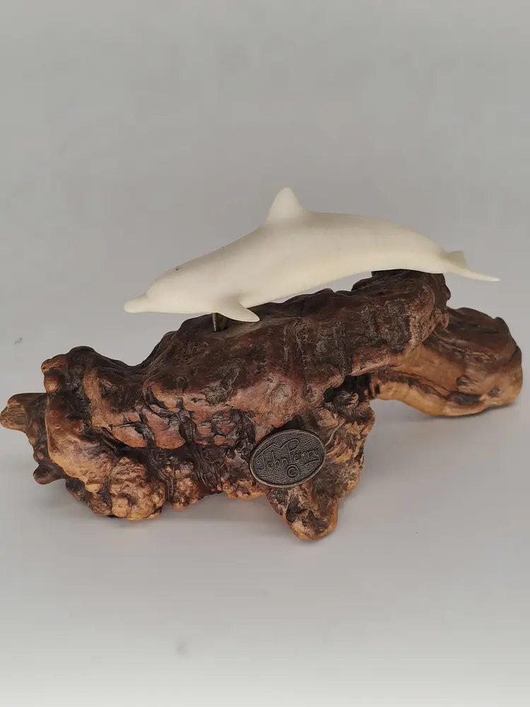 This is a white porcelain 3in dolphin mounted on a 5 in piece of burl wood.