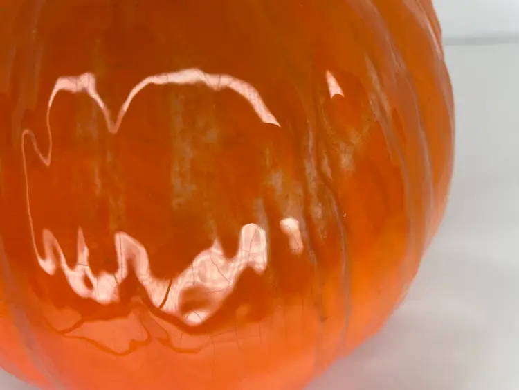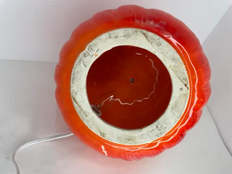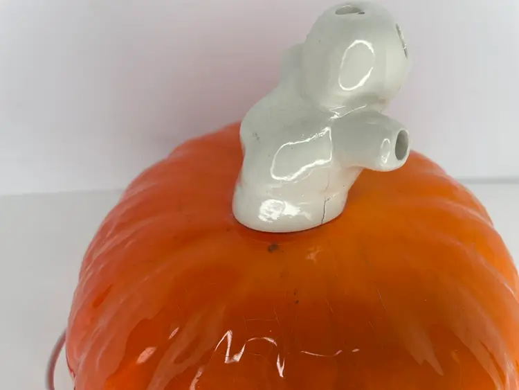 No chips or cracks. Some crazing & uneven glaze. Writing on bottom. Had to move metal bracket to a lower part of bulb socket in order for it to fit into the pumpkin hole.