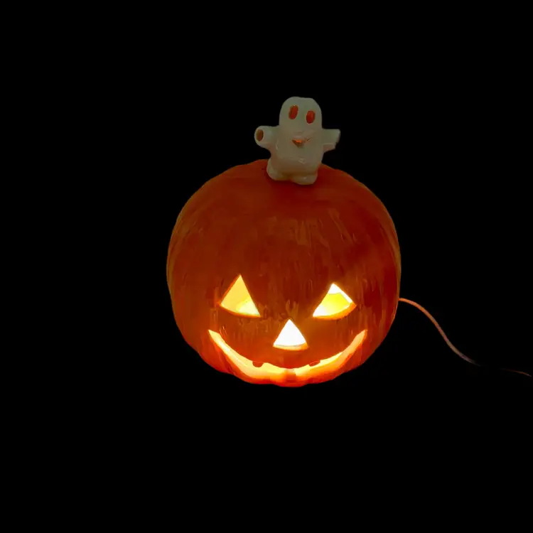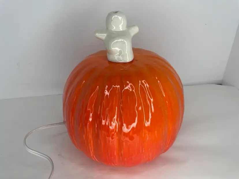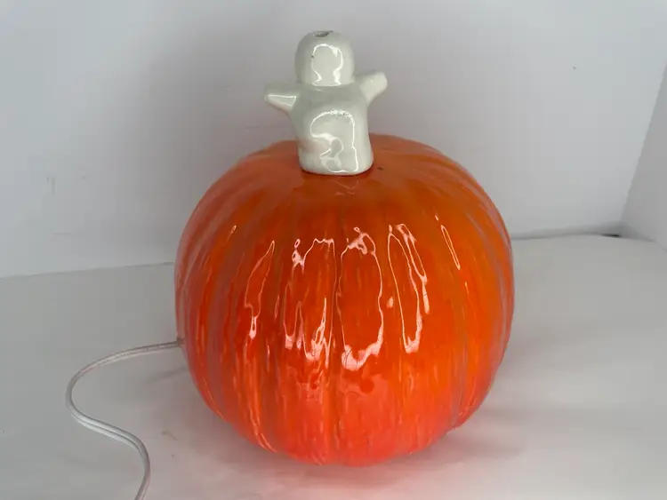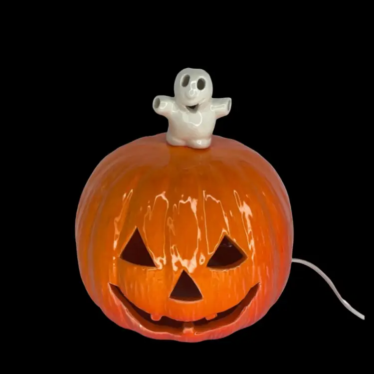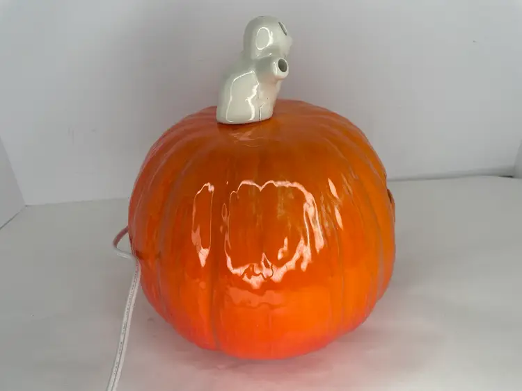 Add some spooky charm to your Halloween decor with this vintage kitschy lighted ceramic ghost on jack o lantern. Measuring 9 inches high, this unique piece is sure to create a kitschy yet fun ambiance for your Halloween party. The orange color and ceramic material make it a perfect addition to your collection of Halloween decorations. Whether you're a collector or just looking for a fun and unique piece, this lamp is sure to impress.