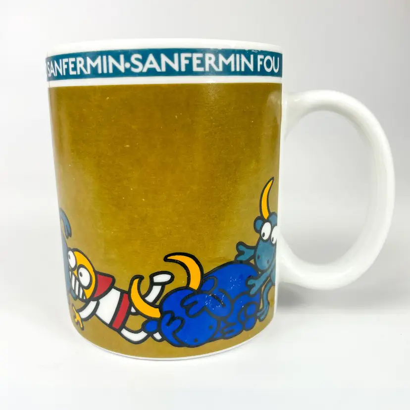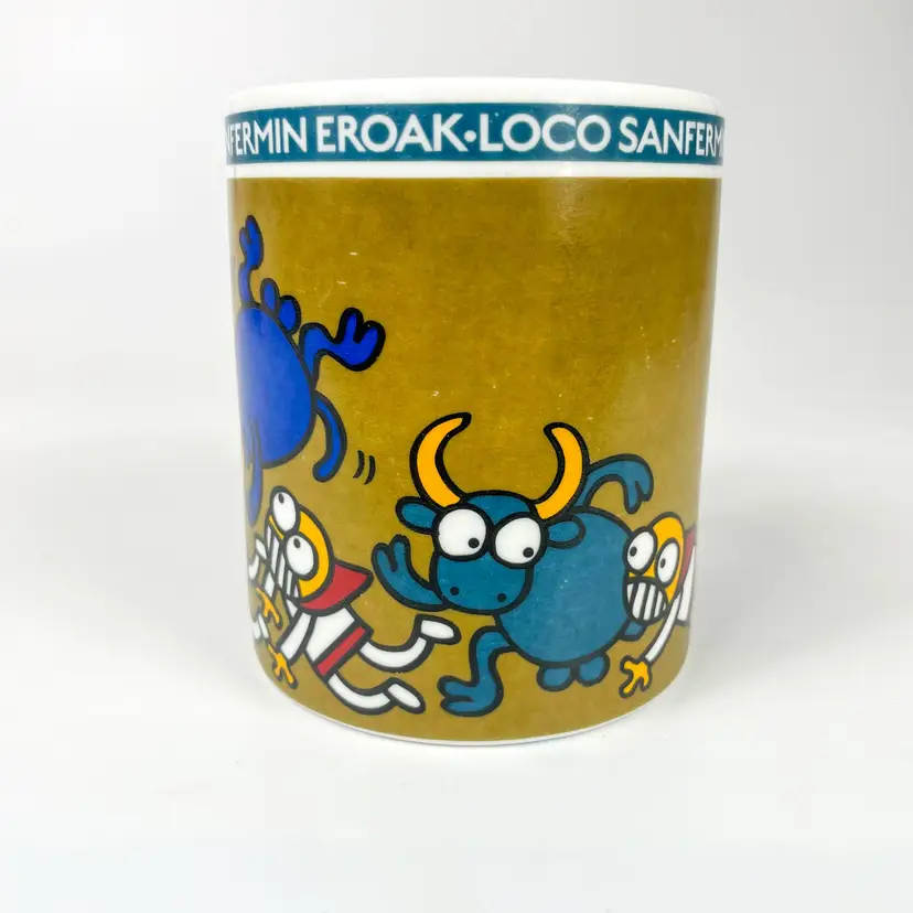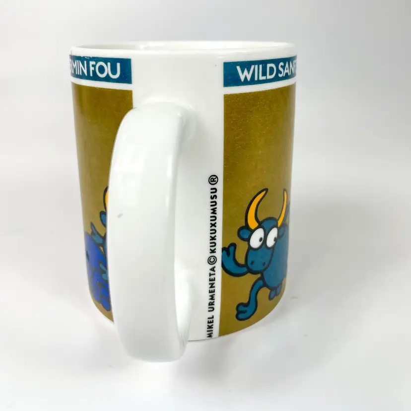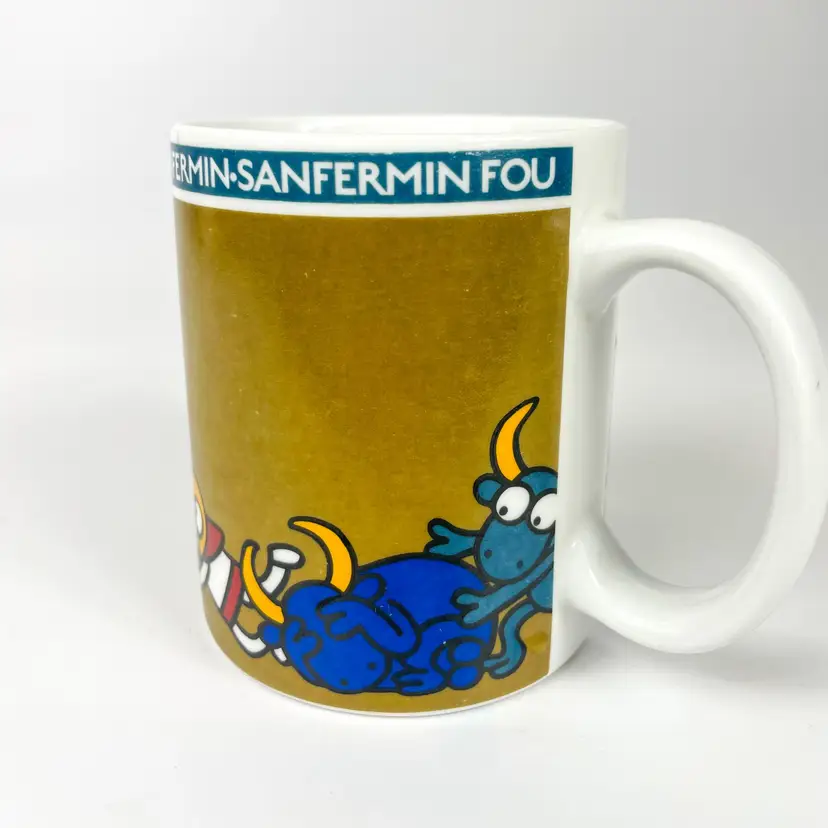 Colorful mug featuring playful bull and character design, ideal for coffee or tea enthusiasts. Durable ceramic build offers long-lasting use.