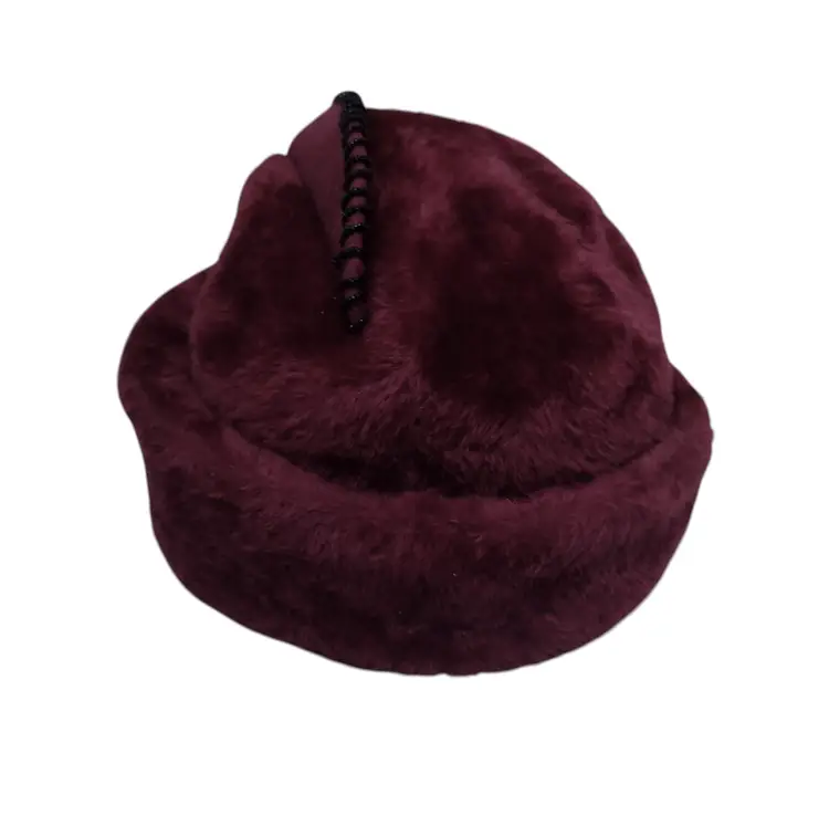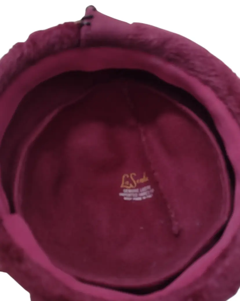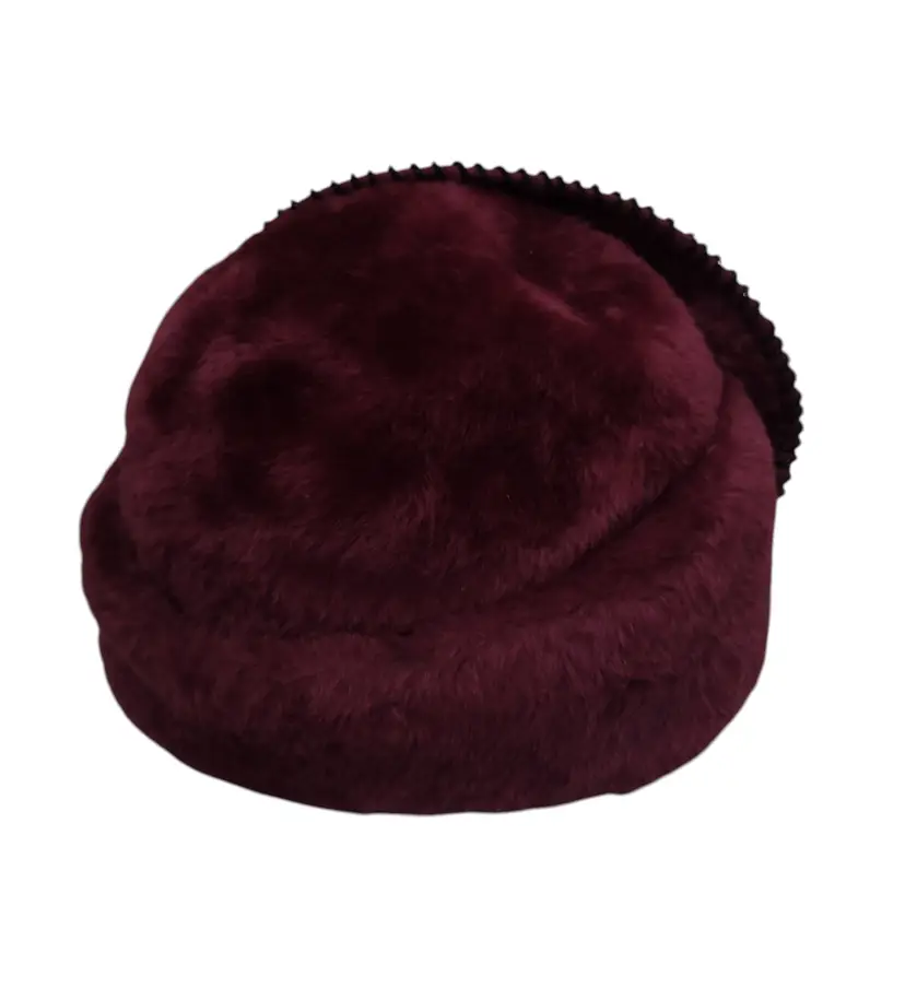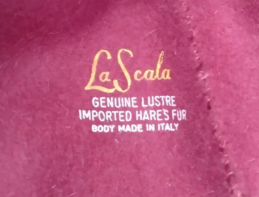 This is a very pretty shade of burgundy with imported materials & made in Italy. There is a perfect touch of raised black beading. Hat interior length measures 8" x width measures 8". Heighth of hat measures 6".