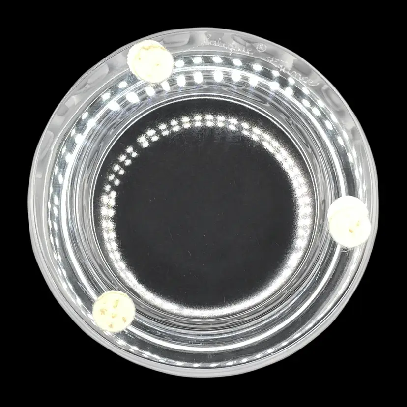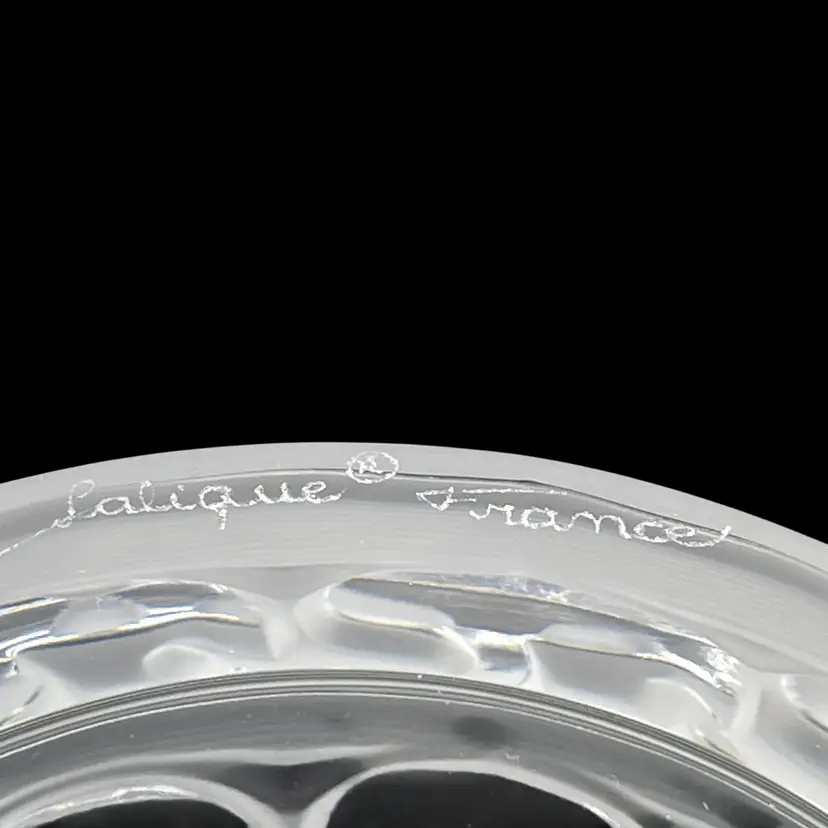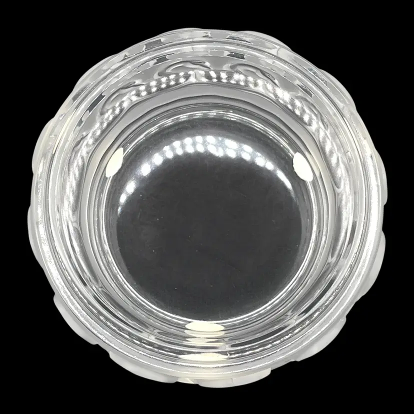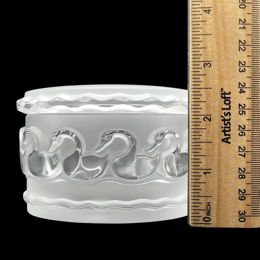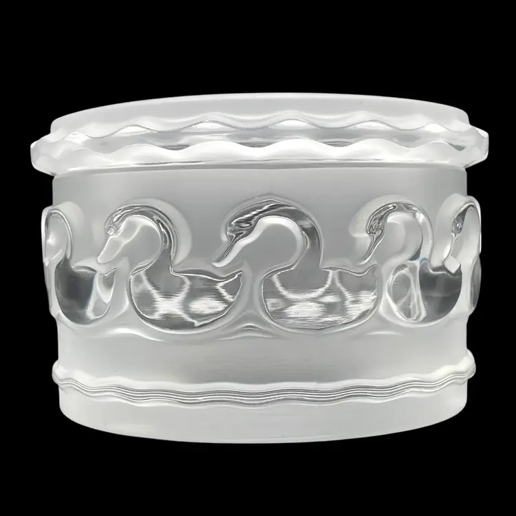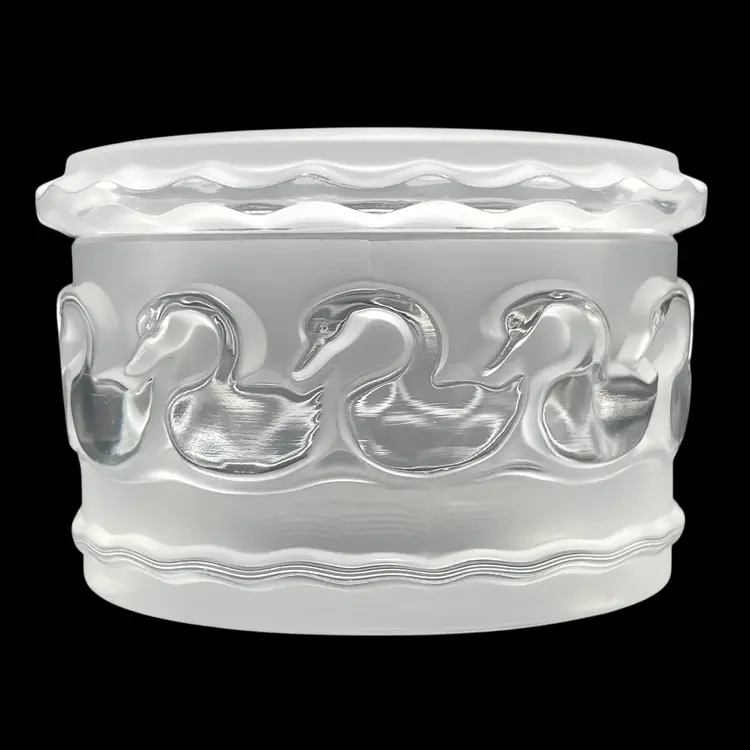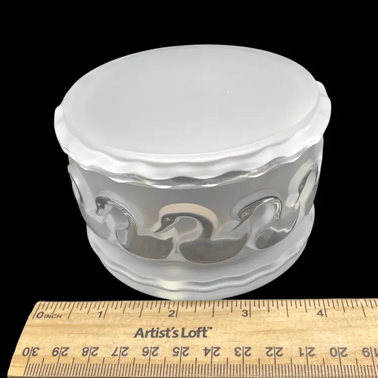 The VTG Lalique France Frosted Crystal Canard Swan Circle Trinket Dresser Box is a beautiful and decorative piece made of clear and frosted crystal. It features a round shape with a diameter of 4 inches and a height of 2.5 inches. The box is signed by the renowned brand Lalique, indicating its original production in France. With an Art Glass production style and an acid etched signature, this trinket box is a charming addition to any collection, perfect for storing jewelry or other small treasures. The canards or swans design adds a touch of elegance, making it a versatile piece for any decor.