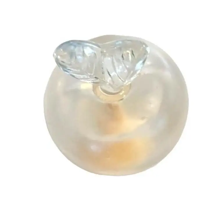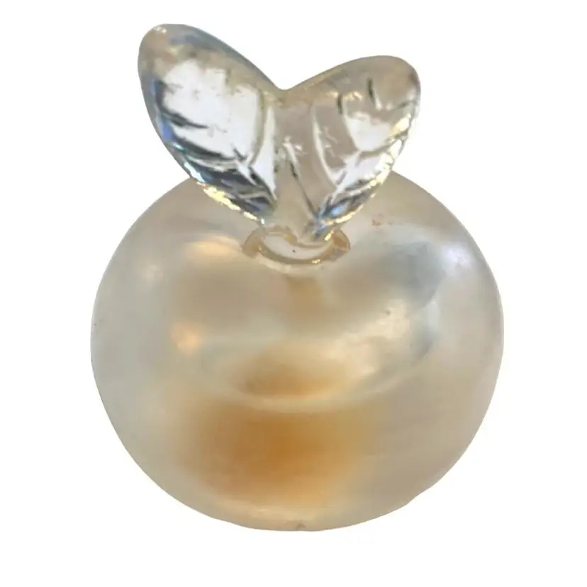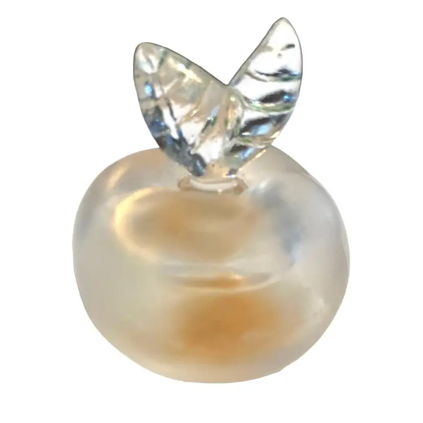 This charming small Lalique crystal perfume bottle has a frosted apple shaped body with clear figural leaf stopper. The bottle is signed on the bottom "Nina Ricci" and "Bottle made by Lalique France". The bottle originally was introduced in 1952 and held the Nina Ricci fragrance "Fille d'Eve".