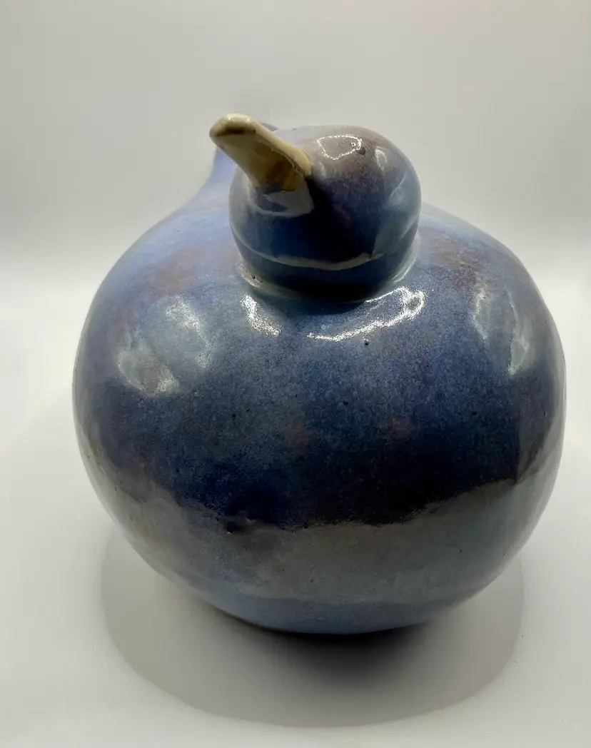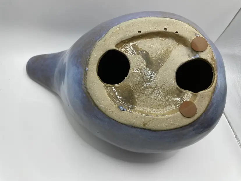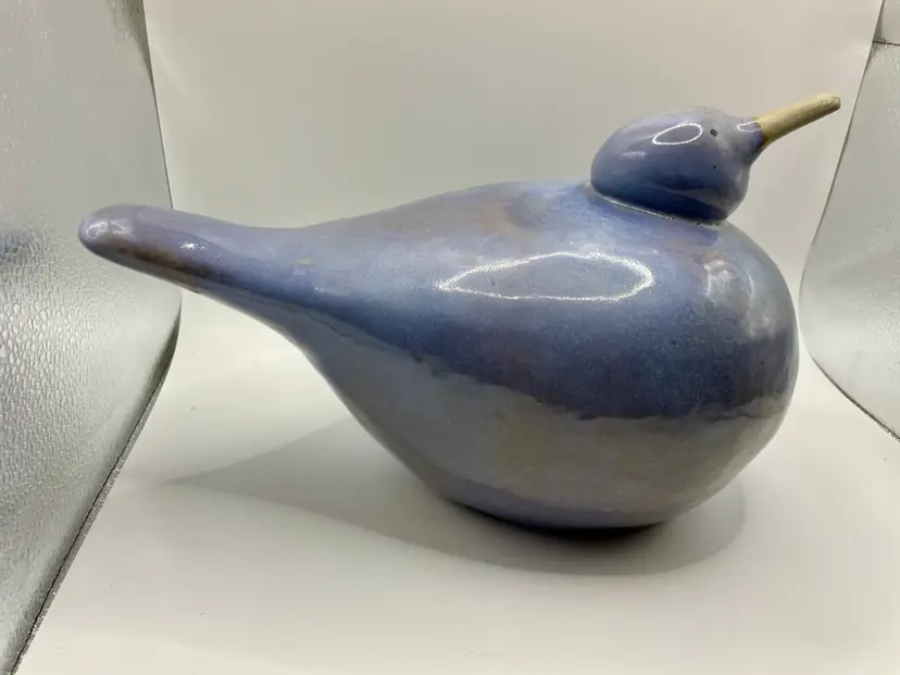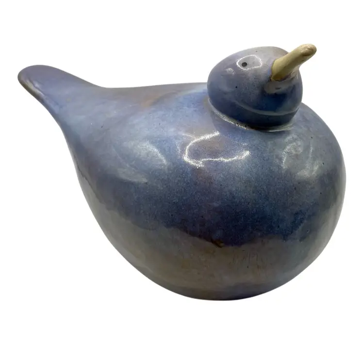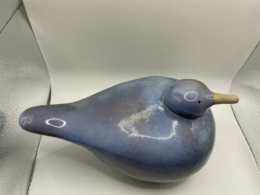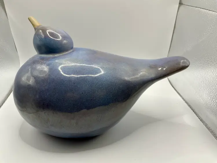 This VTG Large Art Pottery Blue Glaze Bird Sculpture features a beautiful blue ceramic bird figurine with a glossy finish, standing at 11" in length and 8" in height. The coastal farmhouse style sculpture captures the essence of beach and bird themes, showcasing a unique art pottery production technique. The Bluebird Beach Coastal design adds a touch of elegance to any space, making it a perfect addition to any home decor collection.