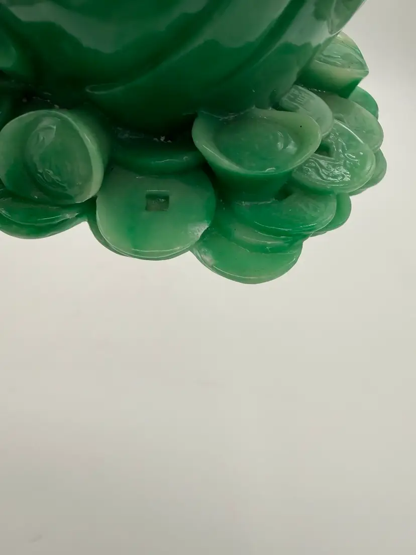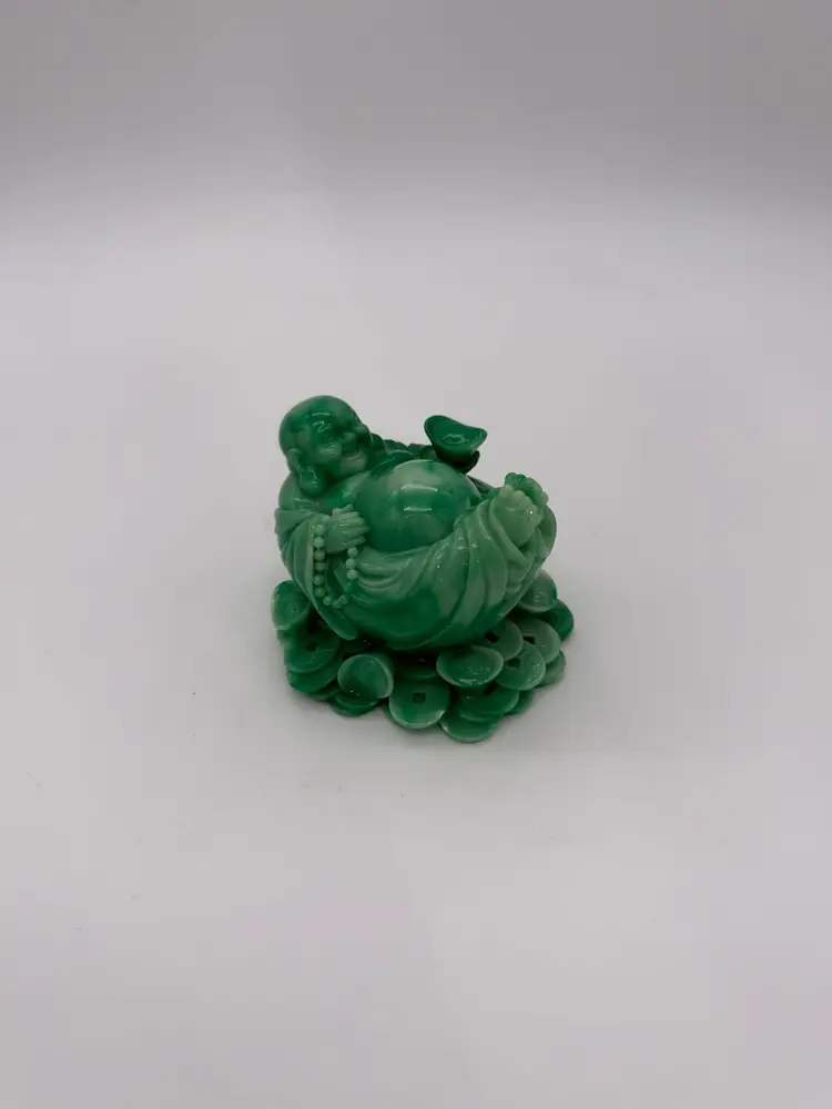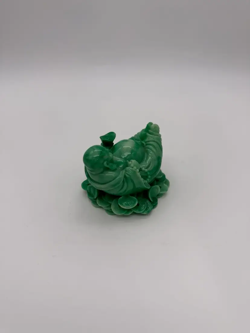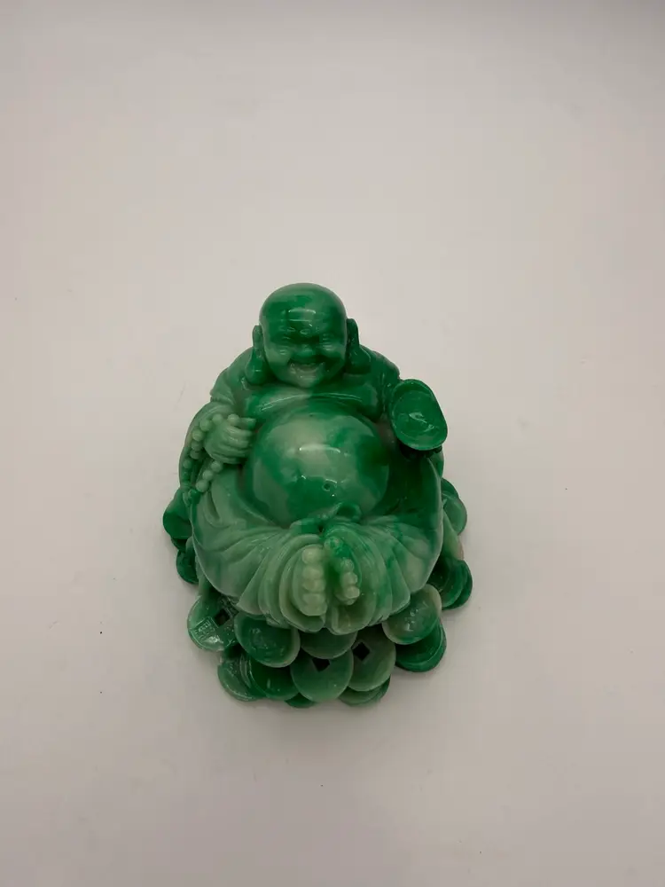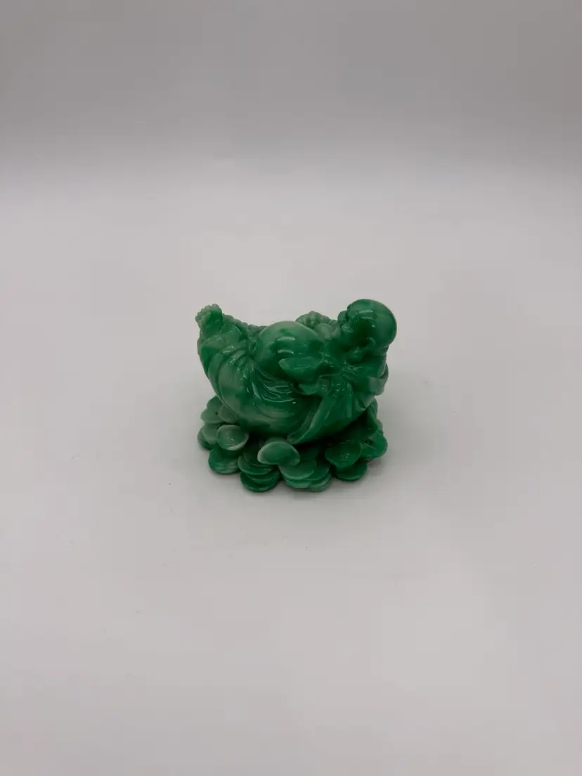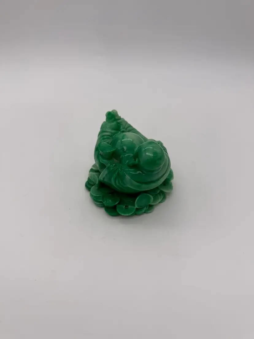 This 4” X 3” vintage figurine paperweight depicts a laughing Buddha resting on a symbol of good fortune, showcasing a unique and charming design inspired by Buddhism. Originating from China, this collectible piece combines religious symbolism with intricate craftsmanship, making it a meaningful and visually appealing addition to any collection. Perfect for those interested in religion and spirituality, this figurine paperweight offers a touch of tranquility and positive energy to any space. In very good condition, does have a few very small flea bites on the bottom edge. See pictures for details.
