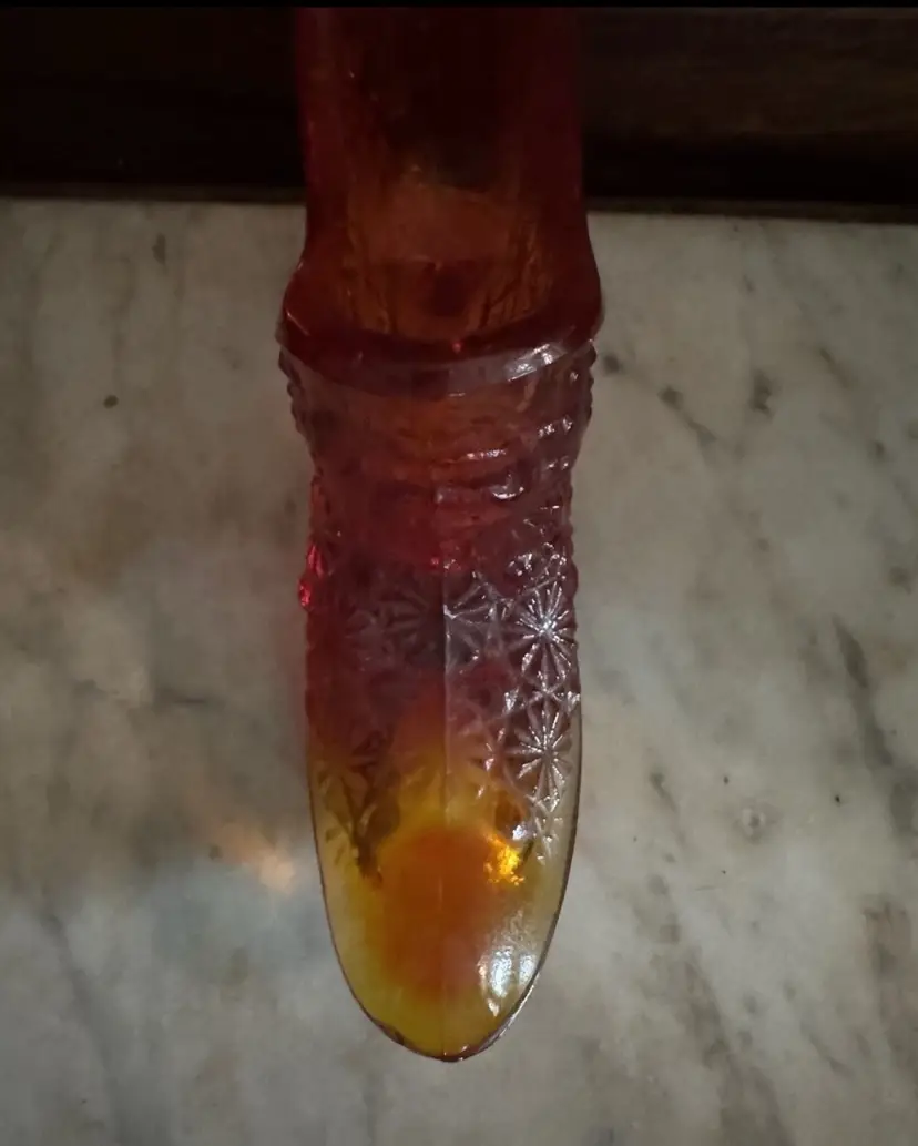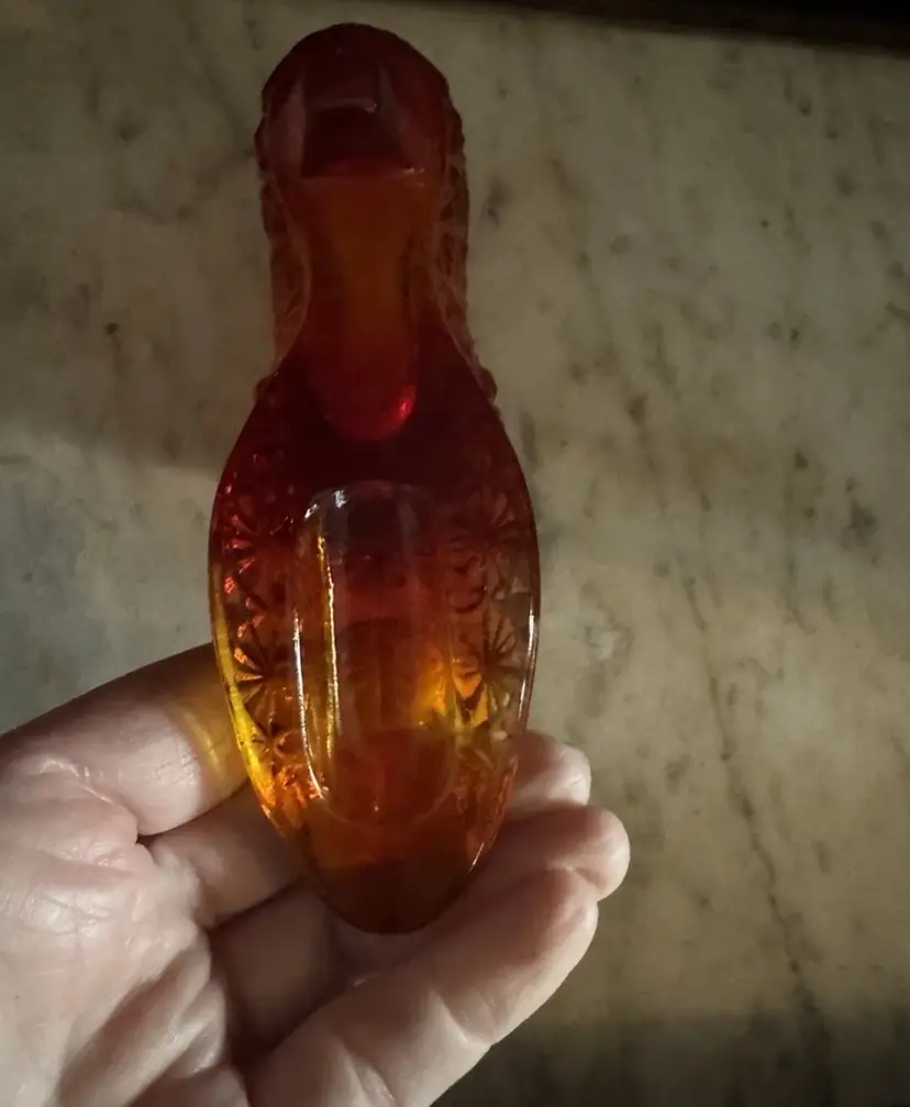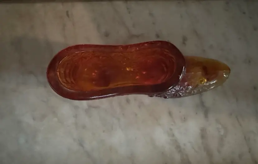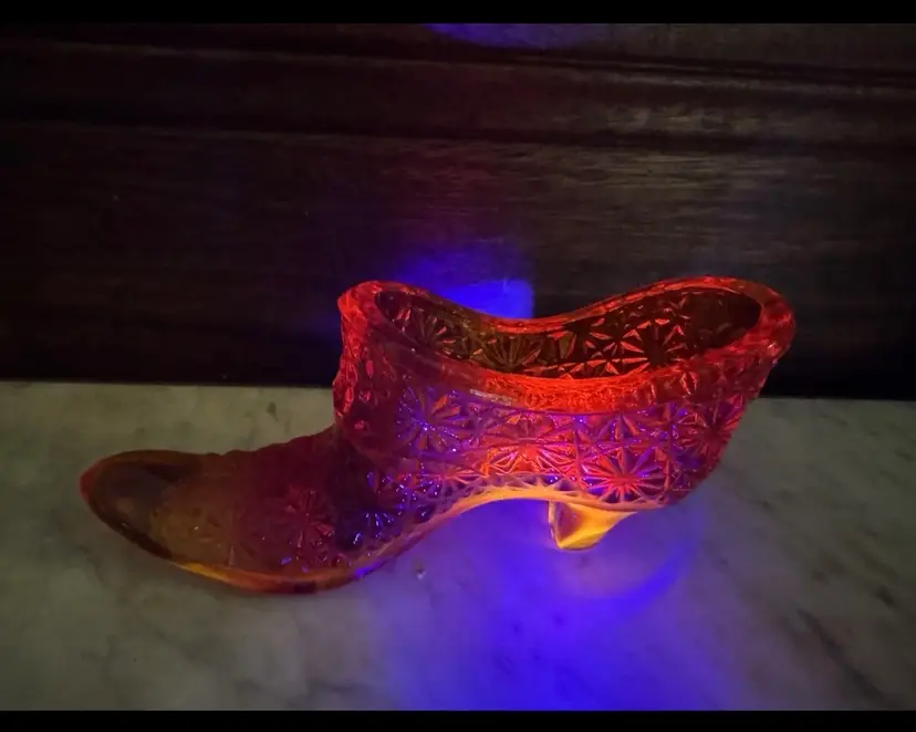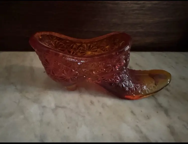This vintage LE Smith Art Glass figurine features a red and yellow amberina shoe with a daisy and button pattern. Measuring 6 inches in length, 2.5 inches in height, and 1.75 inches in width, this handmade shoe is an original piece from the United States. The production style and technique is art glass, and it is UV reactive.