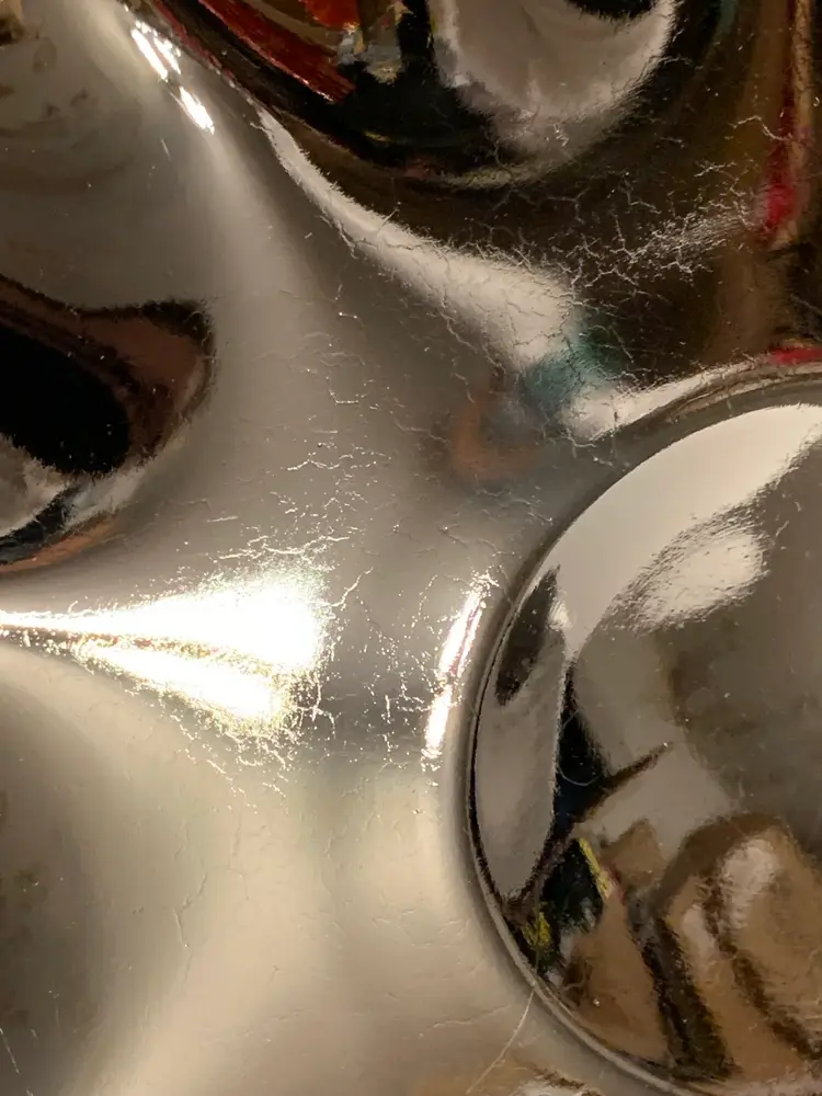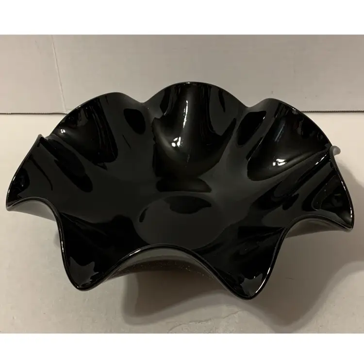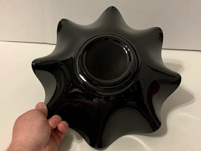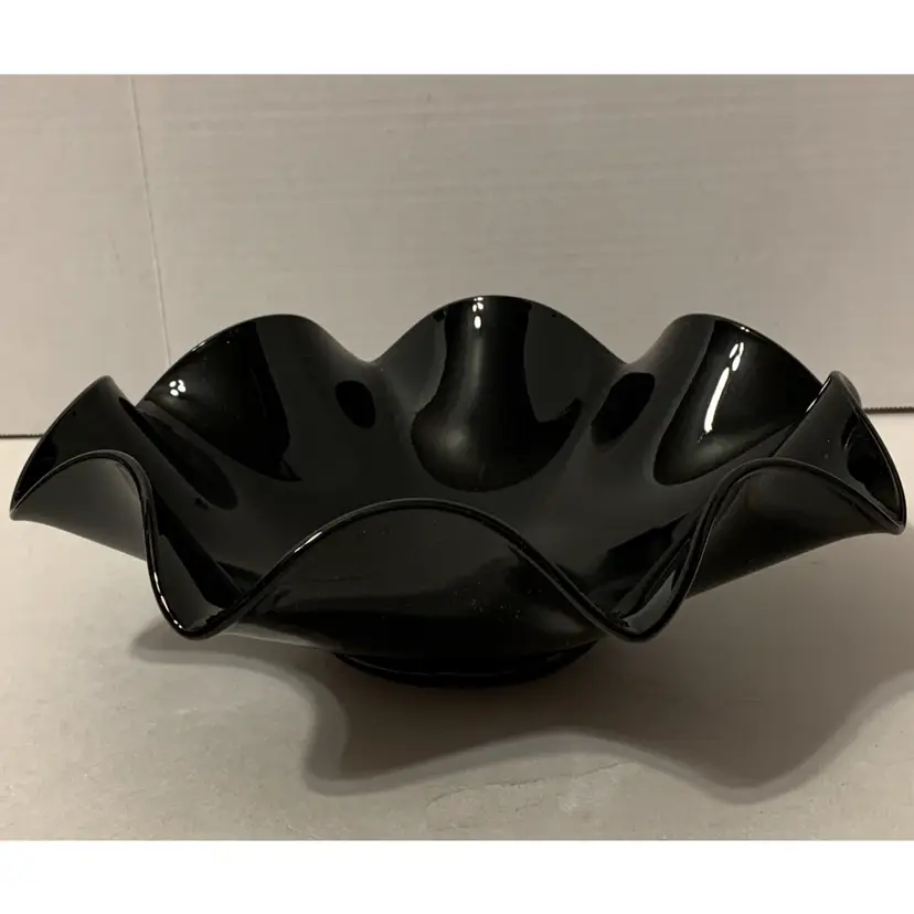Really nice piece of classic black amethyst glass. Simple, ruffled edges with a light crackling inside the bowl. It is 11.25” in diameter and 3.5” tall. The bowl has some surface scratching and wear, but there are no cracks or chips!