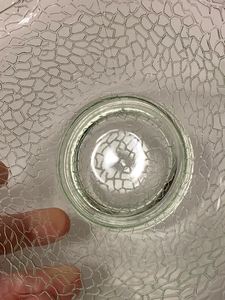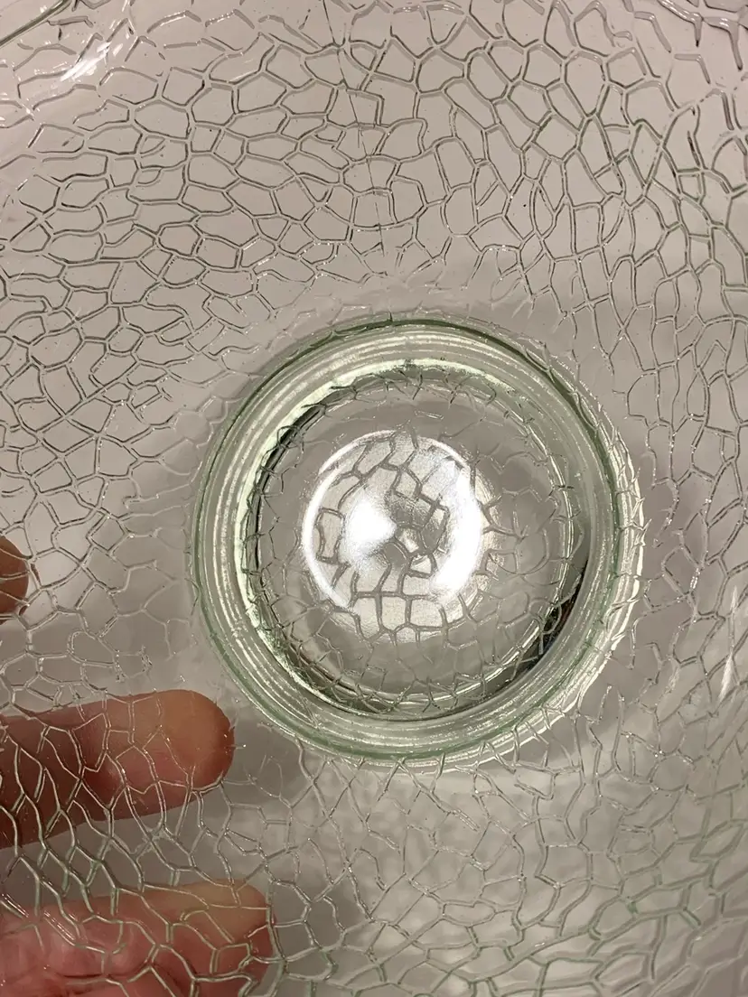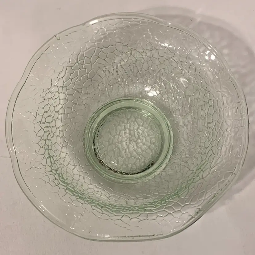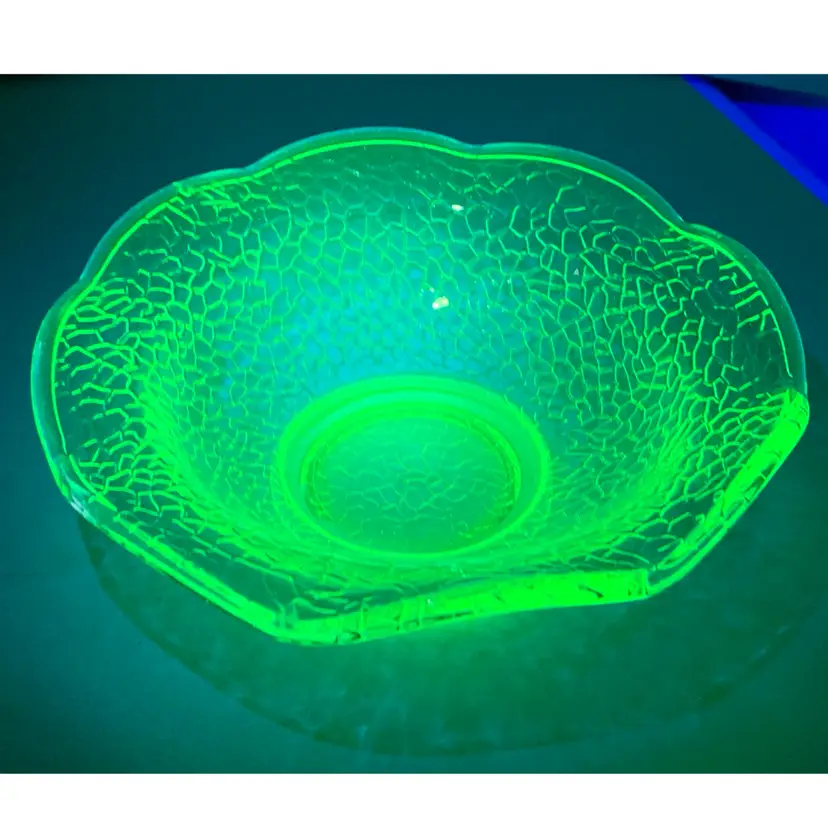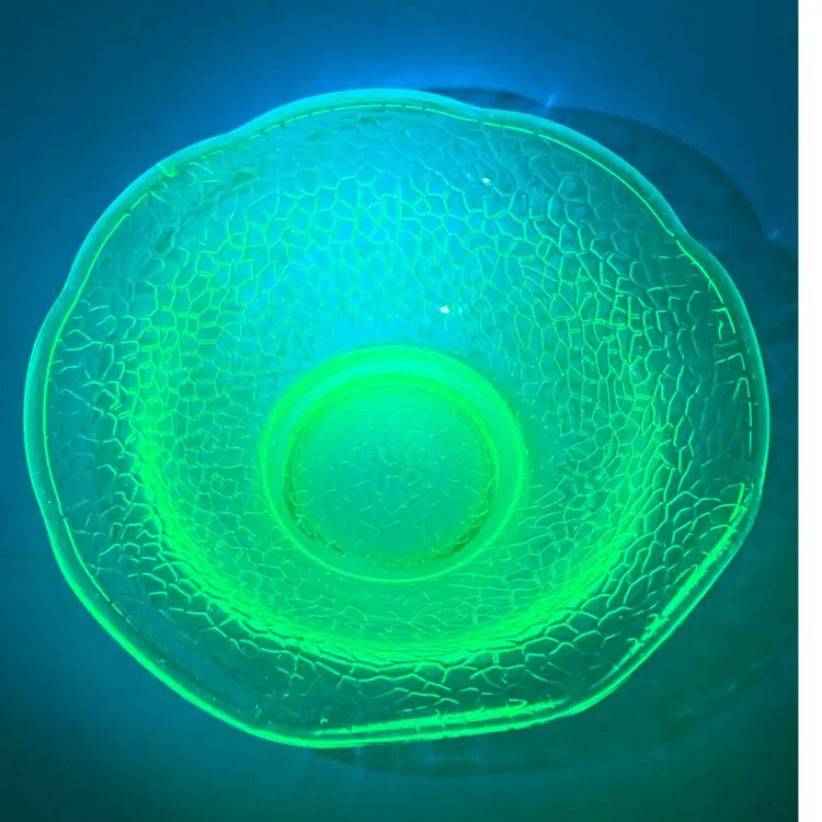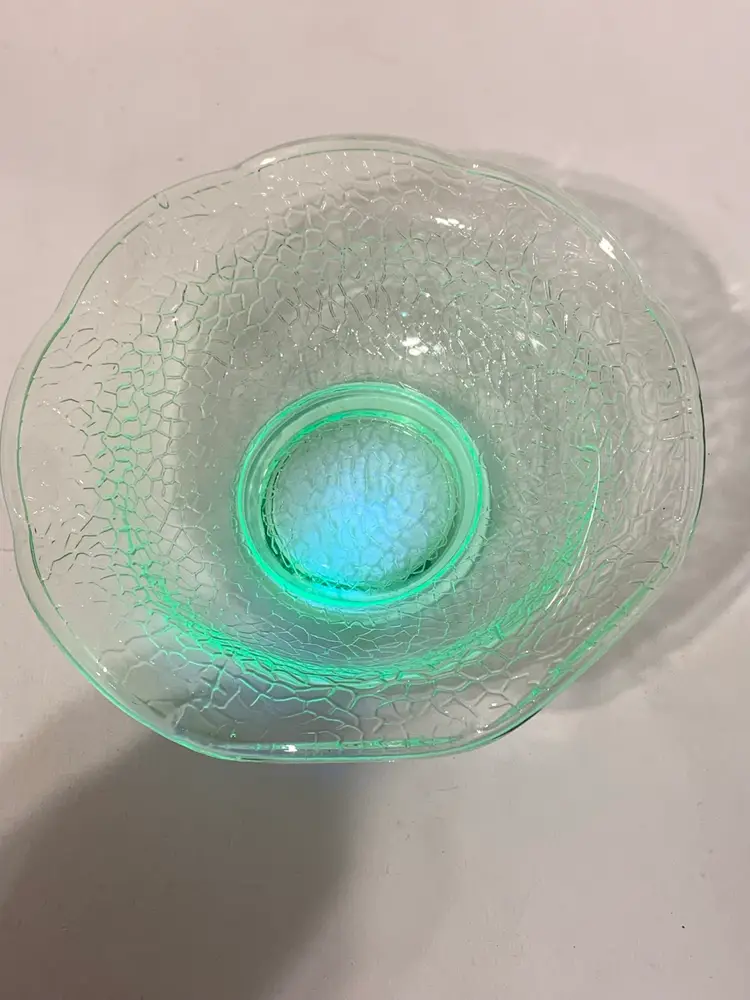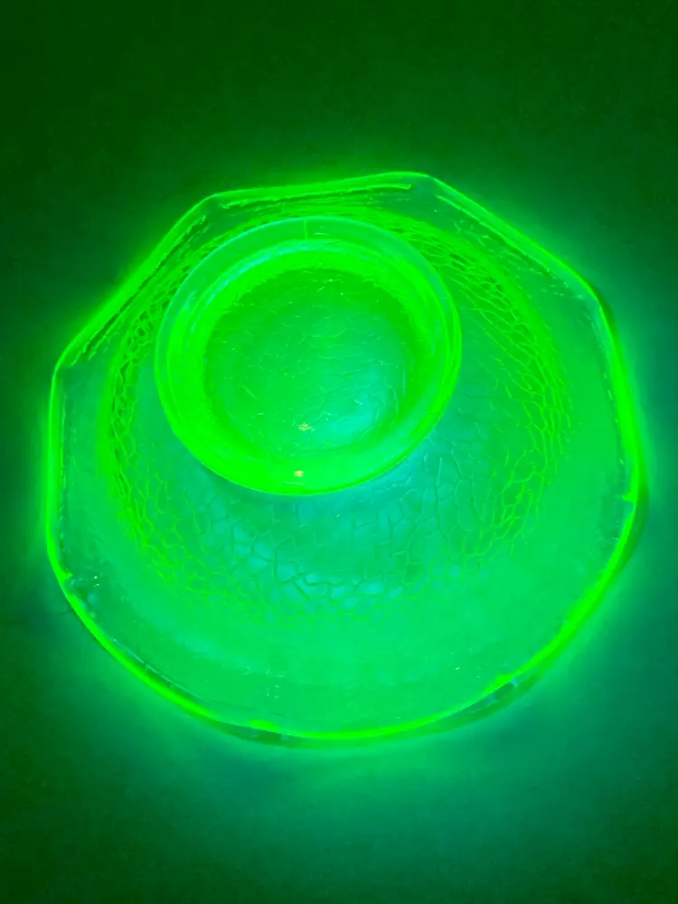 Great condition, free from cracks or chips. Muted green color in regular light, but has a nice, strong glow in black light. 7” in diameter