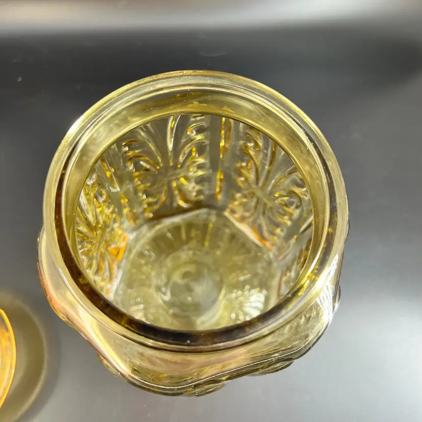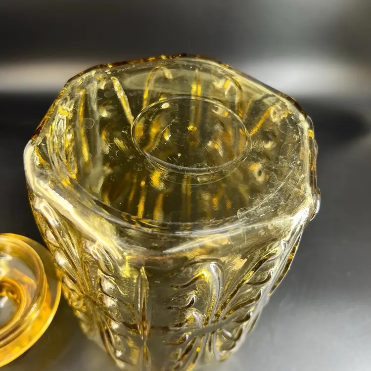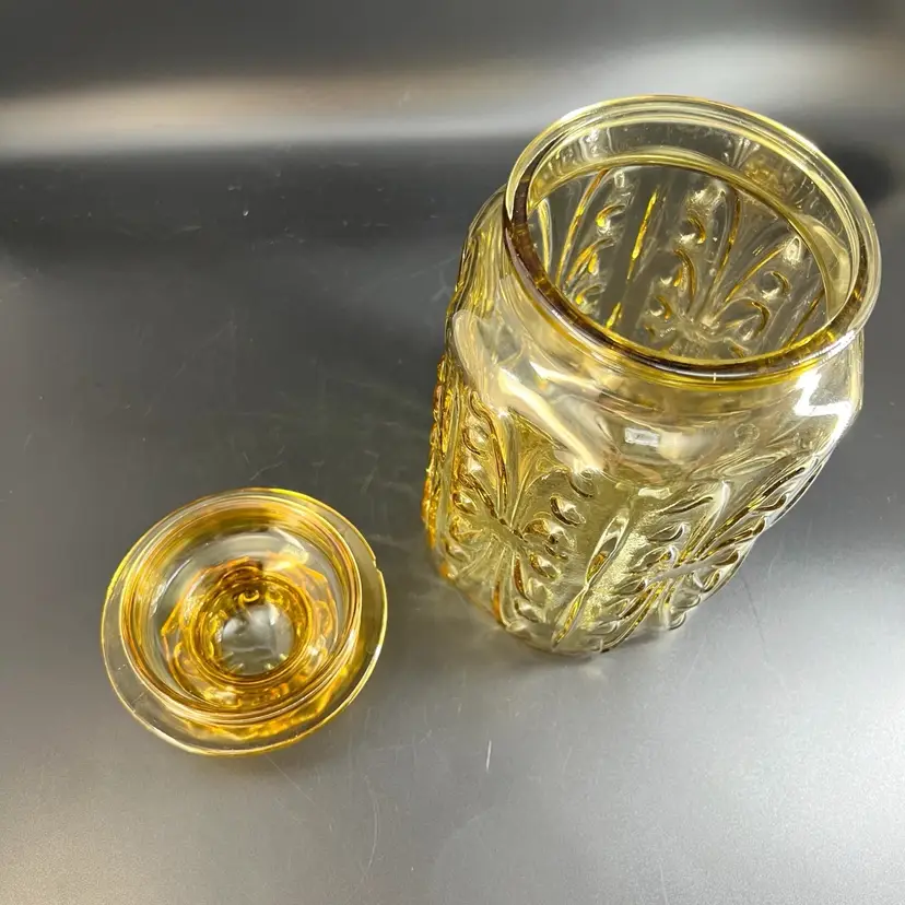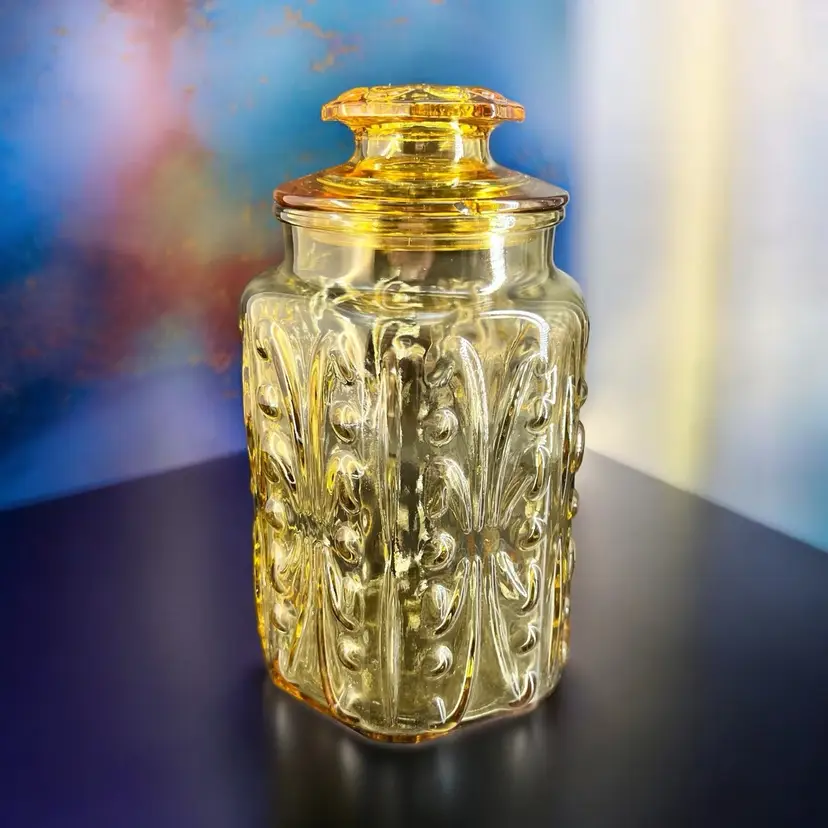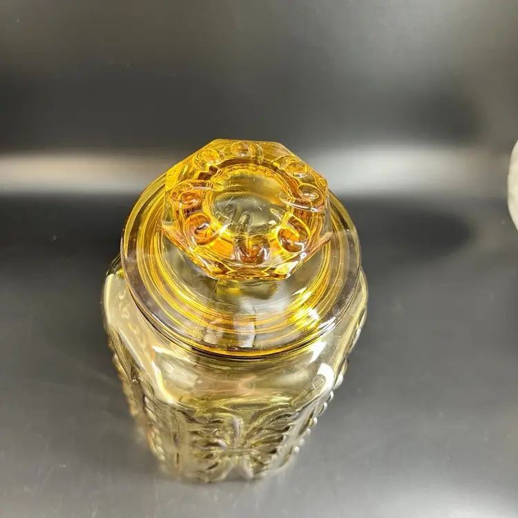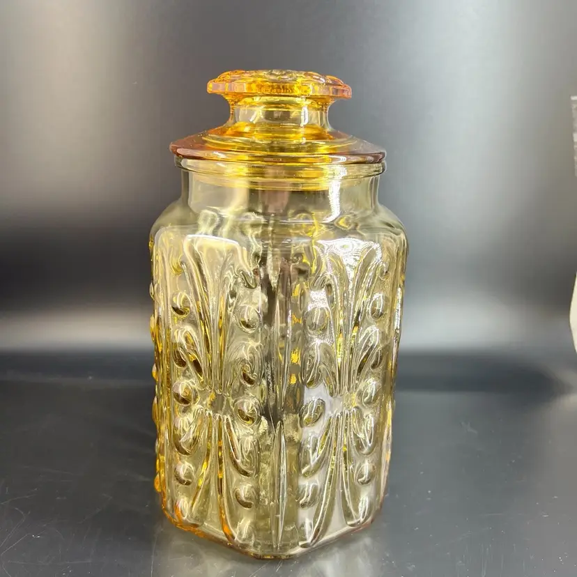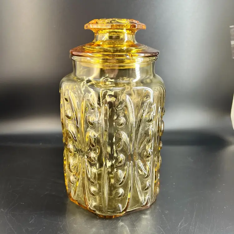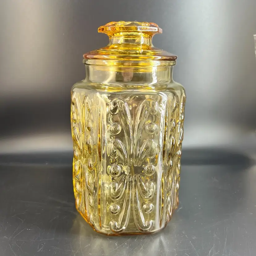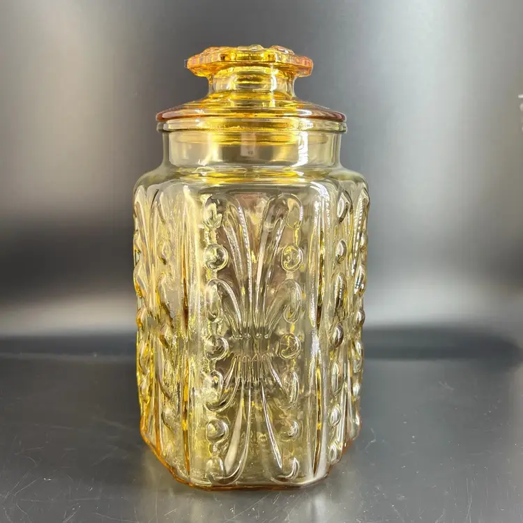 This vintage LE Smith Imperial Atterbury Scroll canister jar is a beautiful addition to any kitchen. With a stunning amber yellow color and intricate scroll pattern, it is sure to catch the eye of any collector. The jar is made of high-quality glass and has a sets-on lid type, making it easy to access and keep your food fresh.