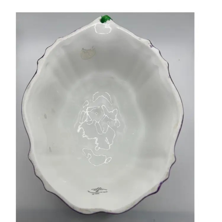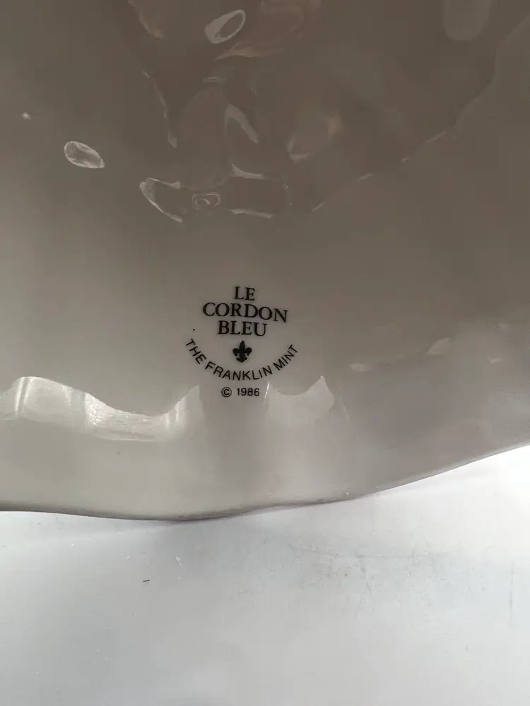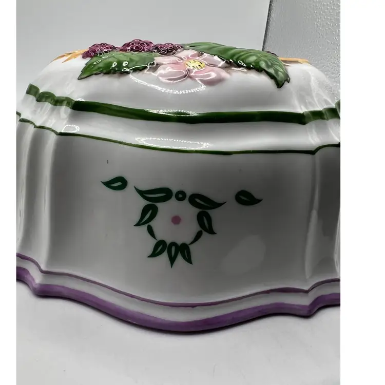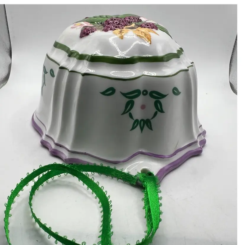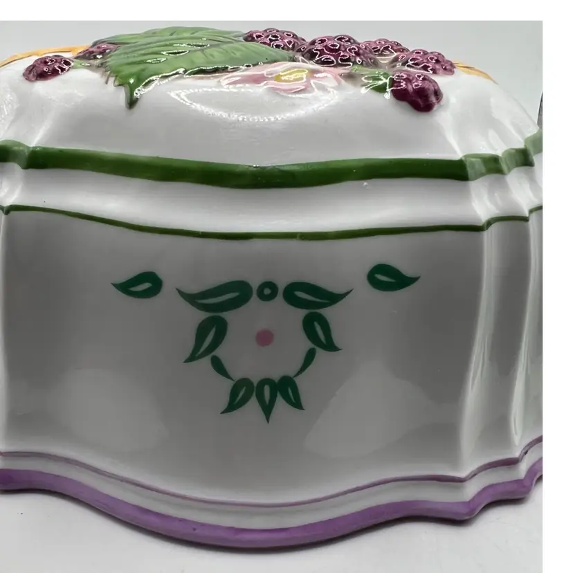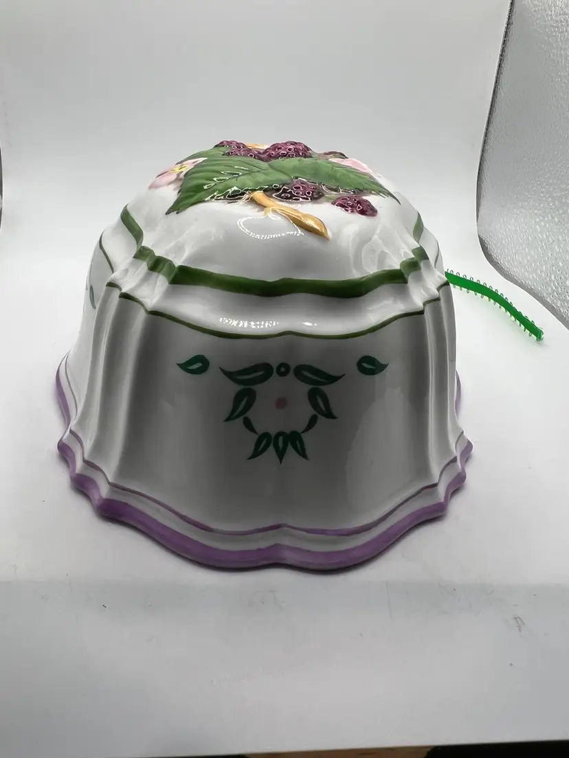Measures 7” from top to bottom, 6” across and 3” deep. At the top the tip has a hole in it that has a green ribbon in it. The top is covered and painted with a raspberry plant in a 3D effect, the four sides have some greenery with a pink dot in the middle Inside marked “LeCORDON BLEU ⚜️The Franklin Mimi ©️1986”