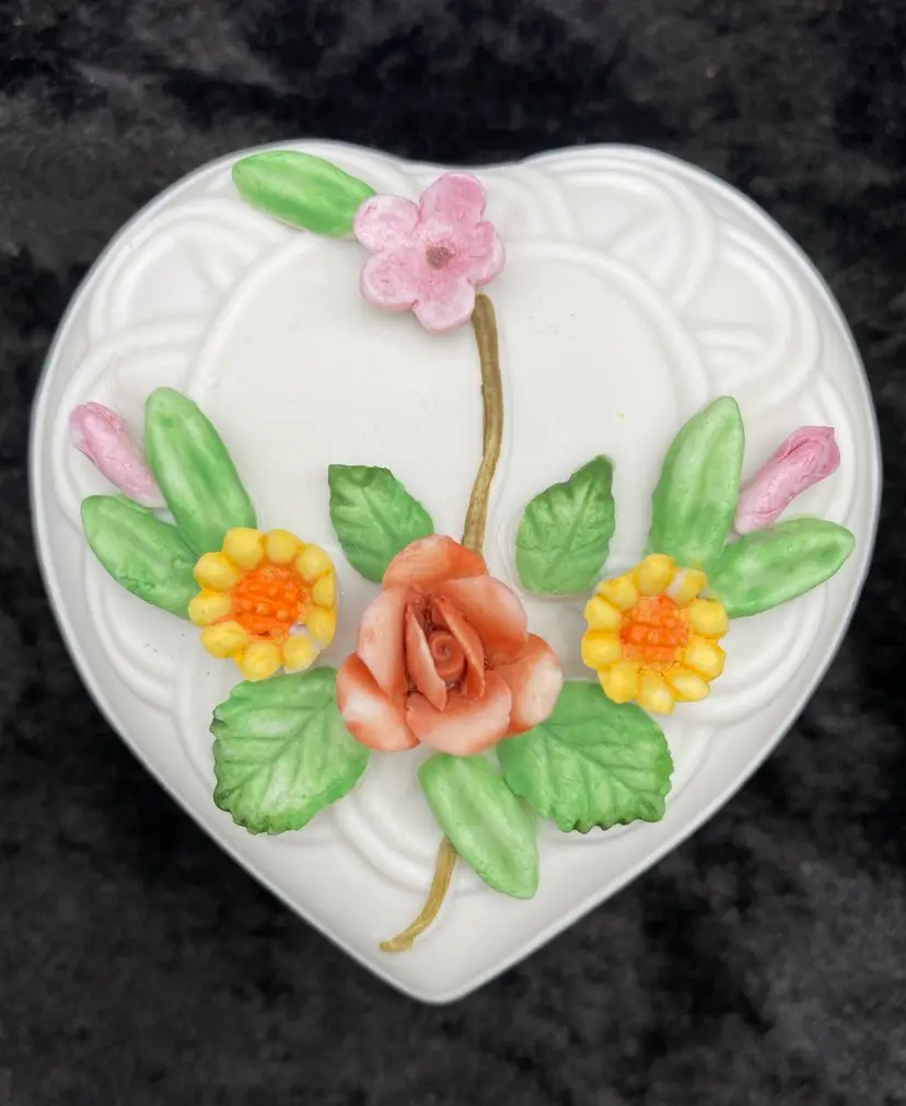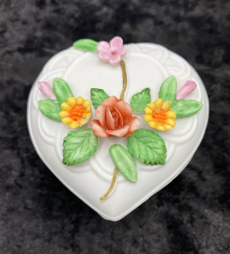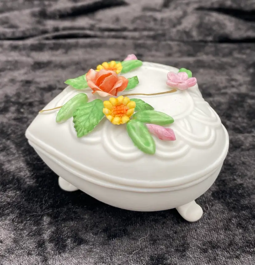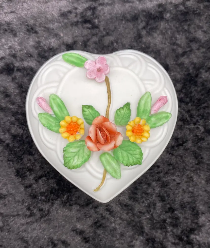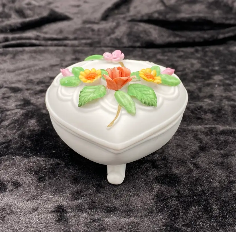 This beautiful porcelain trinket box from Lefton is the perfect addition to any collection. The heart-shaped box has a sculpted design of intertwining loops serving as a backdrop for hand-painted porcelain flowers on the lid. The box is three-footed for added elegance. Measuring 3.1 inches in length, 2.9 inches in width, and 2 inches in height, this box is the perfect size for keeping your small trinkets and keepsakes safe. The box is in mint condition and has been well cared for over the years. The original mark and sticker are on the bottom.