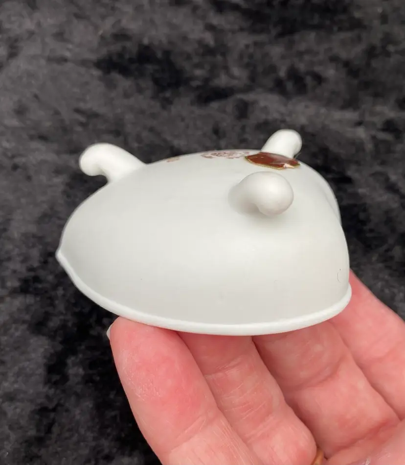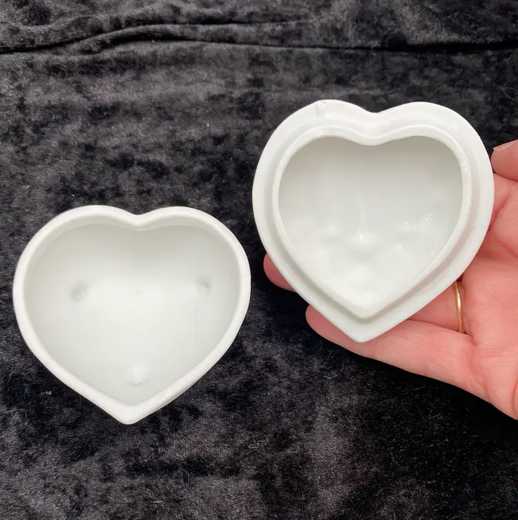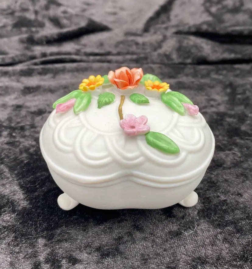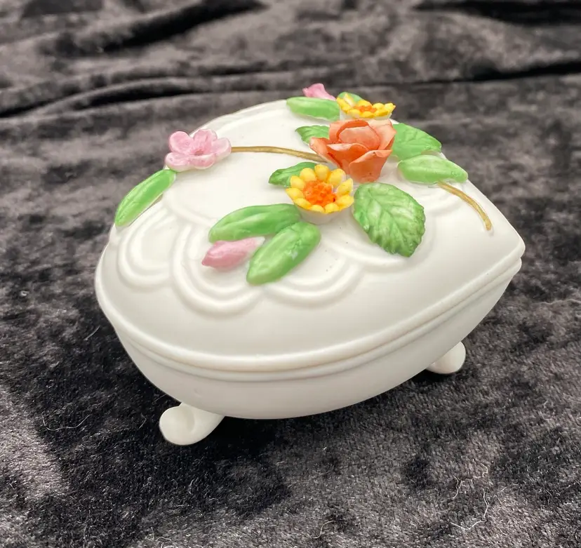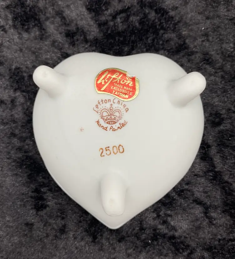 This beautiful porcelain trinket box from Lefton is the perfect addition to any collection. The heart-shaped box has a sculpted design of intertwining loops serving as a backdrop for hand-painted porcelain flowers on the lid. The box is three-footed for added elegance. Measuring 3.1 inches in length, 2.9 inches in width, and 2 inches in height, this box is the perfect size for keeping your small trinkets and keepsakes safe. The box is in mint condition and has been well cared for over the years. The original mark and sticker are on the bottom.