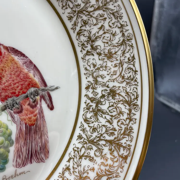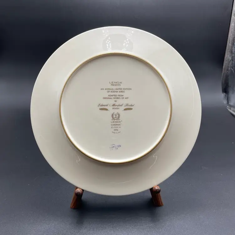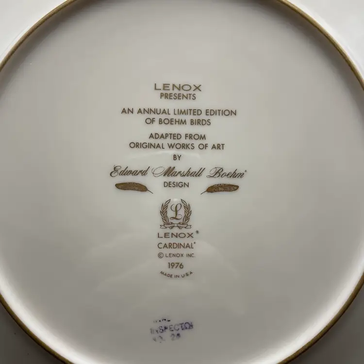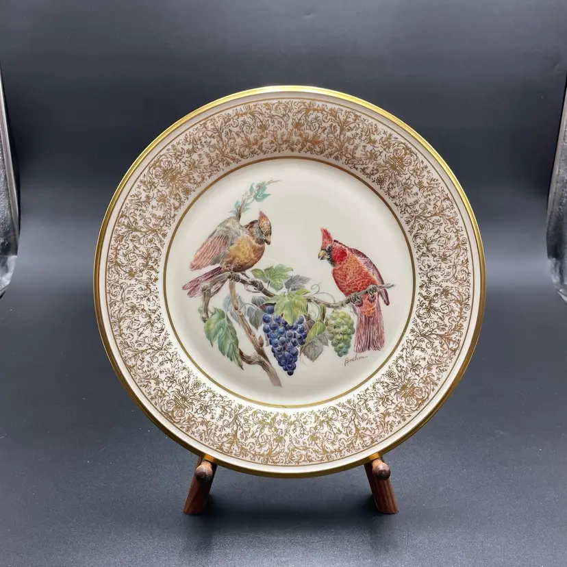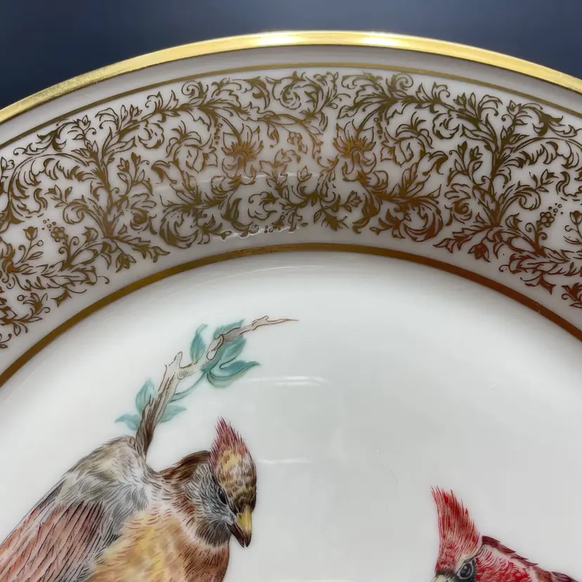 This is a vintage 1976 Lenox annual limited edition plate featuring a cardinals couple. Adapted from original works of art created by Edward Boehm. Made in USA. Measures 10.5" across, and is heavily decorated with 24K gold, not only the patterned and edged front, but also the back edge and inscription. No chips, cracks, or crazing. #HC2