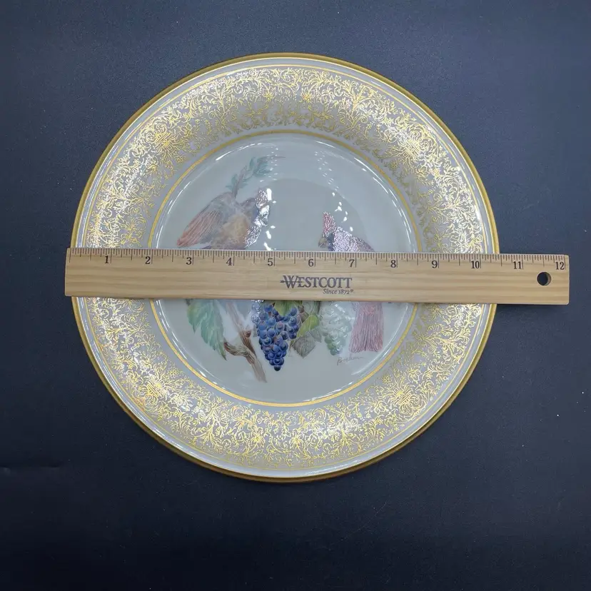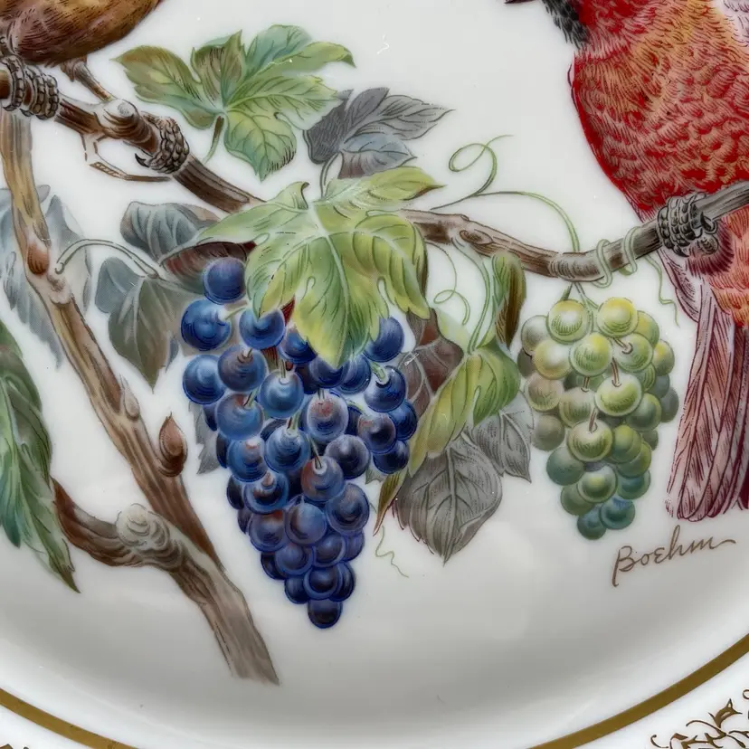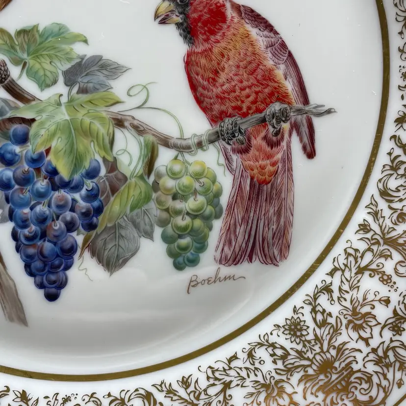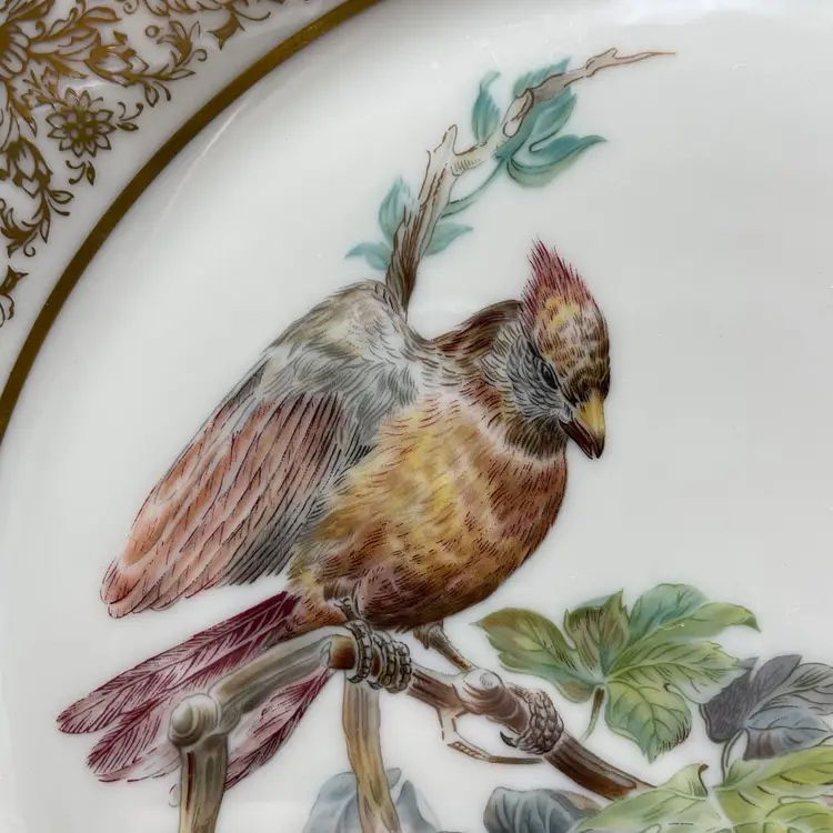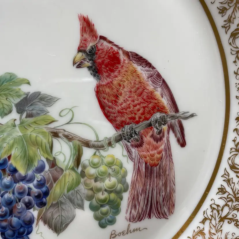 This is a vintage 1976 Lenox annual limited edition plate featuring a cardinals couple. Adapted from original works of art created by Edward Boehm. Made in USA. Measures 10.5" across, and is heavily decorated with 24K gold, not only the patterned and edged front, but also the back edge and inscription. No chips, cracks, or crazing. #HC2