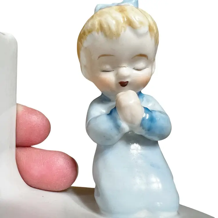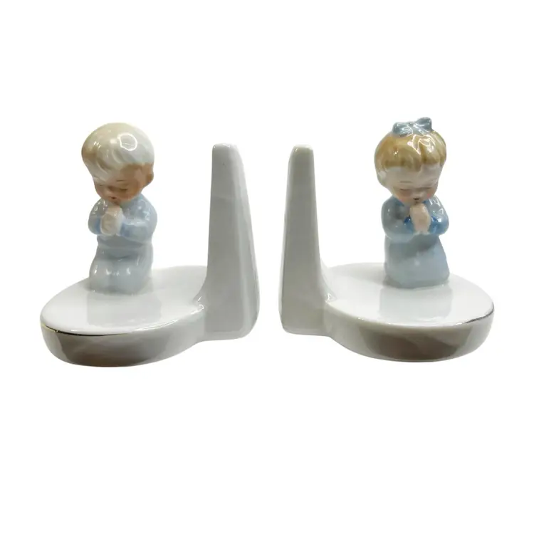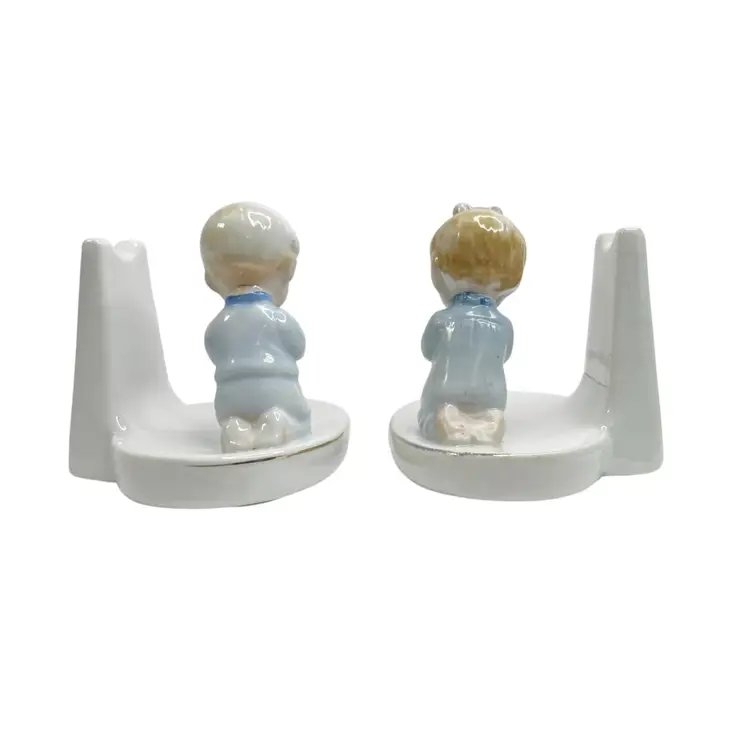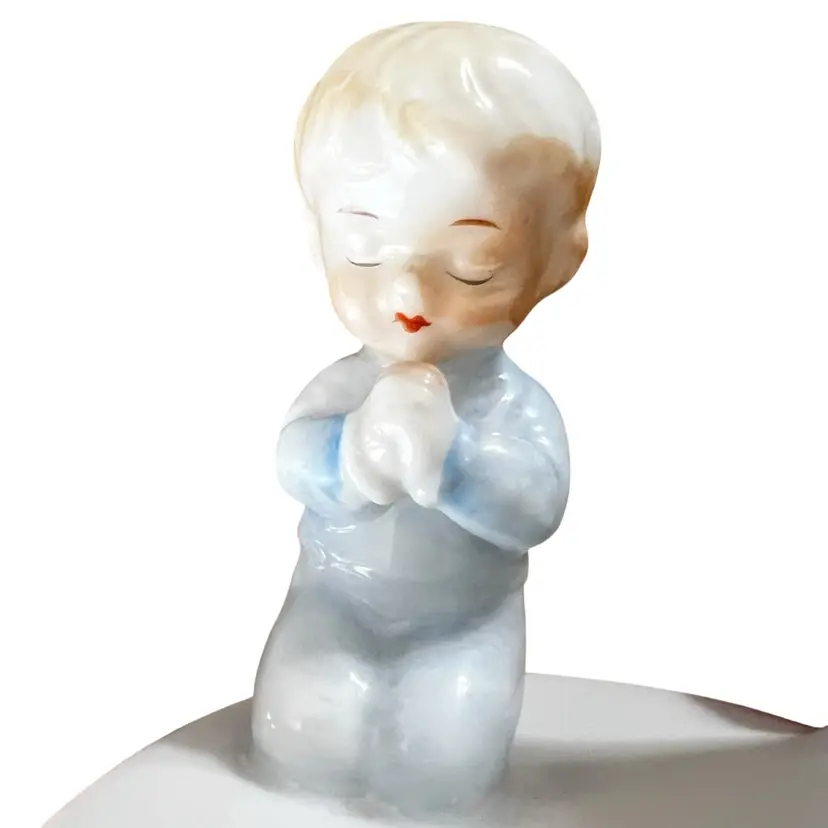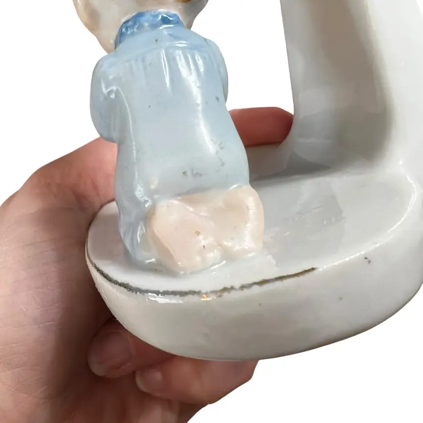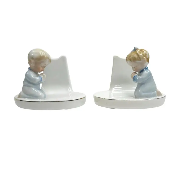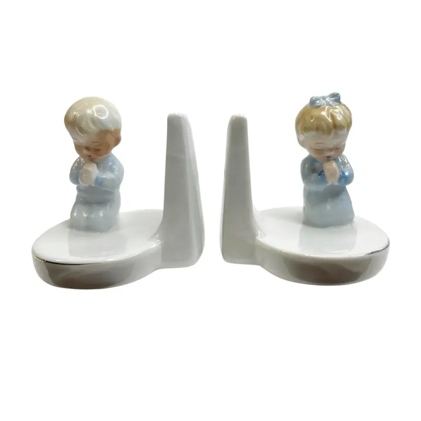 Pair of vintage Lipper & Mann boy & girl kneeling in prayer figurines. Originally there were large bibles that would sit on the little stand portion, but this is just the child figurines. Both are in blue nightgowns. There is some paint loss (more on the little boy), crack to the little girl’s bridge of her nose and a crack to the back of the little boy’s head. Porcelain with a glossy finish. Stamped “Bondware L & M” with a crown on the bottoms.
