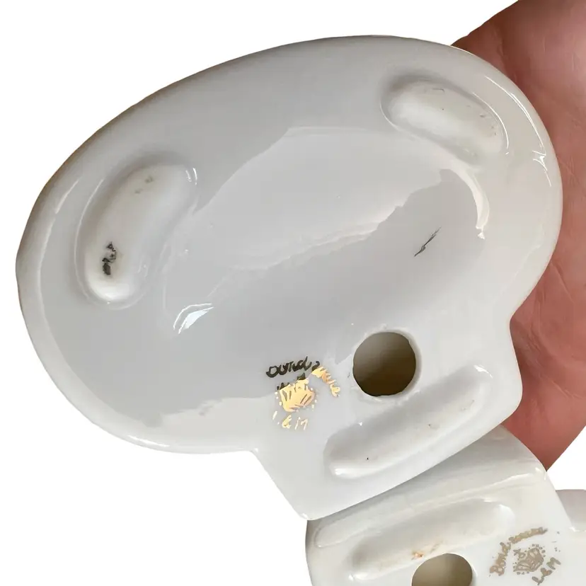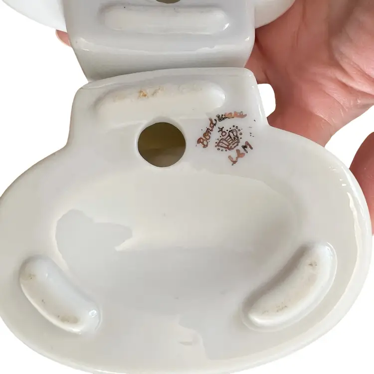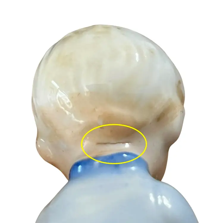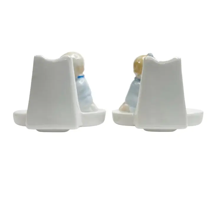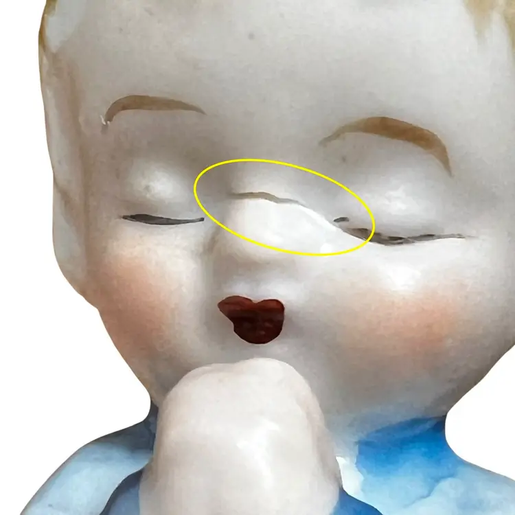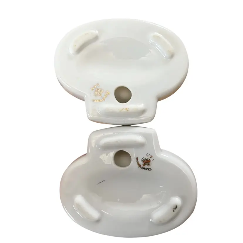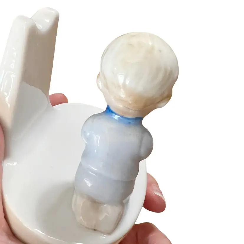 Pair of vintage Lipper & Mann boy & girl kneeling in prayer figurines. Originally there were large bibles that would sit on the little stand portion, but this is just the child figurines. Both are in blue nightgowns. There is some paint loss (more on the little boy), crack to the little girl’s bridge of her nose and a crack to the back of the little boy’s head. Porcelain with a glossy finish. Stamped “Bondware L & M” with a crown on the bottoms.