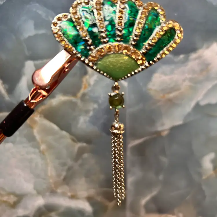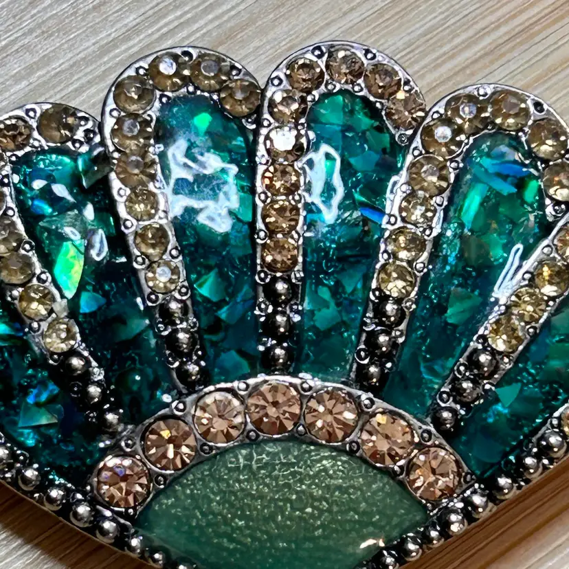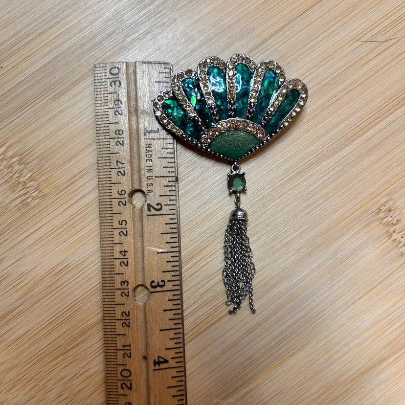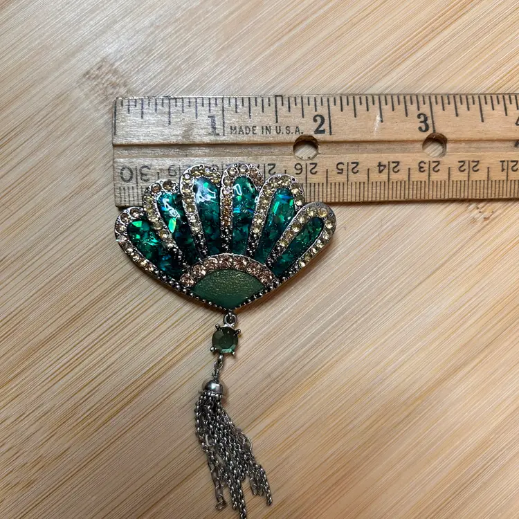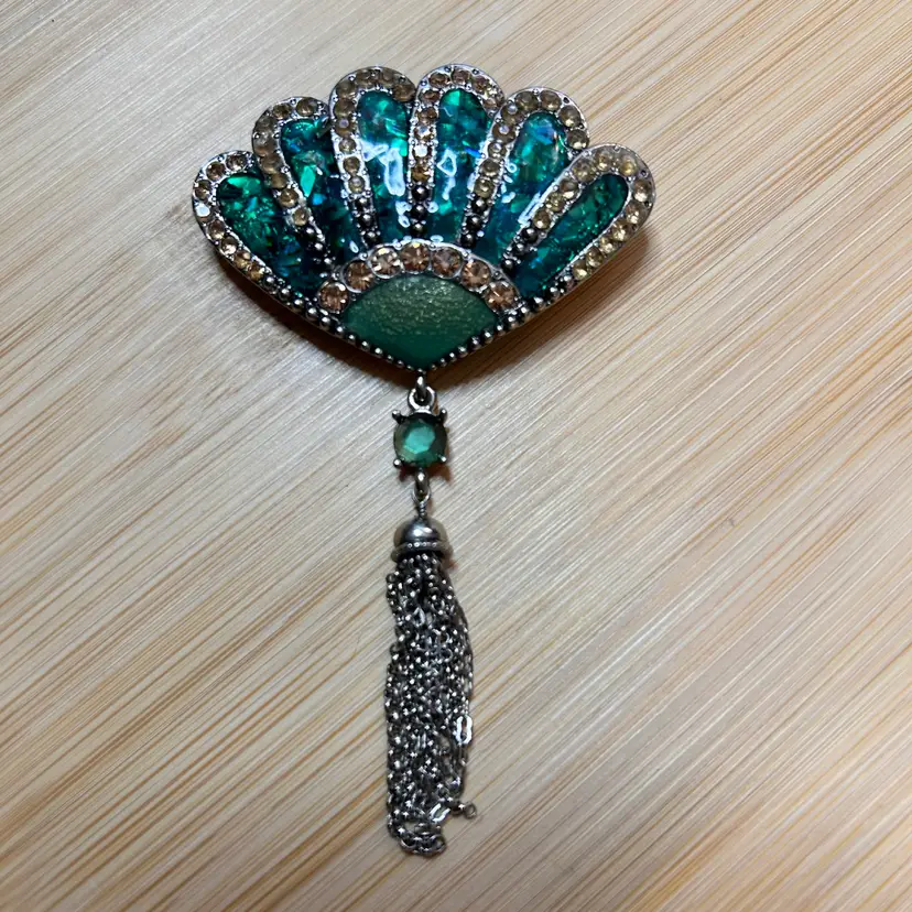 Liz Claiborne green enameled fan brooch with clear rhinestones and tassel. 3” X 2”