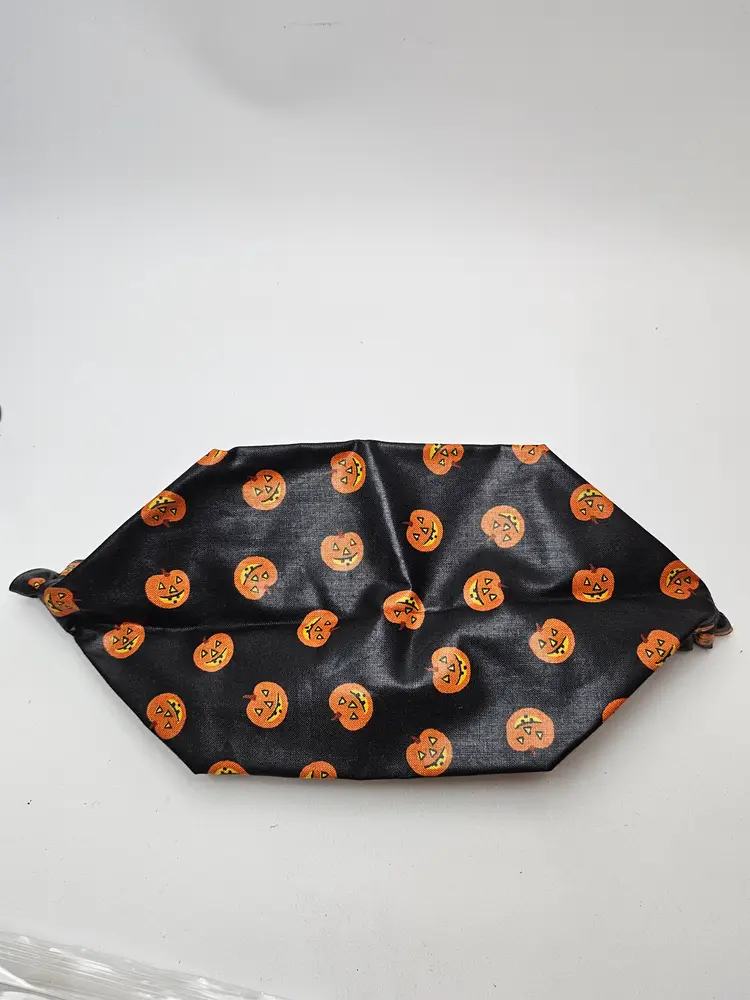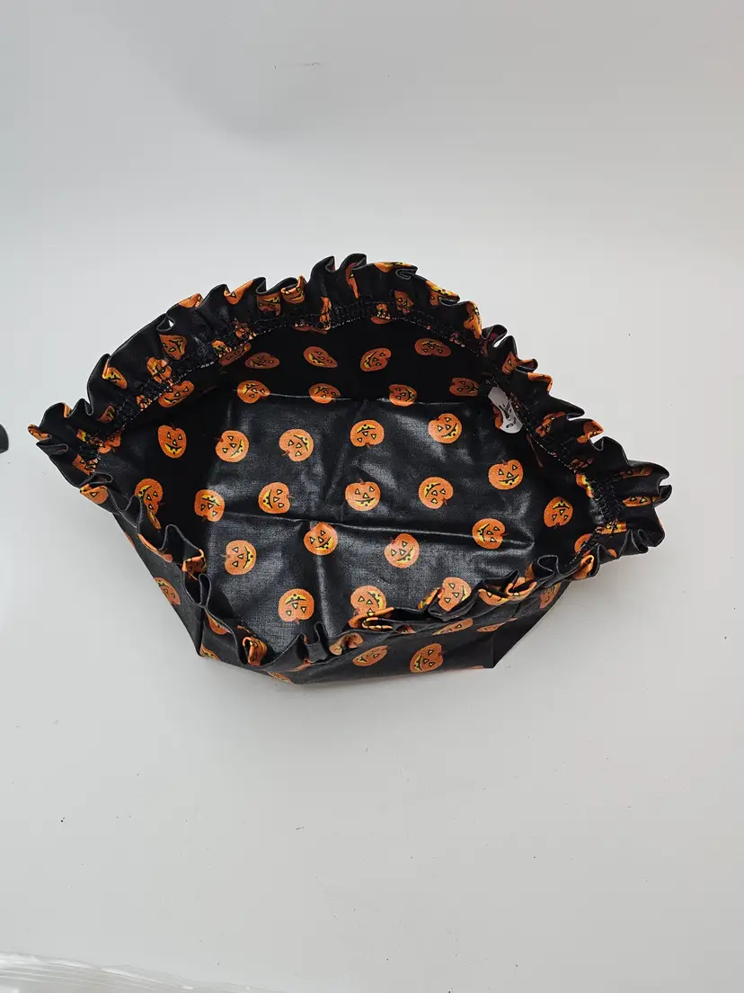 The product is a vintage Longaberger medium berry pumpkin basket liner in black with orange jack-o-lantern details. This collectible decorative item adds a festive touch to any basket, featuring a pumpkin pattern perfect for Halloween or fall-themed decor.