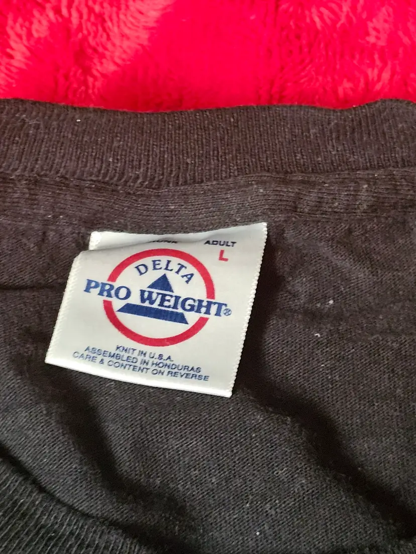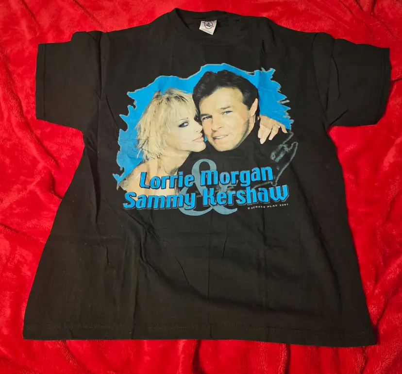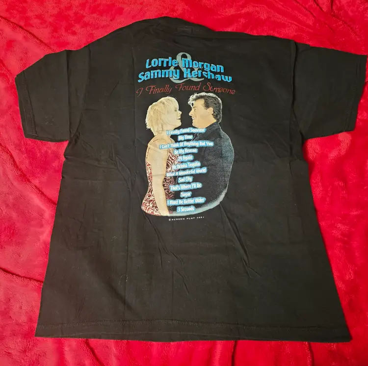 This vintage Lorrie Morgan & Sammy Kershaw I Finally Found Someone Tour T-Shirt in size L features a classic crew neck and short sleeves, made of black cotton with a graphic print of Sammie Kershaw. The shirt is machine washable and represents the 90s music theme, making it suitable for all seasons including winter, summer, fall, and spring. With its double-sided print and regular fit, this Delta brand t-shirt is a must-have for fans of country music and collectors of vintage clothing from the United States.