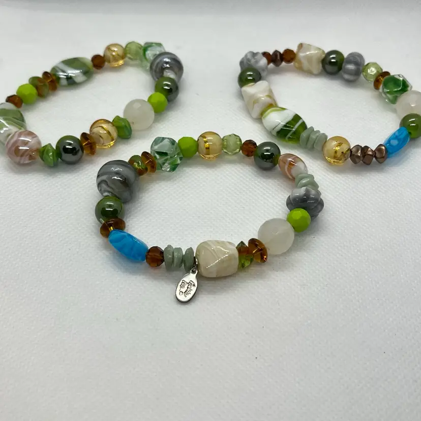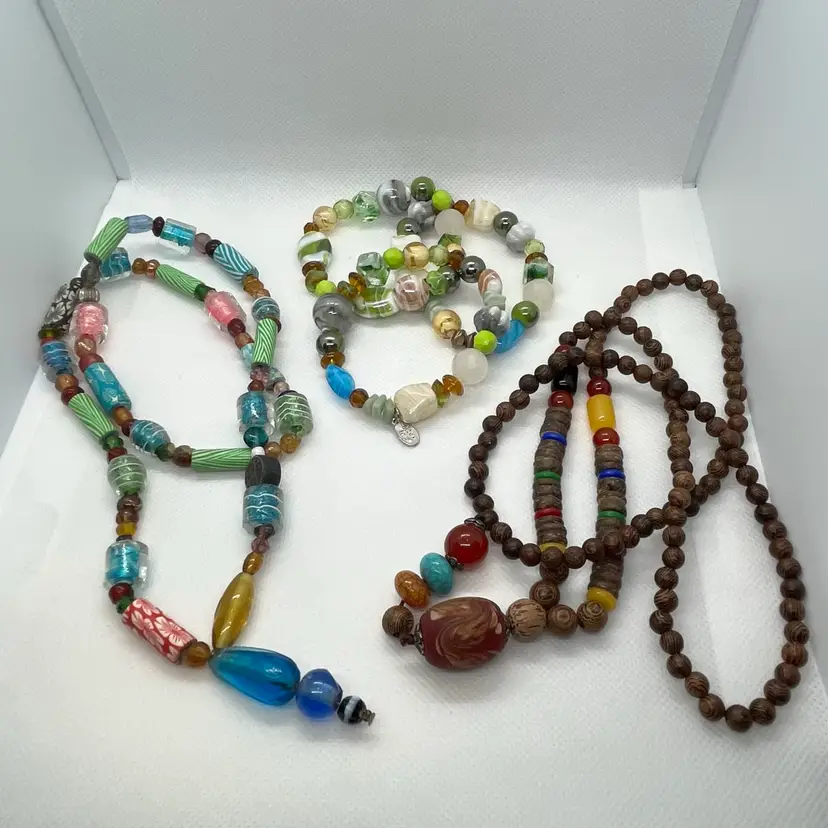 • Vintage bohemian style jewelry • A mix of wood and glass beads • Includes necklaces and bracelets • Features one piece from Cookie Lee