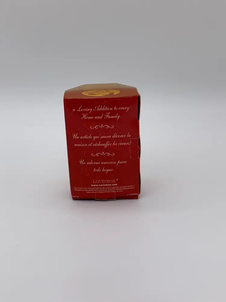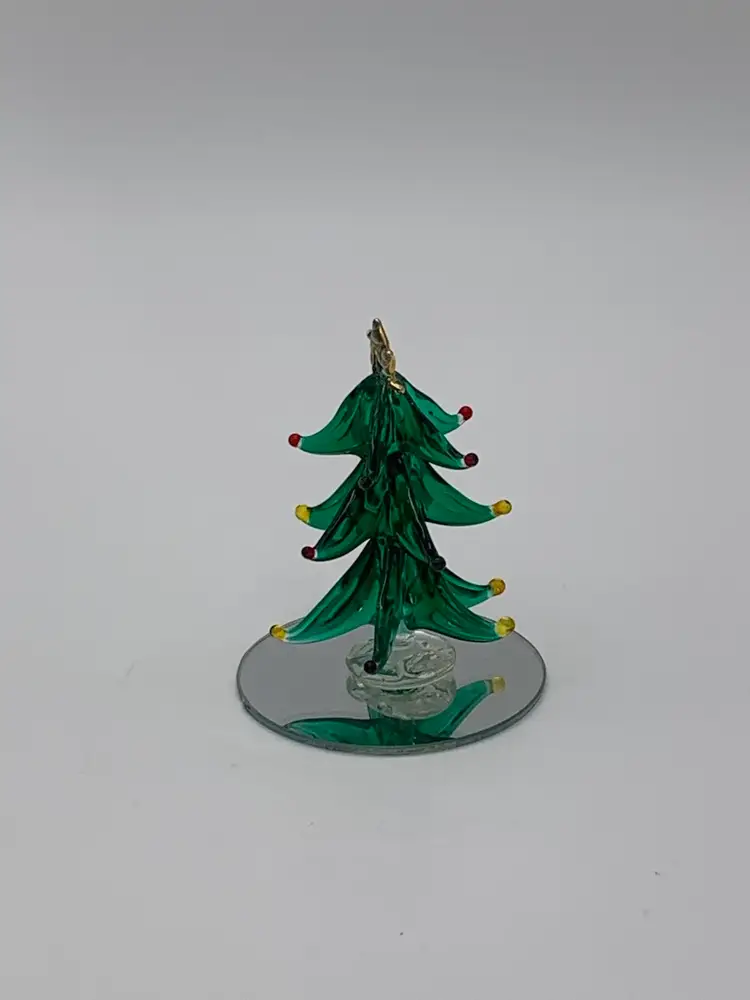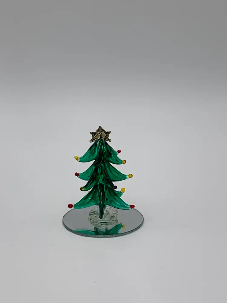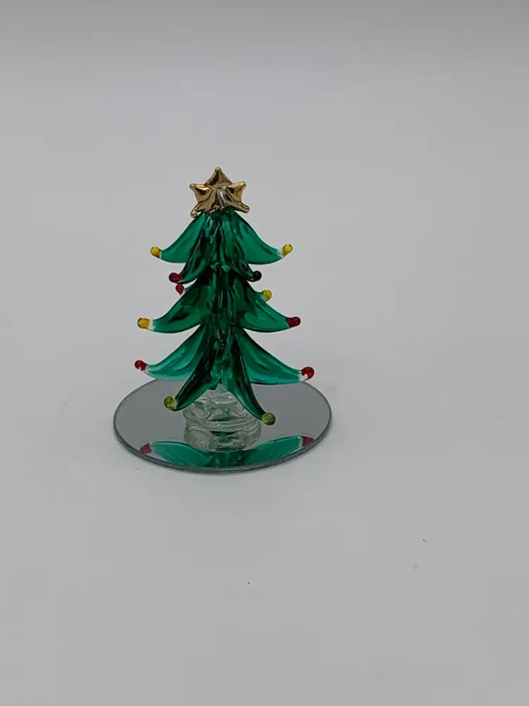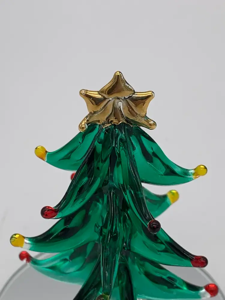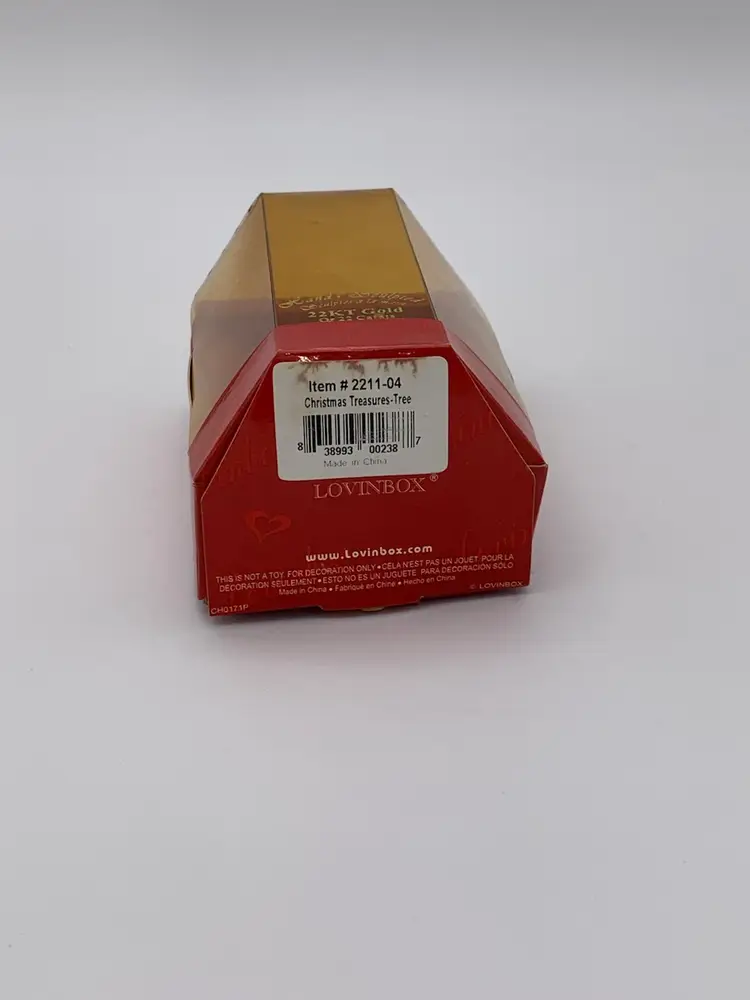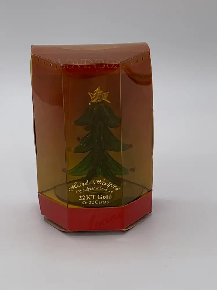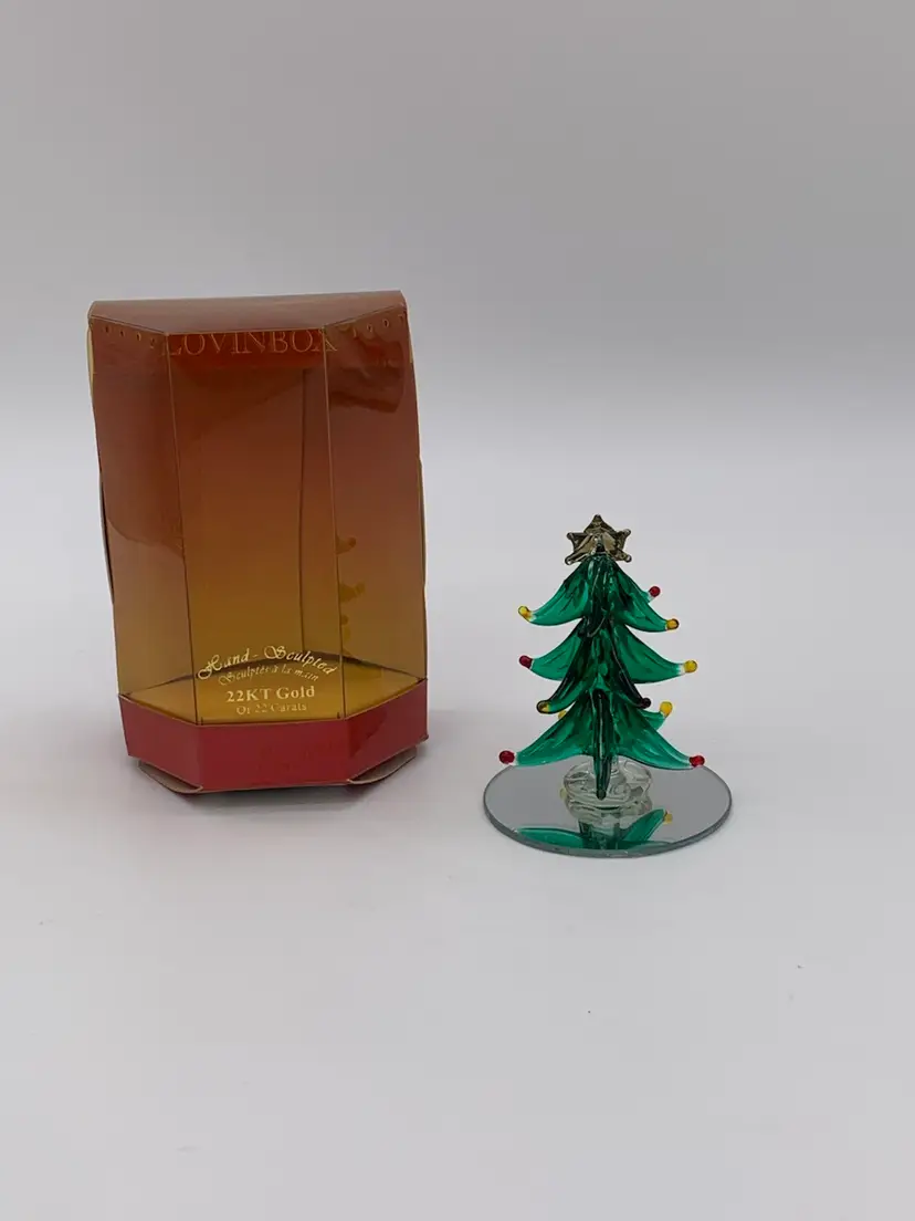 The vintage LOVINBOX 22KT gold hand sculpted art glass Christmas tree has a round reflective mirror base. A beautiful small figurine approximately 3.5” high, 3” wide featuring a multi-color design with a 22KT gold star. Made of glass and hand blown in China, this collectible piece is part of the Treasures Christmas Tree collection. With a 3D effect and shiny finish, this traditional art deco style figurine is perfect for any room and is sure to add a touch of seasonal charm to your decor. Well kept in its original packaged box, and is in excellent condition! This unique piece is a must-have for collectors and art enthusiasts alike.