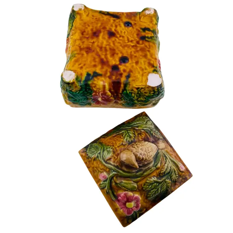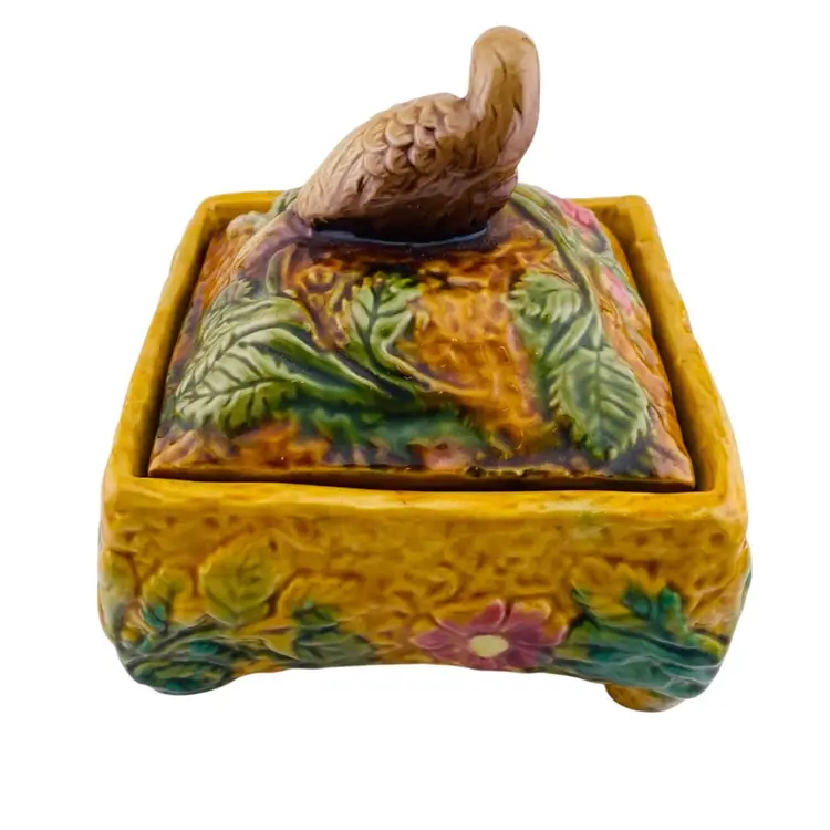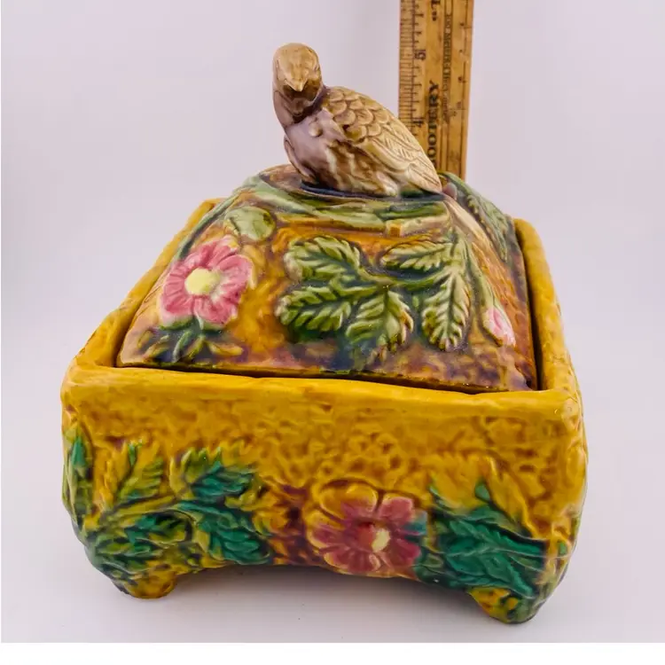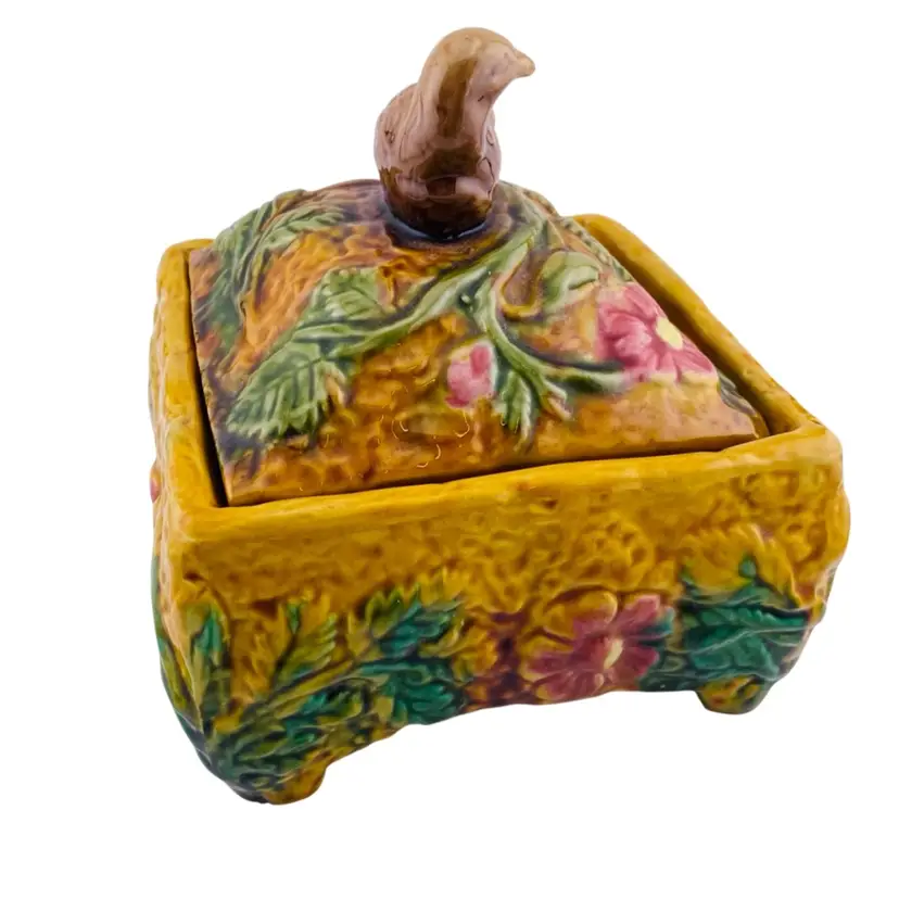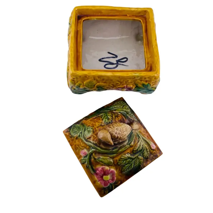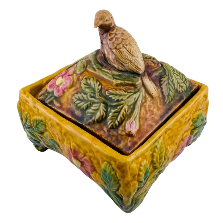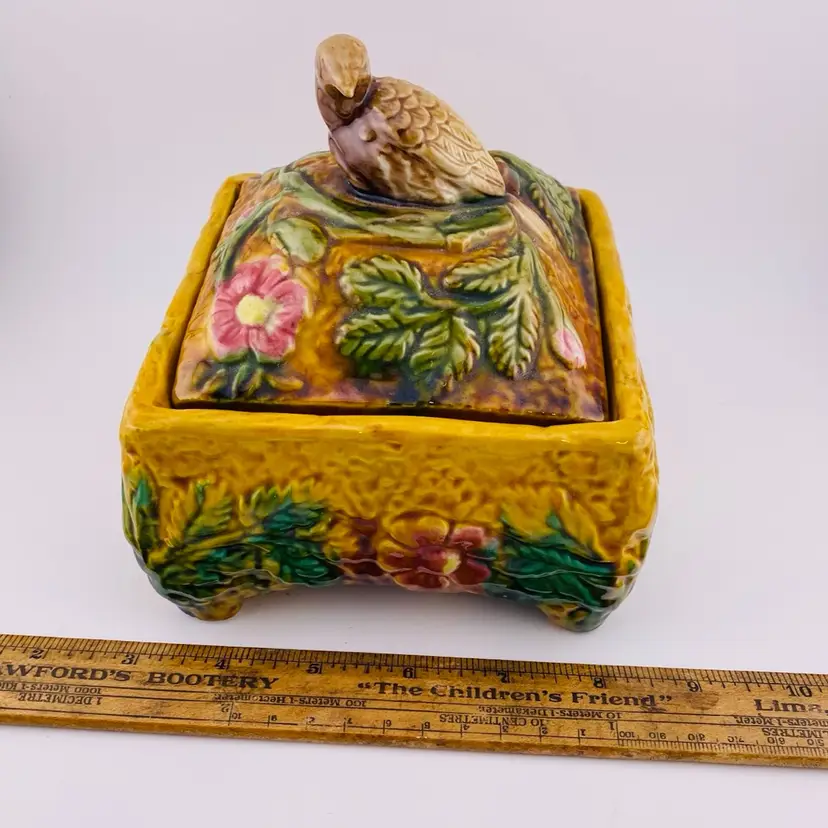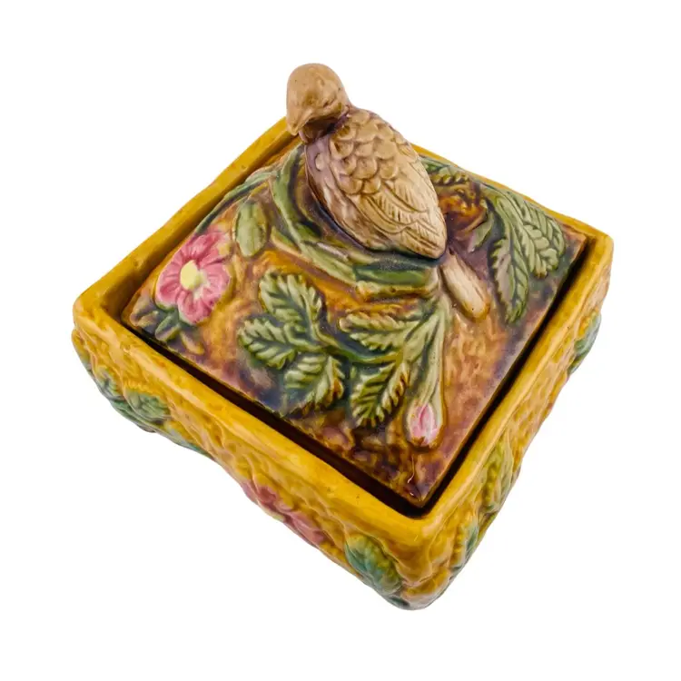 VTG Majolica Bird Trinket Box Ceramic Floral Colorful