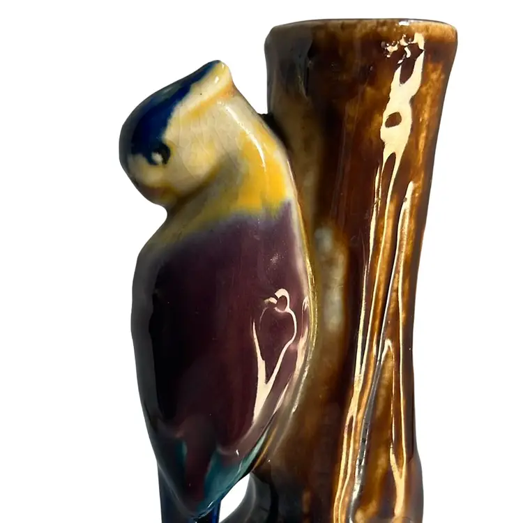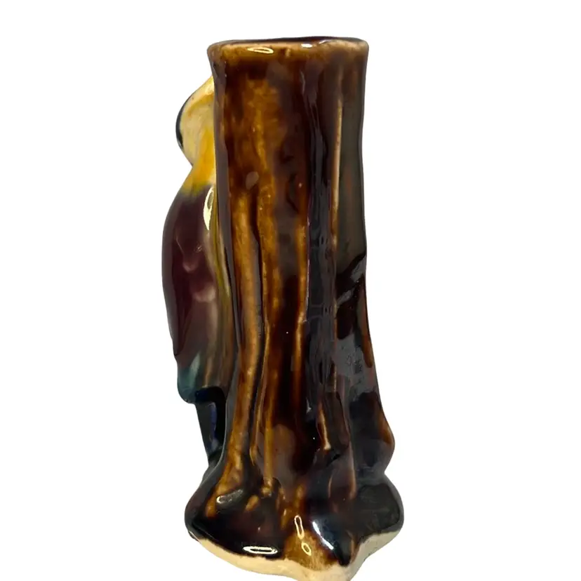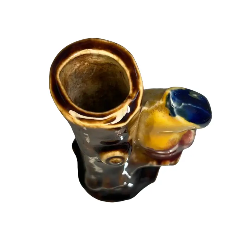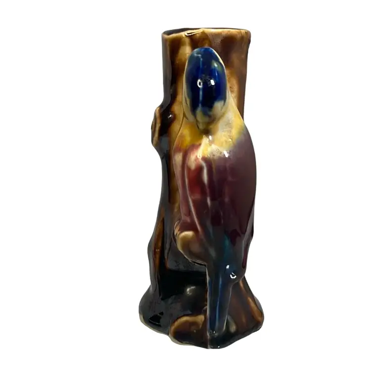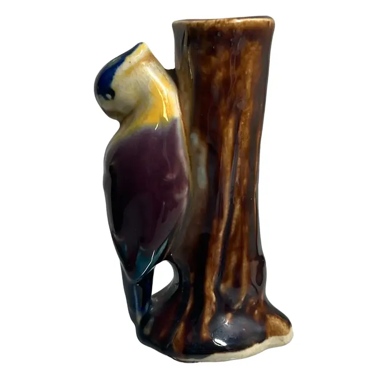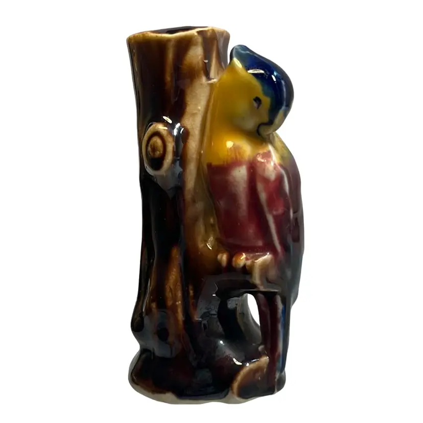 Sweet bud vase, made in Japan, with a parrot / exotic bird perched on a tree trunk. Beautiful, rich paint colors including brown, yellow, magenta, purple, blue.