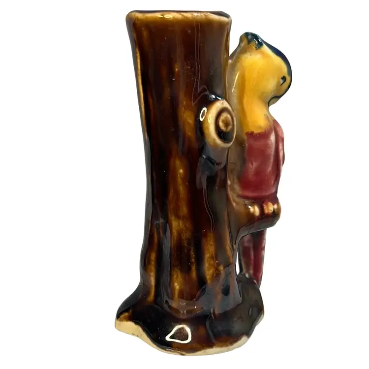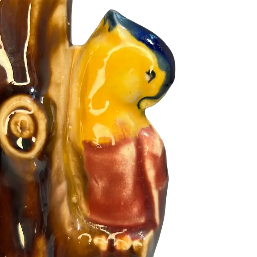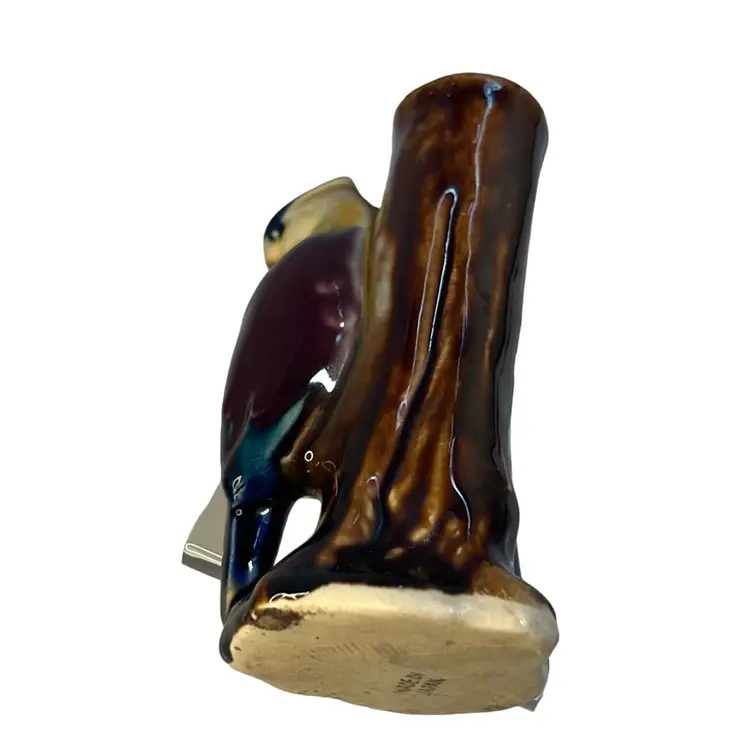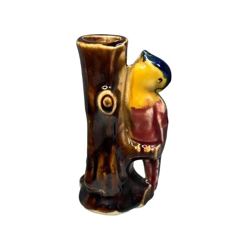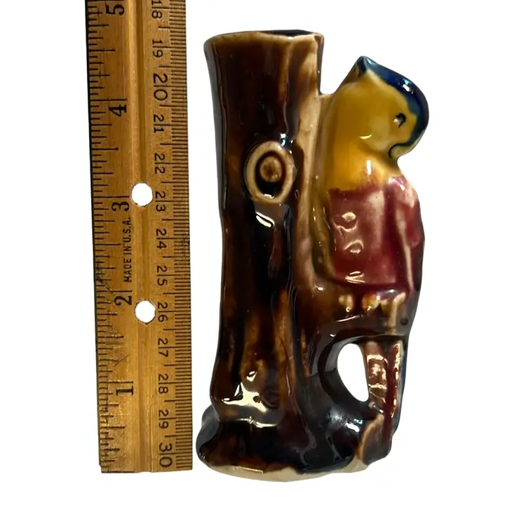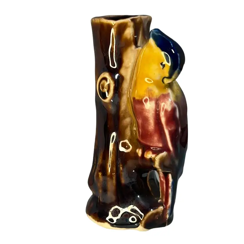 Sweet bud vase, made in Japan, with a parrot / exotic bird perched on a tree trunk. Beautiful, rich paint colors including brown, yellow, magenta, purple, blue.