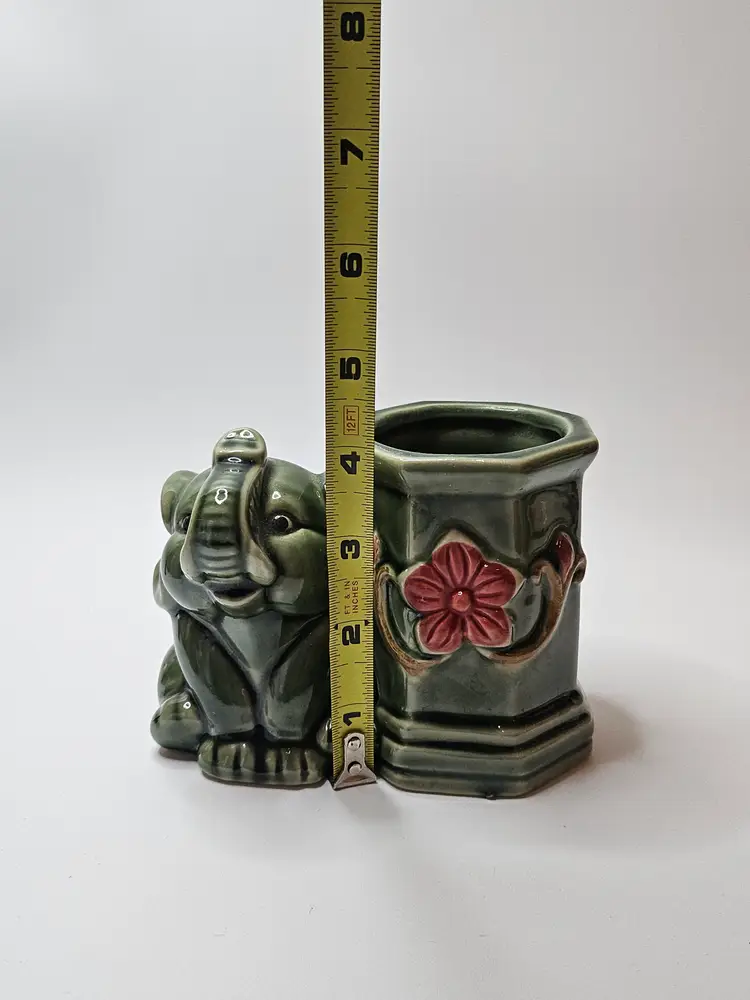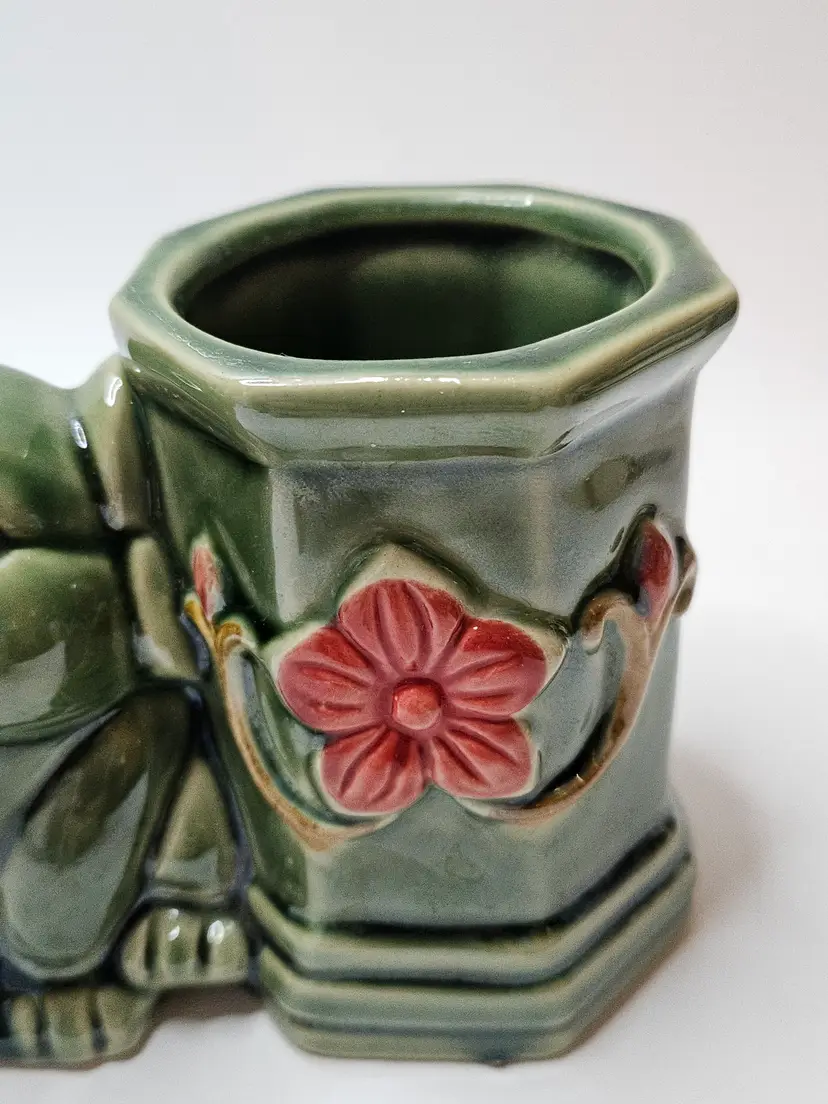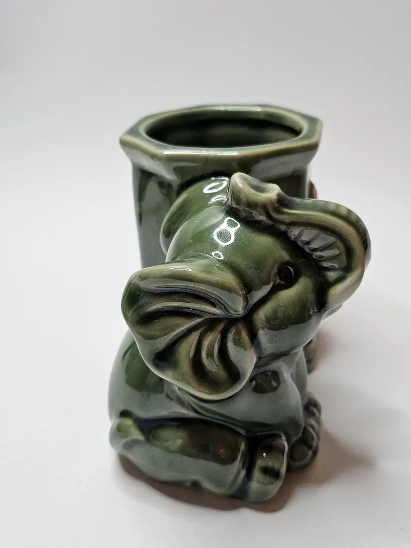 This vintage Majolica style planter features a lucky elephant with its trunk up, perfect for holding bamboo or succulents in a modern or Mid-Century Modern setting. The ceramic planter is hand-painted in green with a high gloss glazed finish, adding a touch of charm to any room in the house. The elephant theme adds a whimsical touch to the decor, making it suitable for various occasions and rooms such as offices, bedrooms, living rooms, or kitchens.