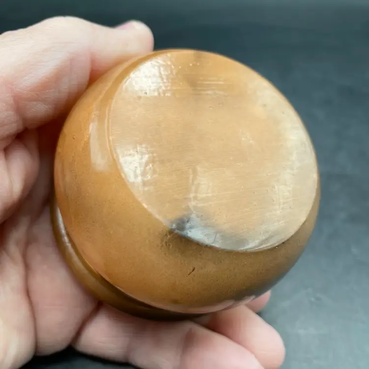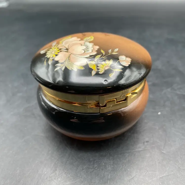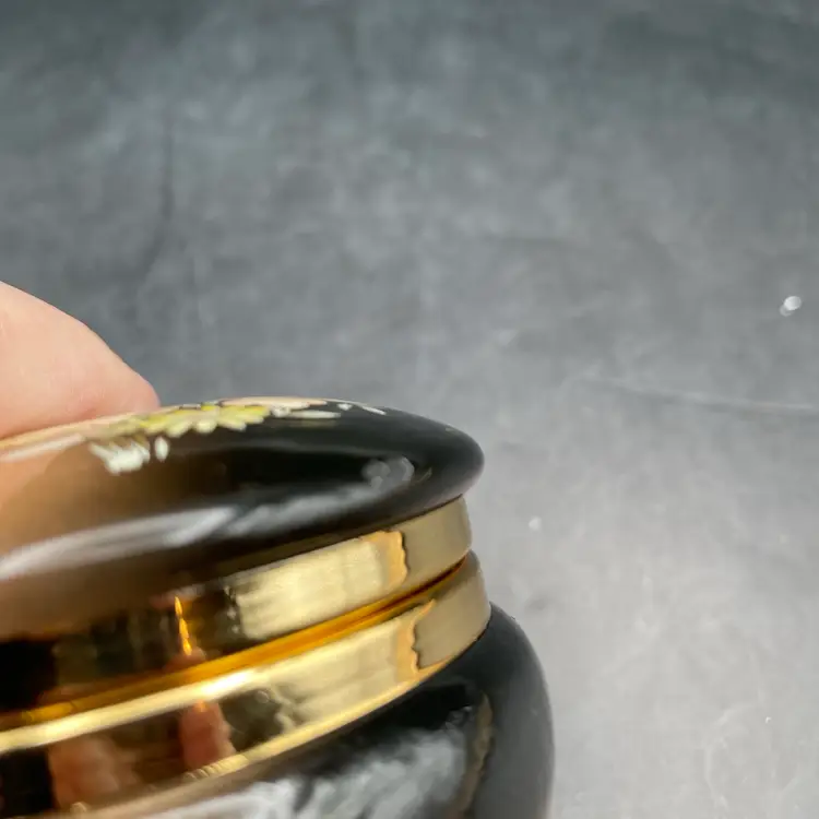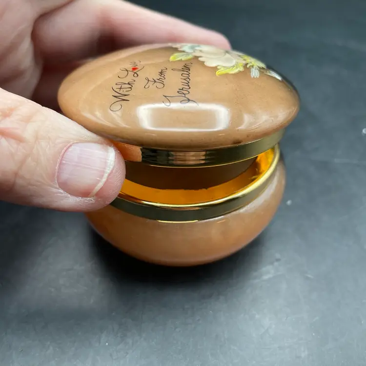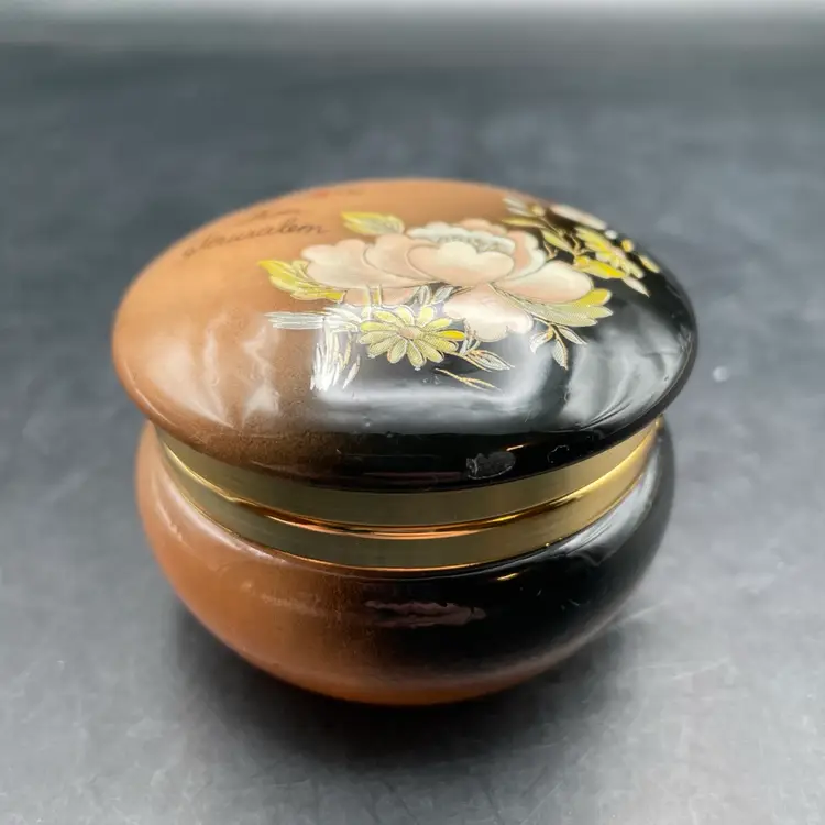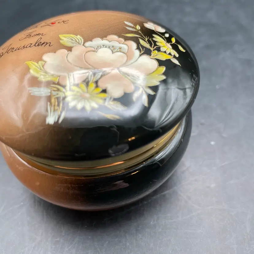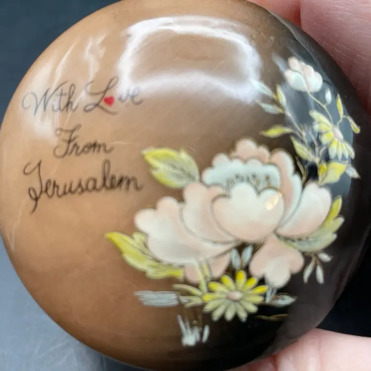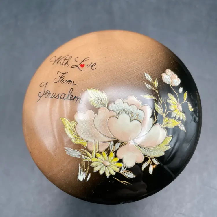 Approximately 2” tall x 2.5” in diameter . One tiny scratch on the lid rim in the black area. See pictures. Stenciled flowers and “With love from Jerusalem”.