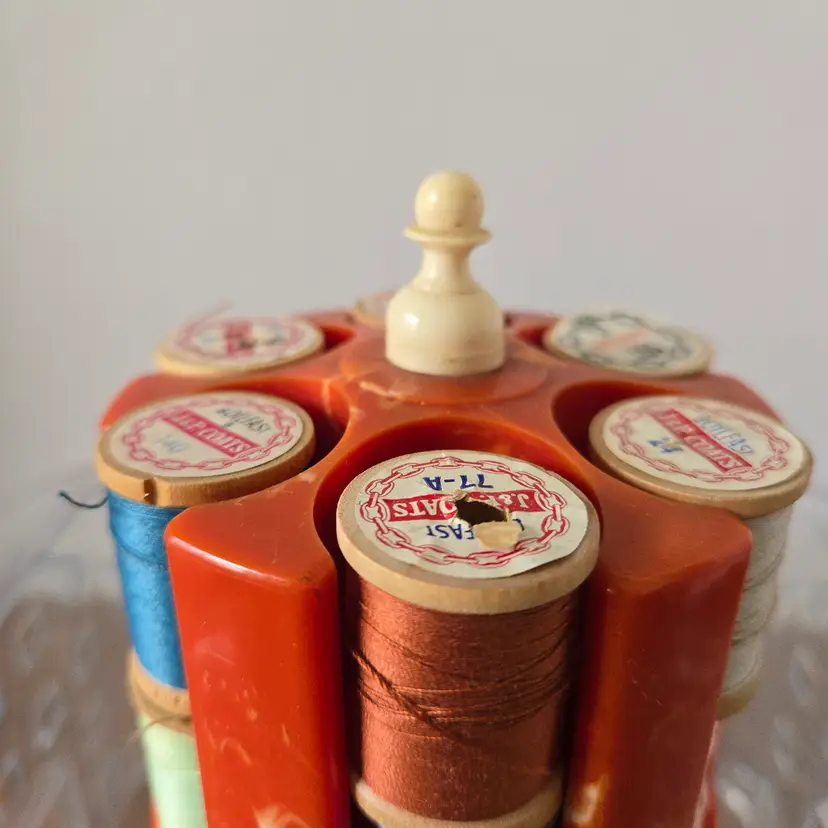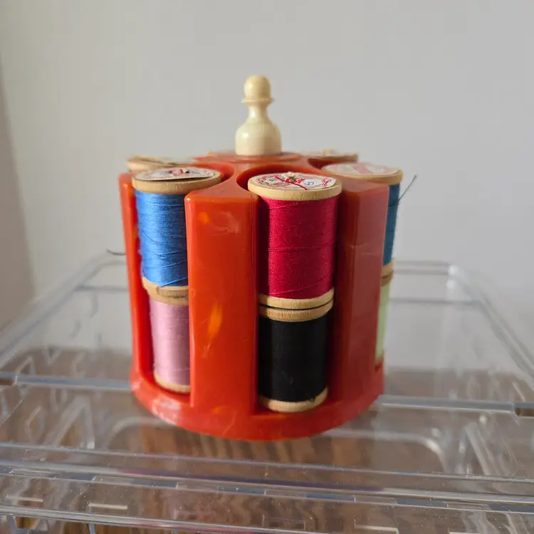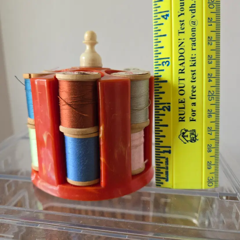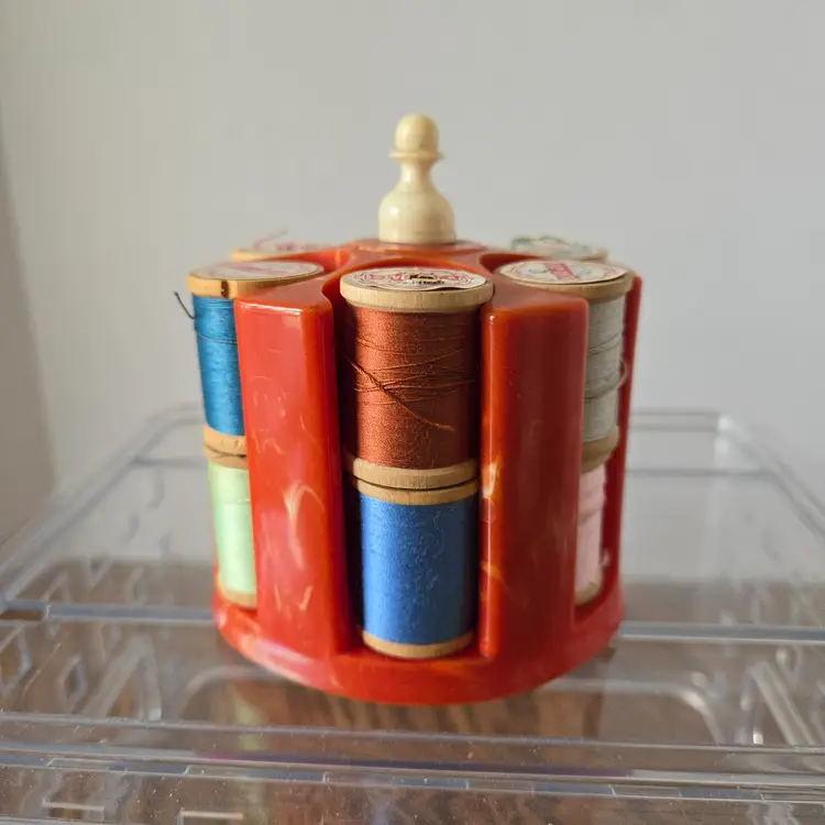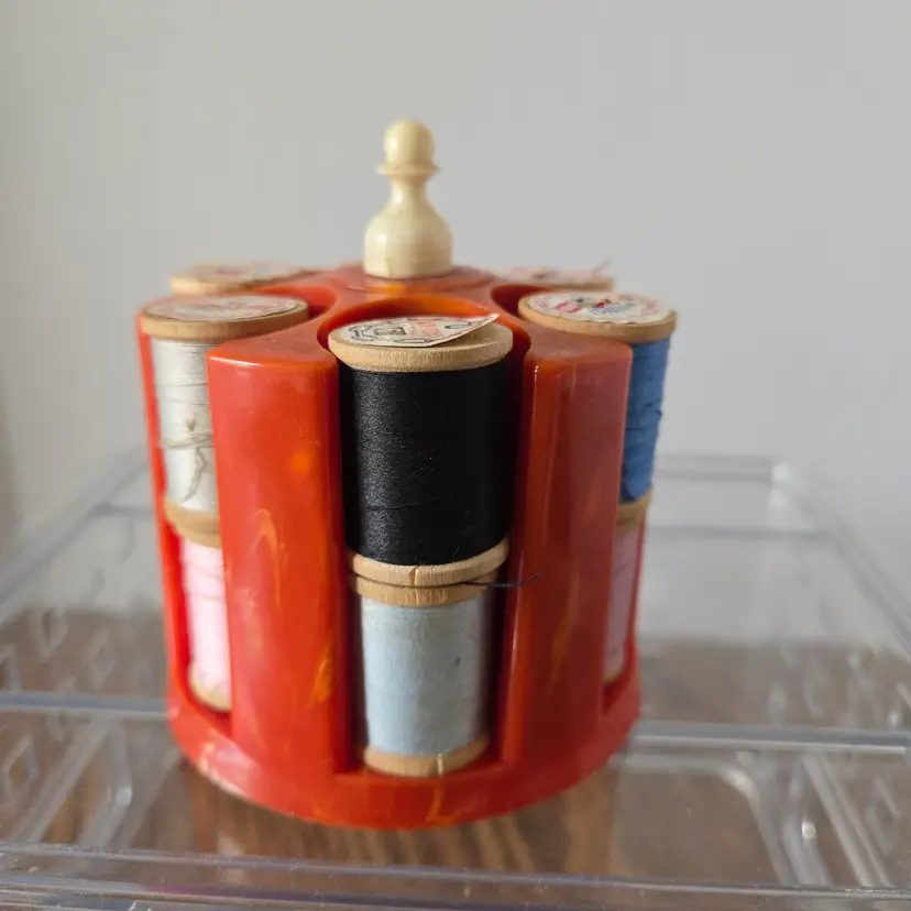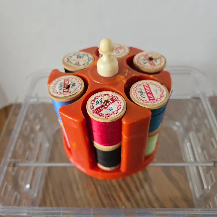 I found this thread caddy/holder stored among other sewing items at my dad's house (pet and smoke free) after he passed away in 2002. I believe it came from my great aunt's house.
