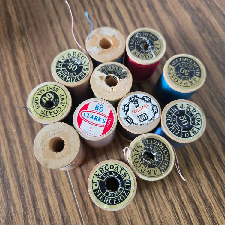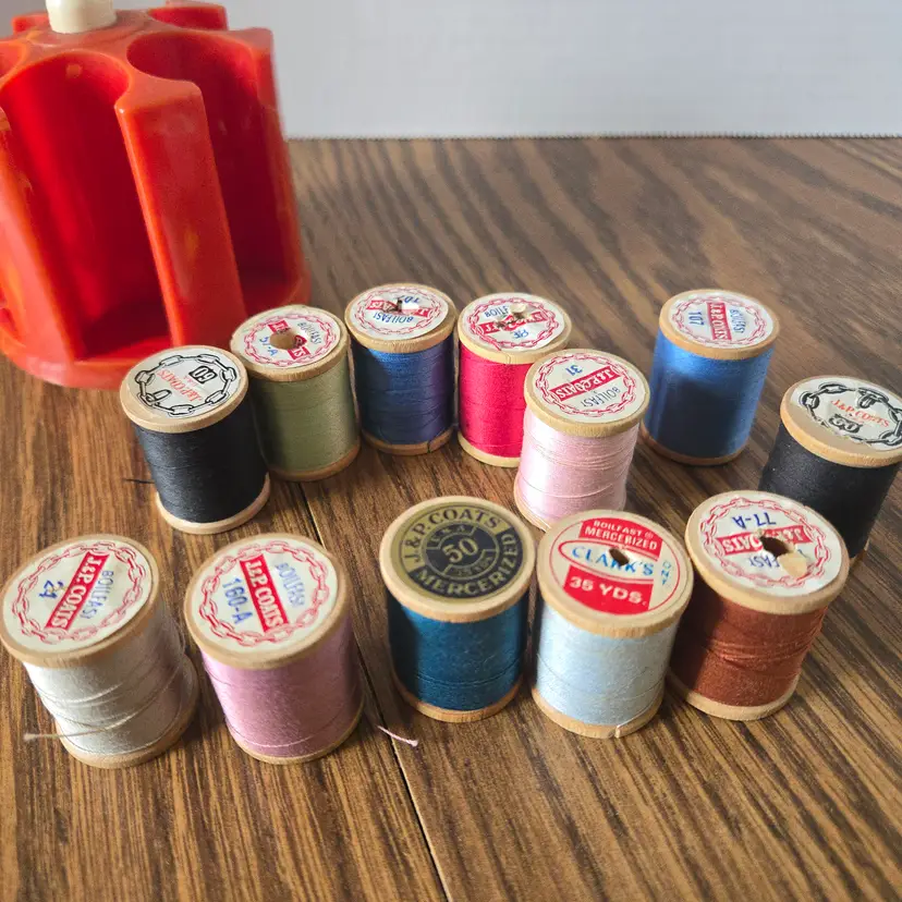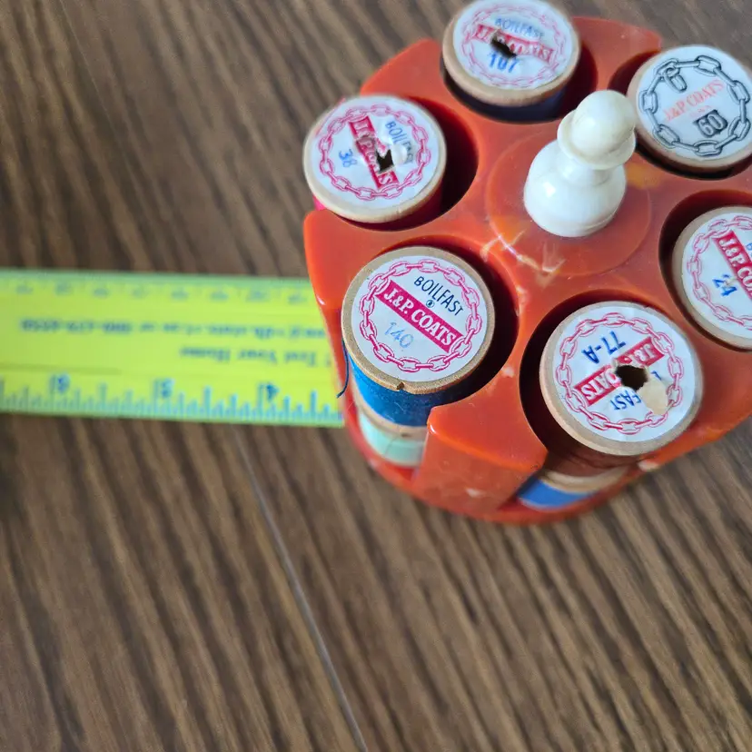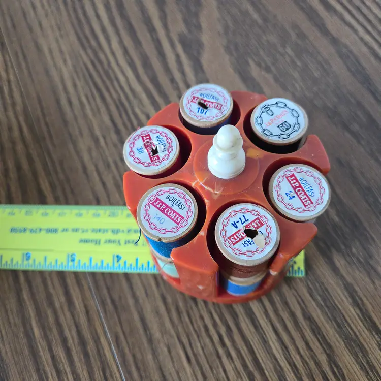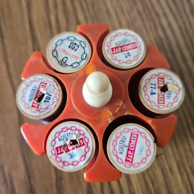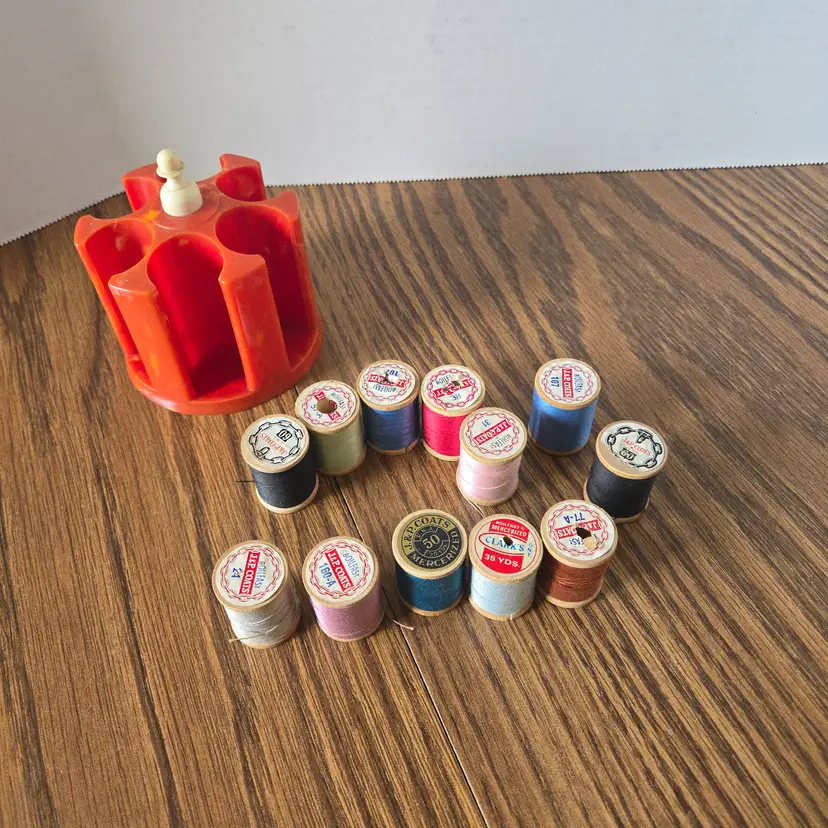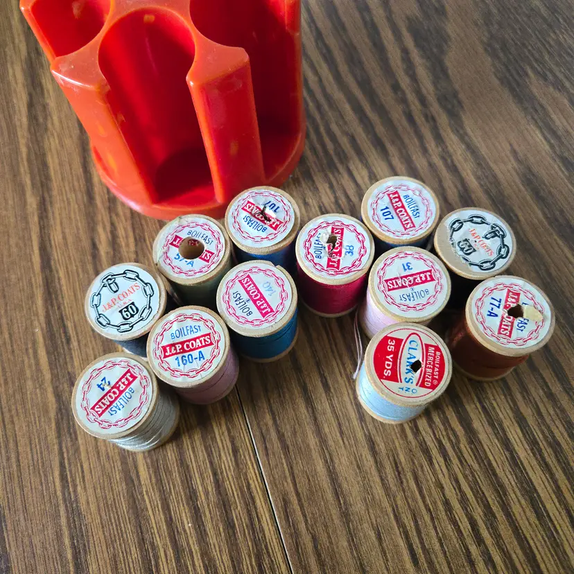 The caddy is made of hard plastic and may be bakelite but I don't know enough about it to test it. I've seen these listed as Bakelite and AI says it may be. It has some spools of thread in it but I sorted out other thread I found and filled it similar vintage wooden spools of various colored thread. All spools are the same size and all are J&P Coats. Some appear to be unused but most have had some thread removed. Most are labeled boil-fast cotton. Please see pictures for variations. Some are not labeled on the opposite end and some are different thread weights. Please see pictures.