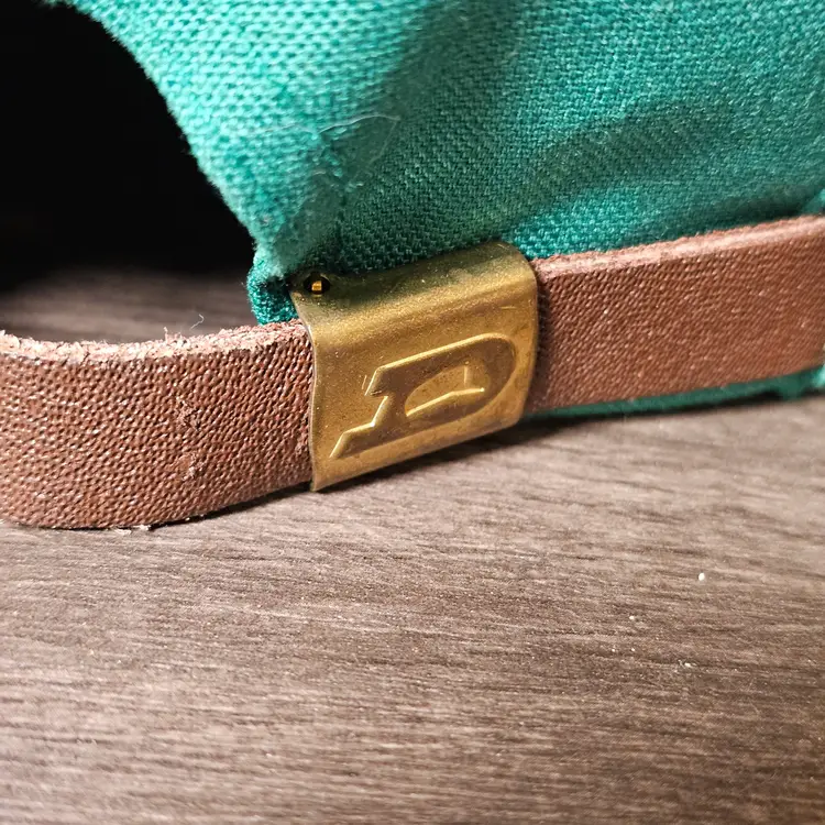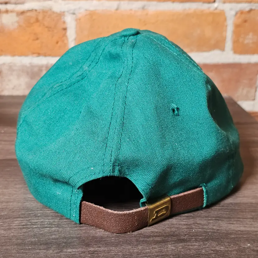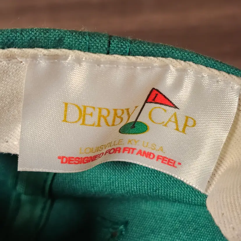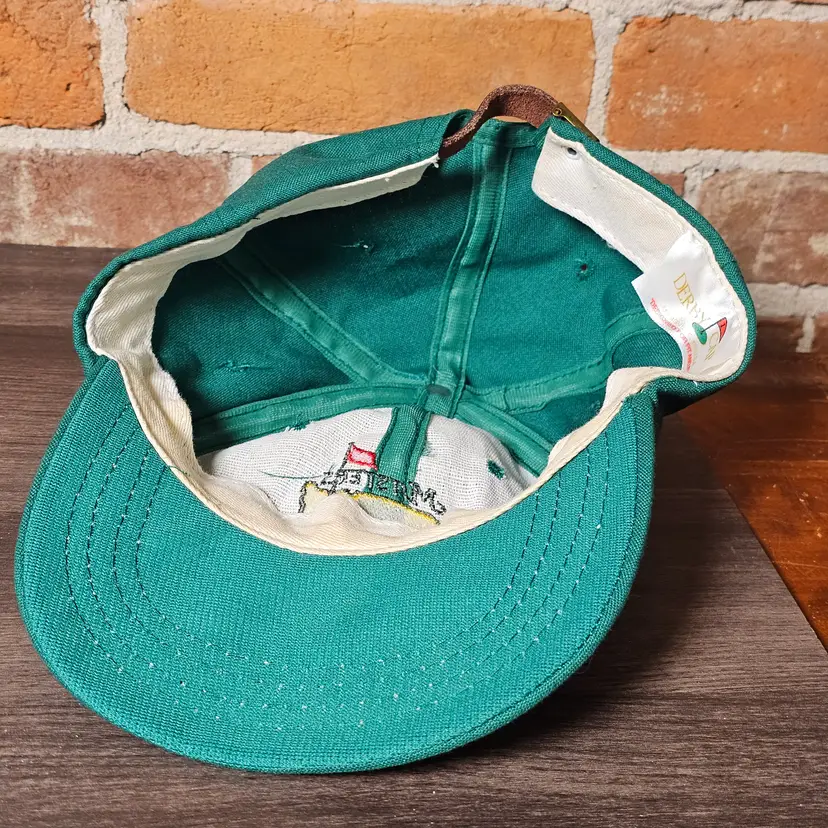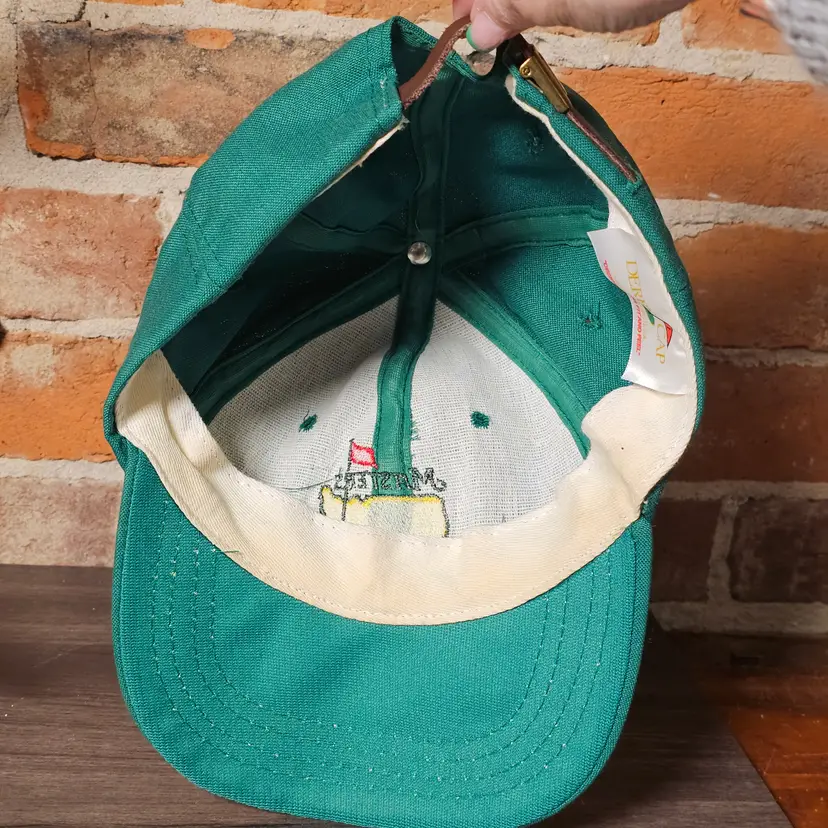 Vintage Masters Augusta National golf hat in classic green, featuring the iconic embroidered USA map logo with flag pin. Made by Derby Cap (Louisville, KY), this hat includes a premium leather strap with brass buckle for an adjustable fit.