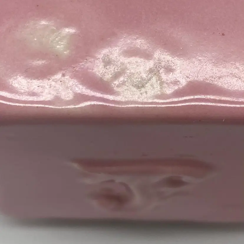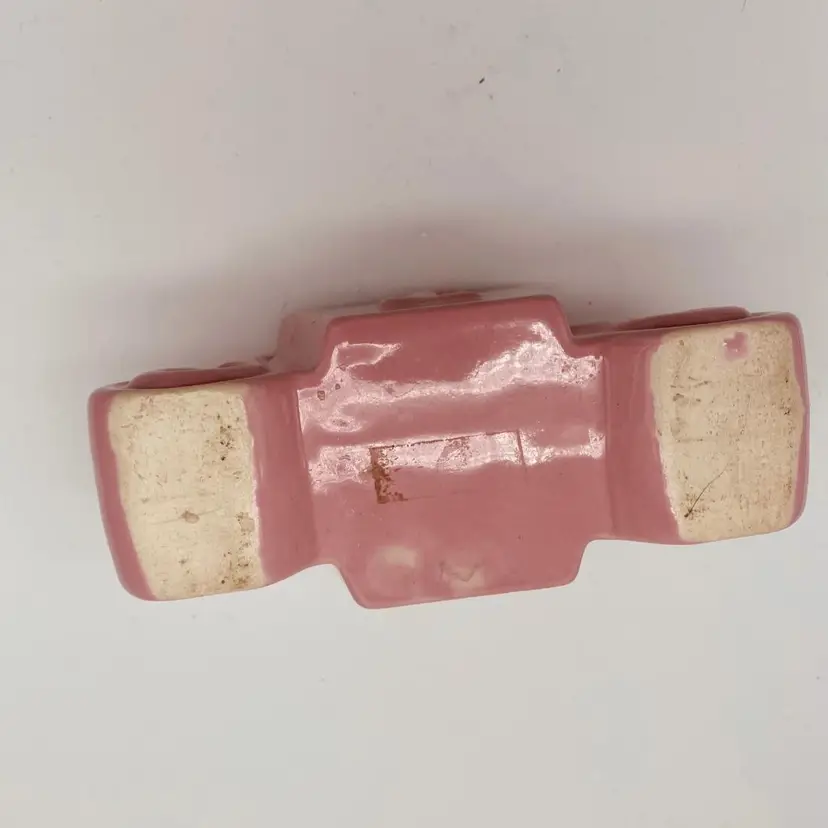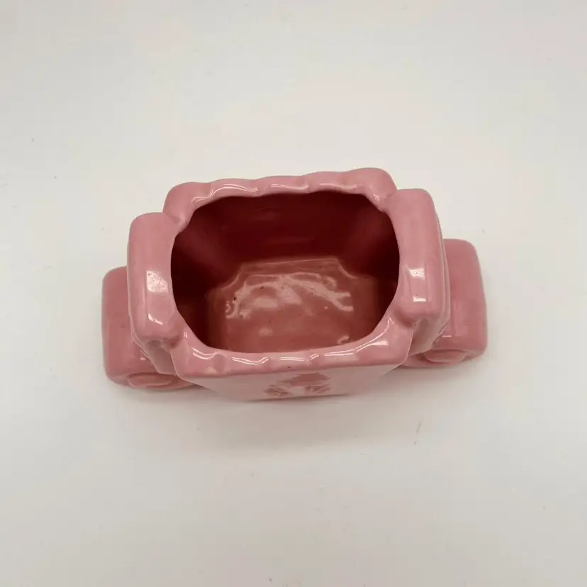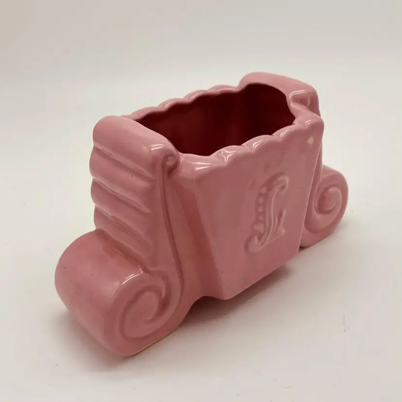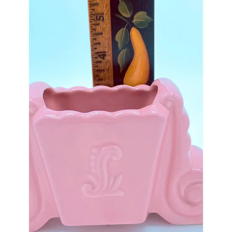 This 3.5" McCoy pottery planter from the 1950s is just so adorable! It looks like Shawnee, but the mark is definitely McCoy. Excellent condition, no chips or cracks. White spot on one side is in the glaze and not a chip. The design on the side - it's been debated whether it's an S, an L, or even a sea serpent arising from the waves! You choose!