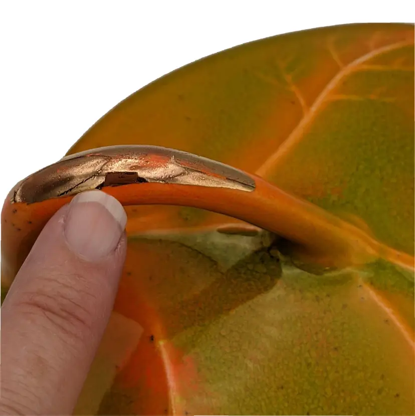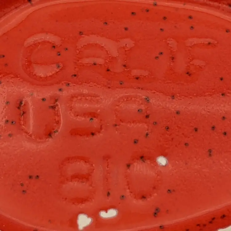 No chips or cracks, slight wear on the handle The white parts on the bottom are NOT chips but a natural part of the creation process.