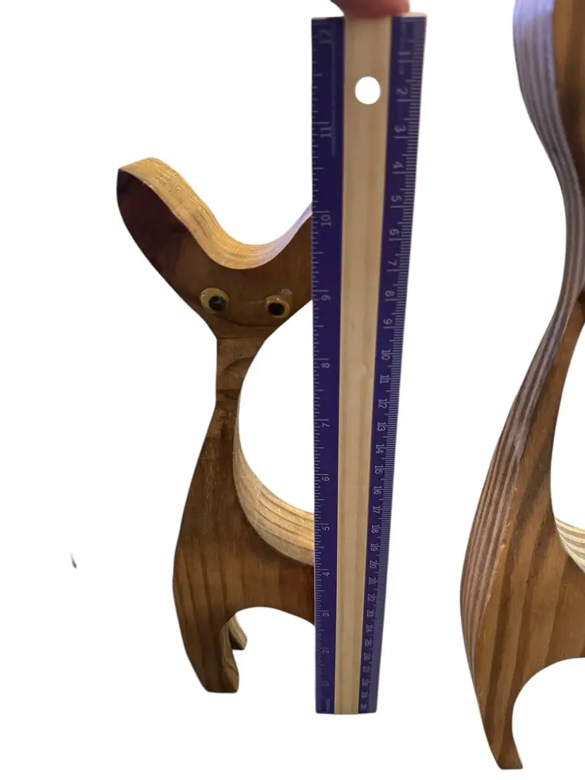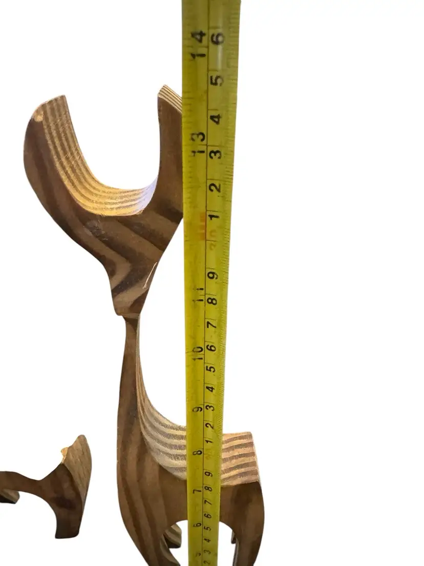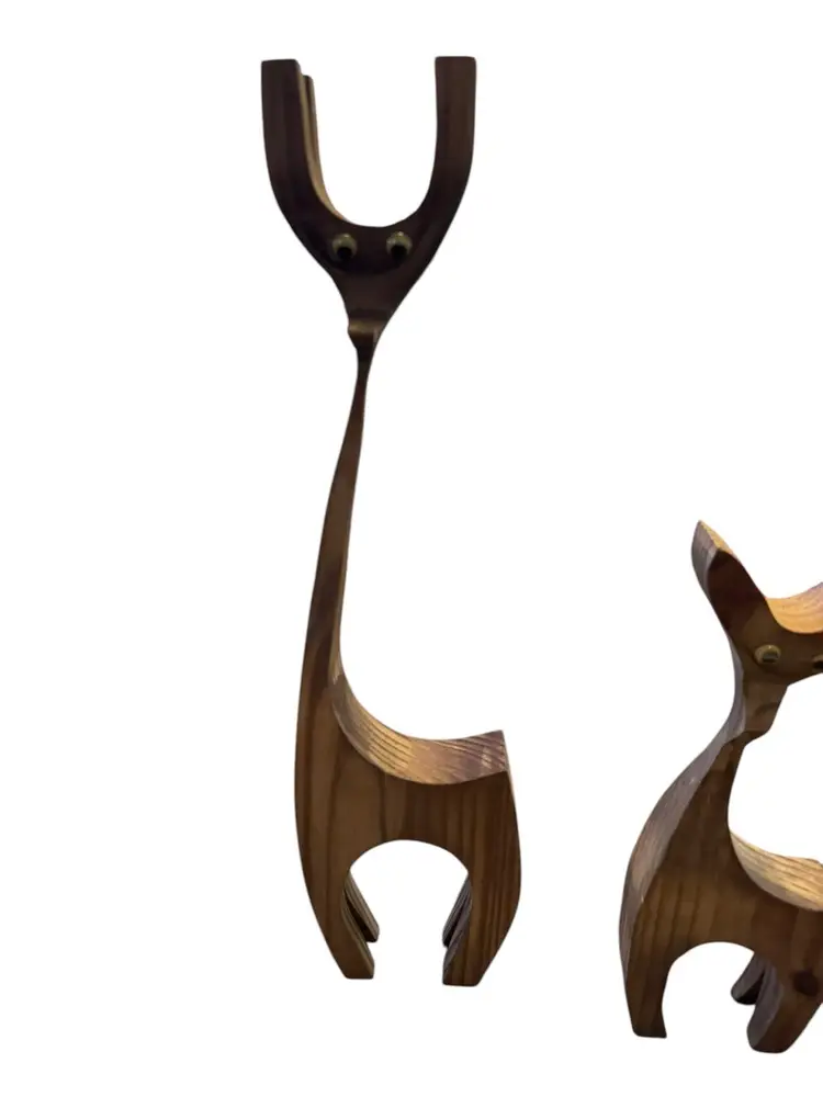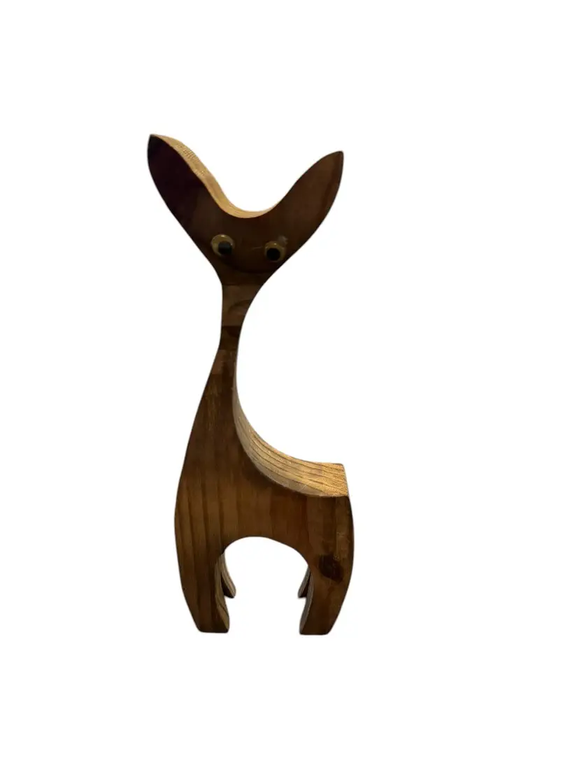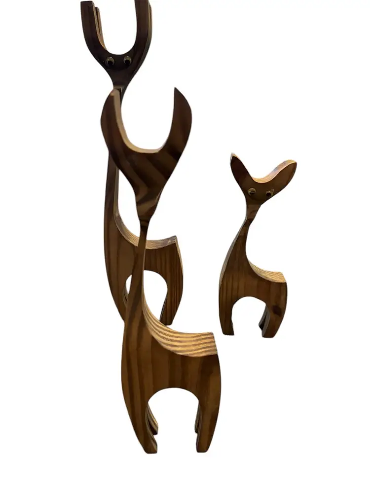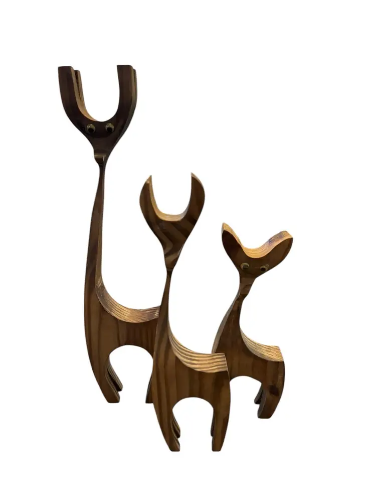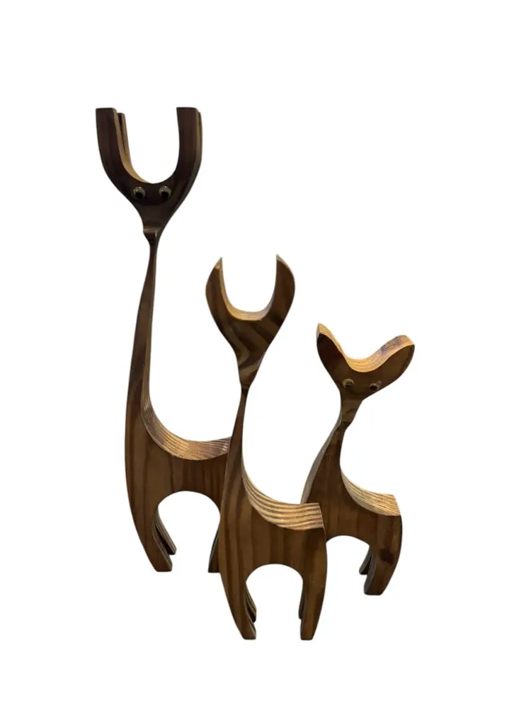 Vintage hand carved Mid century, wood Swedish style reindeer family. This is a cute trio. It’s done rather well. It’s a bit juvenile, but would look cute in your Christmas decor. There are eyes on two of these, but they can be removed. See pictures for measurements.
