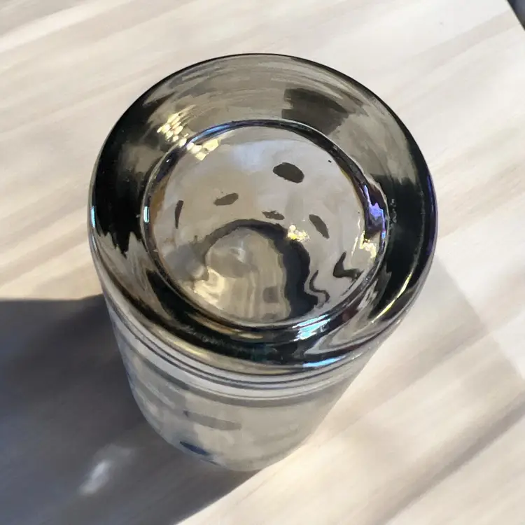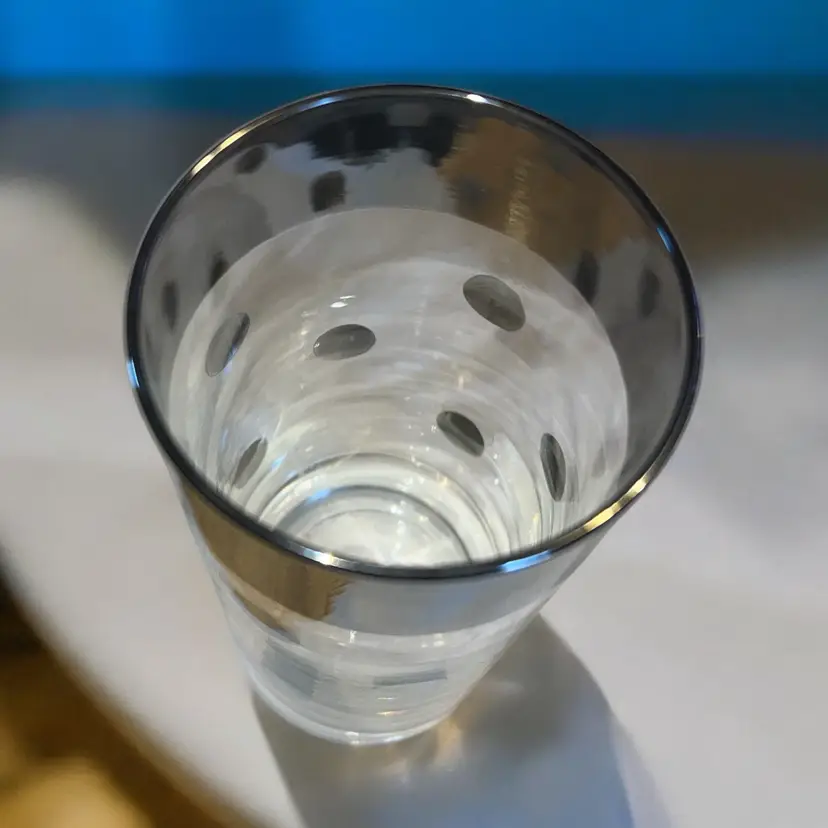 This vintage mid-century modern cocktail glass features a round shape with a clear glass material and polka dot design. It has a silver rim and is hand wash only. The glass is medium-sized, measuring 5 1/2 inches in height and 2 1/2 inches in diameter. Perfect for all occasions, this highball glass is decorated and ideal for serving cocktails. Made in the 1960s, it is a unique piece reminiscent of Dorothy Thorpe style barware.