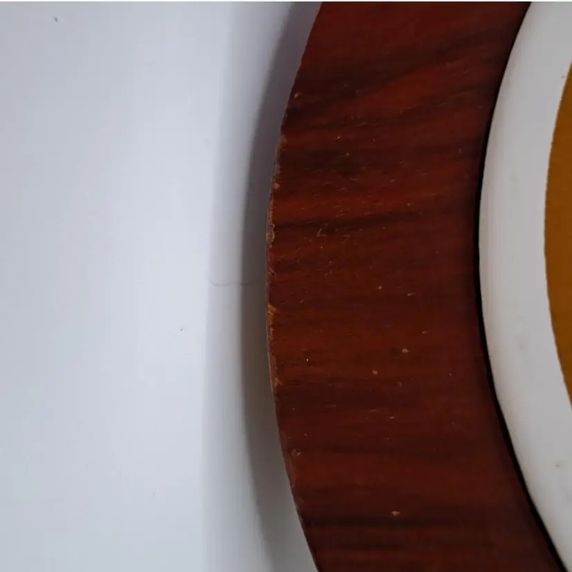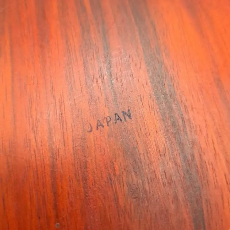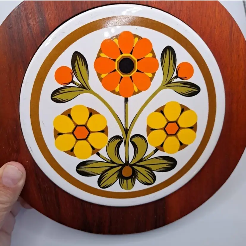 Floral ceramic tile trivet set in cherry tone wood Marked Japan Approximately 8" diameter, 12" long No cracks to ceramic Some flea bite chipping on edges of wood.
