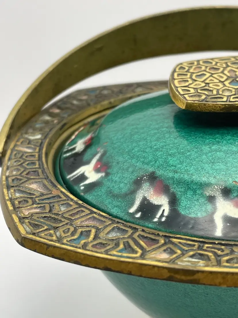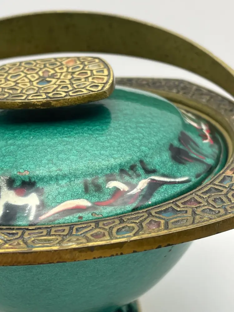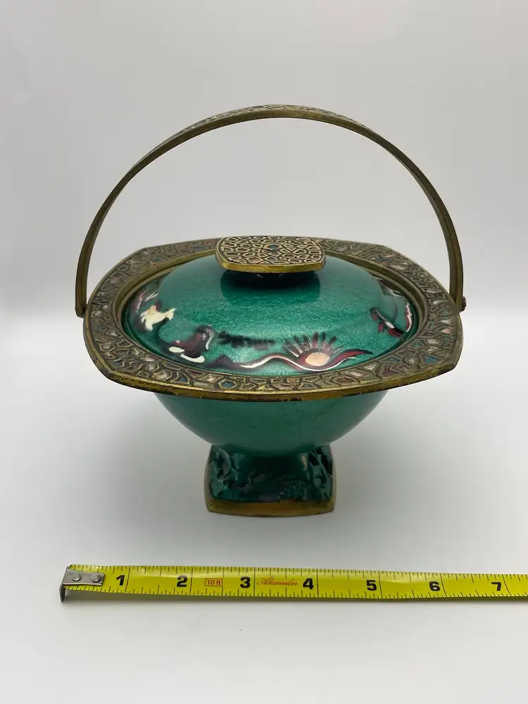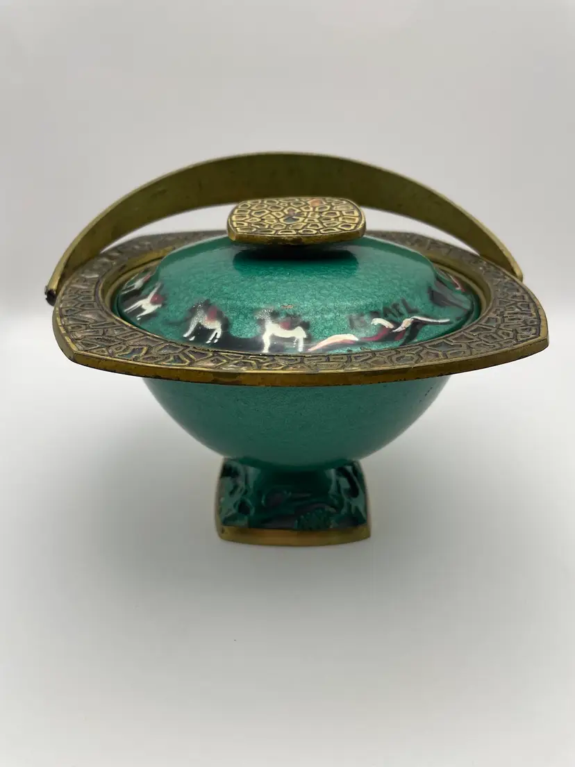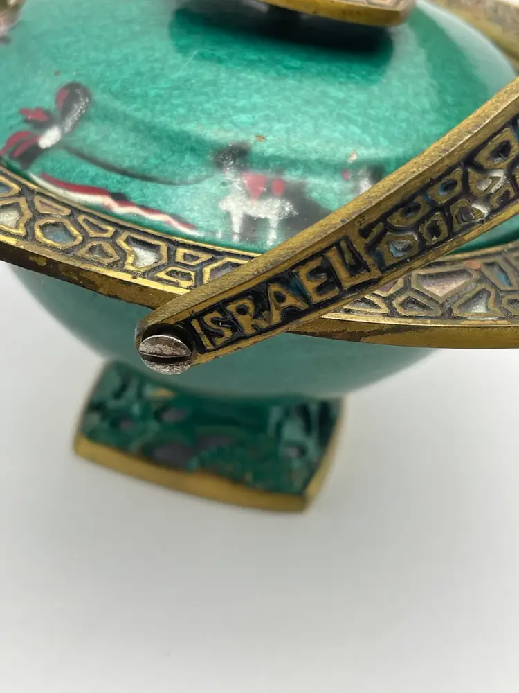 Vtg MCM Judaica Enamel Painted Brass Candy Dish Bowl W/ Lid & Handle Israel (Some scratching, due to age. Shown in last picture)