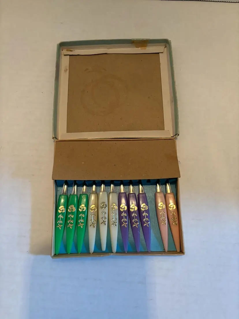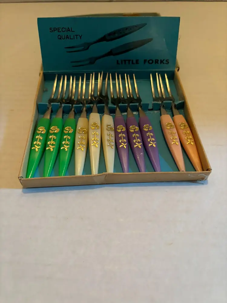 Add a touch of Mid-Century Modern charm to your dining table with these vintage "Little Fork" appetizer forks. Crafted from durable stainless steel, these forks measure 4 inches in length and feature a colorful, multicolor design that is sure to impress. The plastic handles make them comfortable to use and easy to clean. Whether you're a collector or just looking for unique flatware, these Little Fork appetizer forks are a must-have addition to your kitchen. Set contains 11 of 12 forks MISSING one pink fork