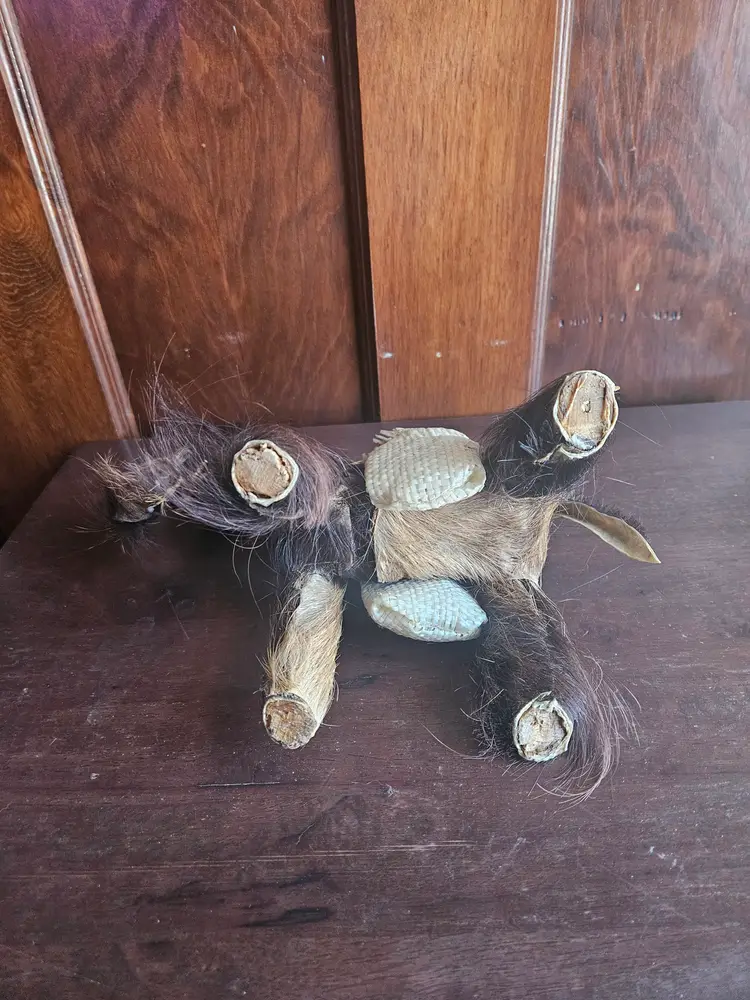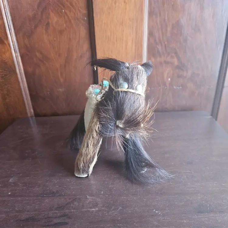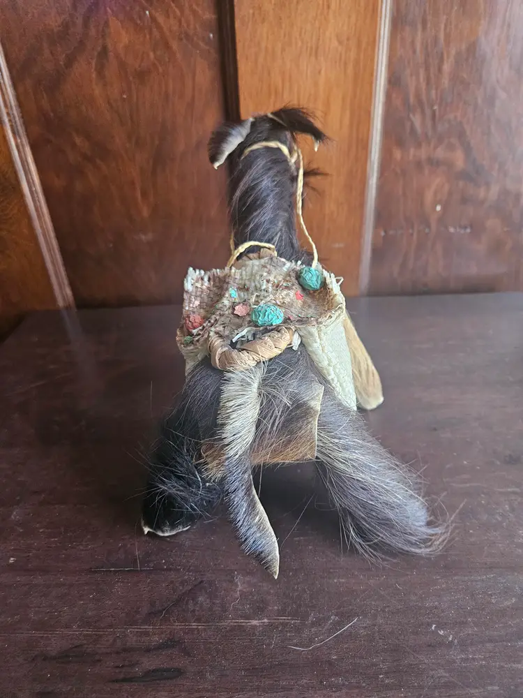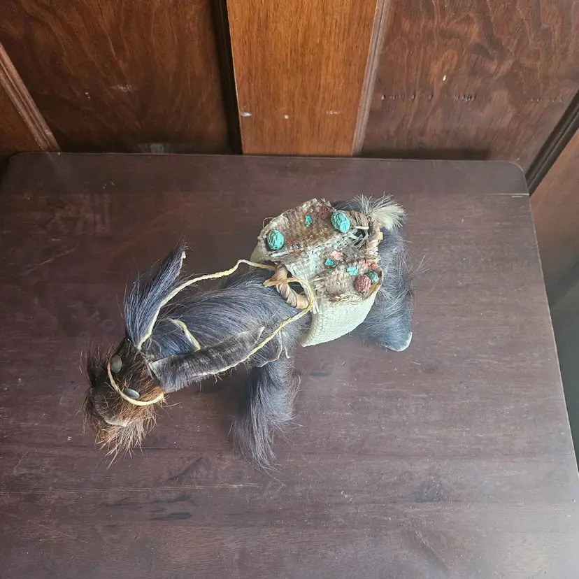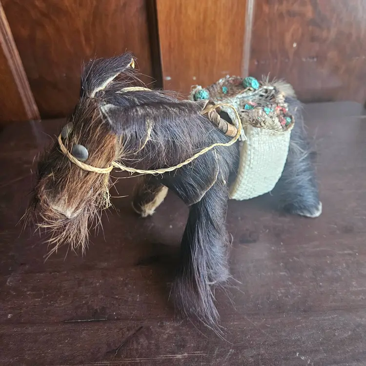 This product is a handmade Mexican folk art figurine depicting a Mule Marchanta carrying trade items. Made from mixed materials, including real fur, this unique piece showcases intricate craftsmanship and cultural significance. Perfect for collectors interested in animals, farm and countryside themes, or Mexican artistry, this figurine is a charming and authentic addition to any collection.