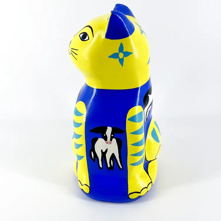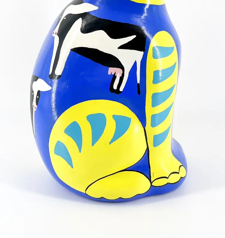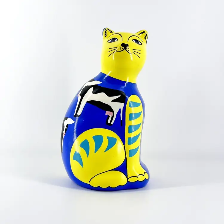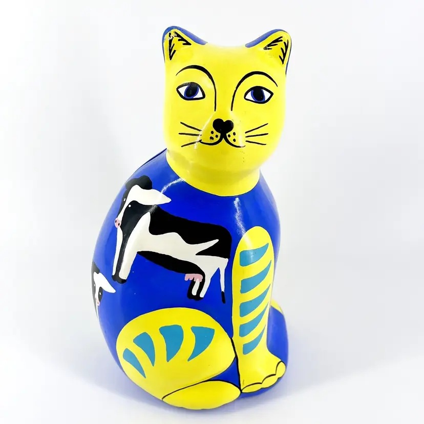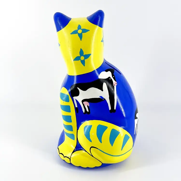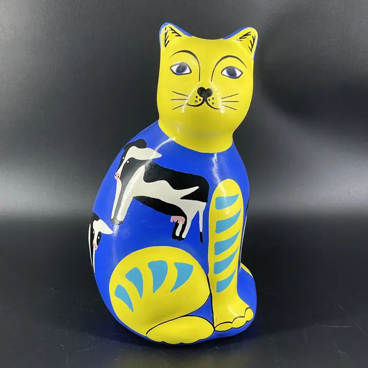 This ceramic figural cat bank was made in Mexico by Mayabella. It features a hand painted blue and yellow design with cows. It is 10" tall and measures 6"x5.5" and is in excellent condition. There are no cracks, breaks, chips or repairs. There is some surface marks from use. (See photos).