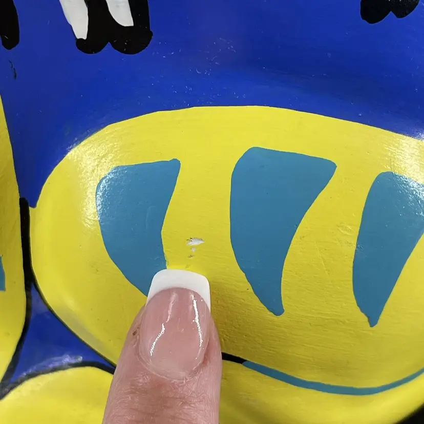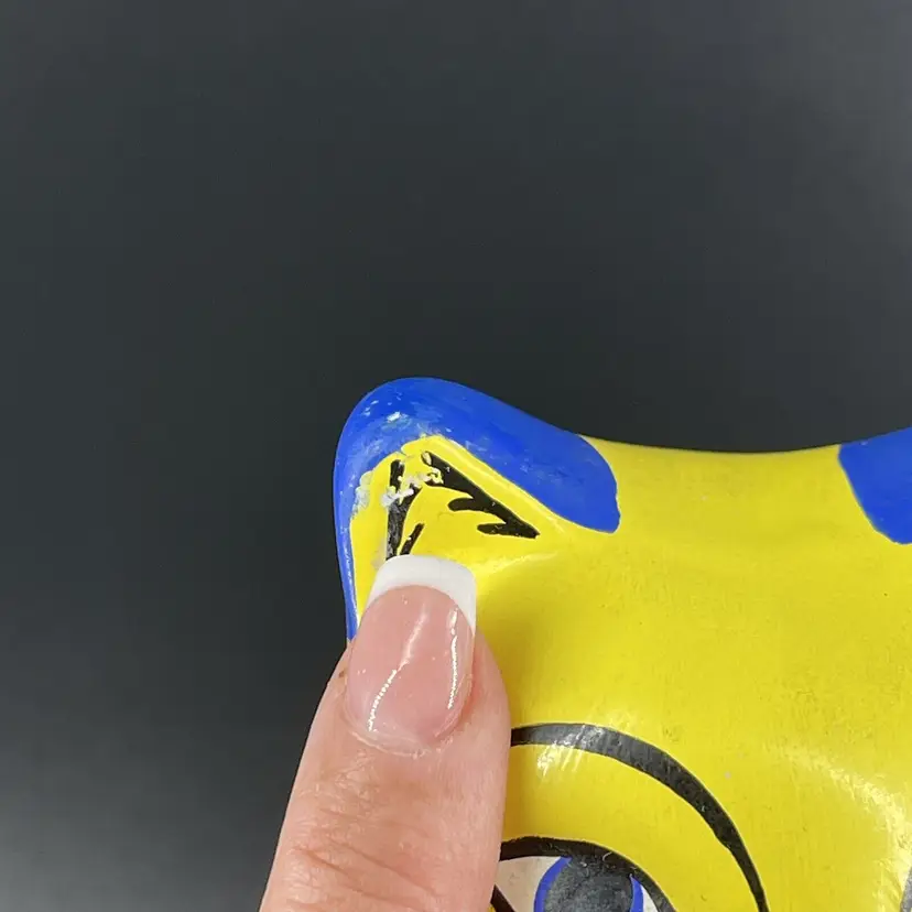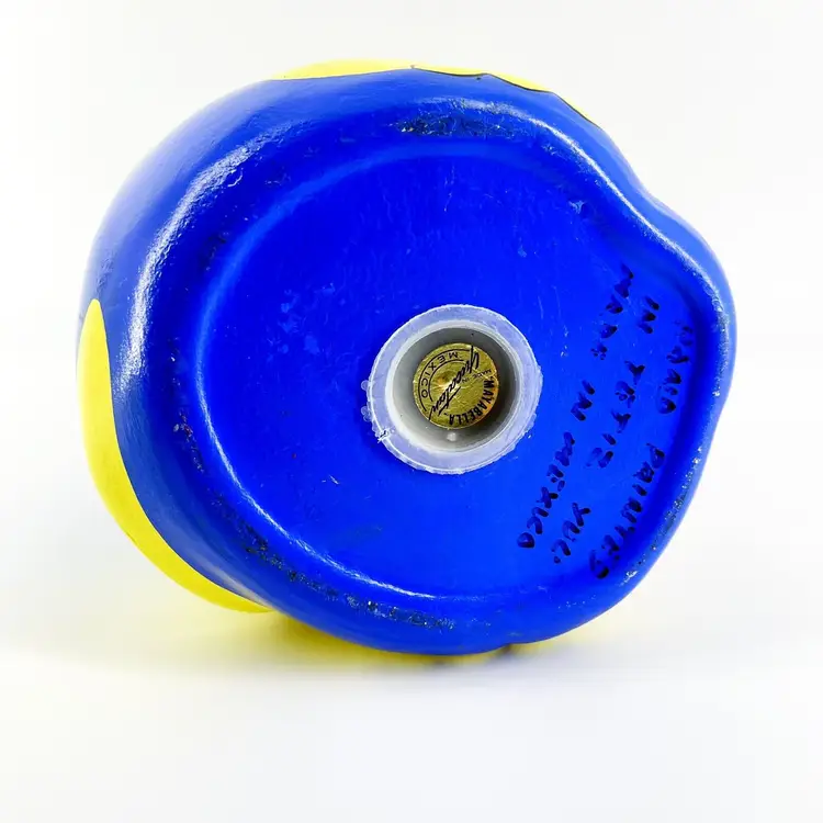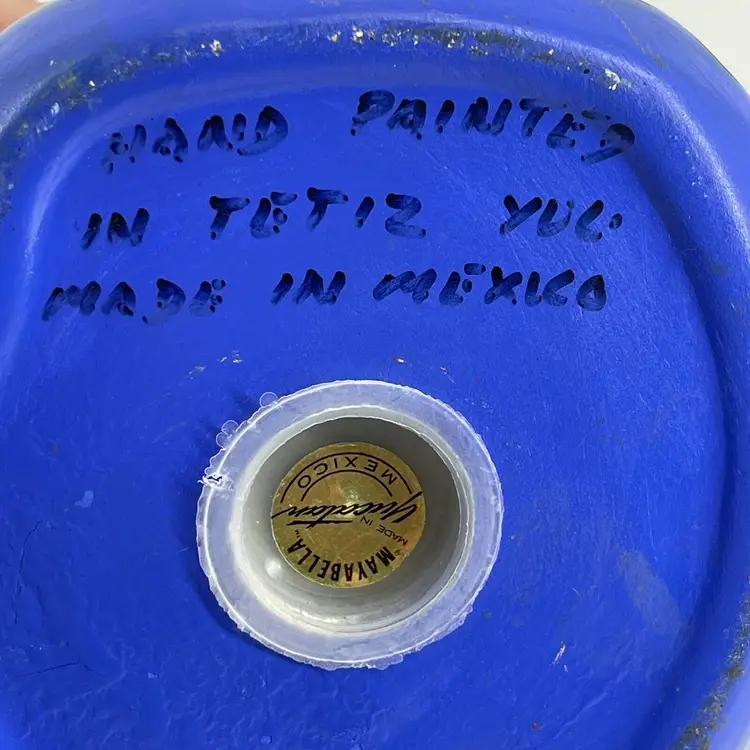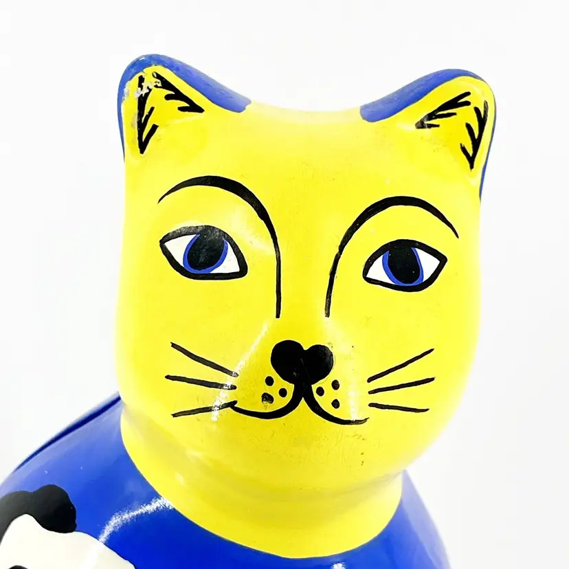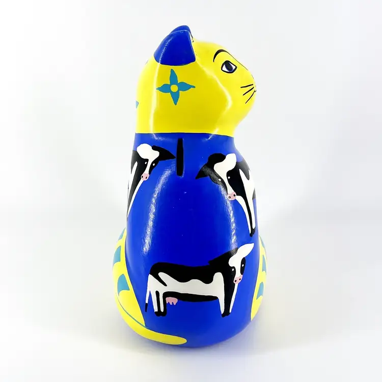 This ceramic figural cat bank was made in Mexico by Mayabella. It features a hand painted blue and yellow design with cows. It is 10" tall and measures 6"x5.5" and is in excellent condition. There are no cracks, breaks, chips or repairs. There is some surface marks from use. (See photos).