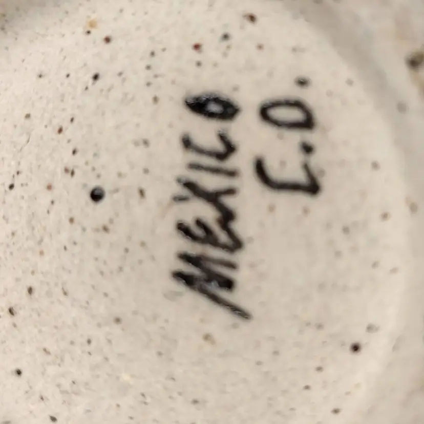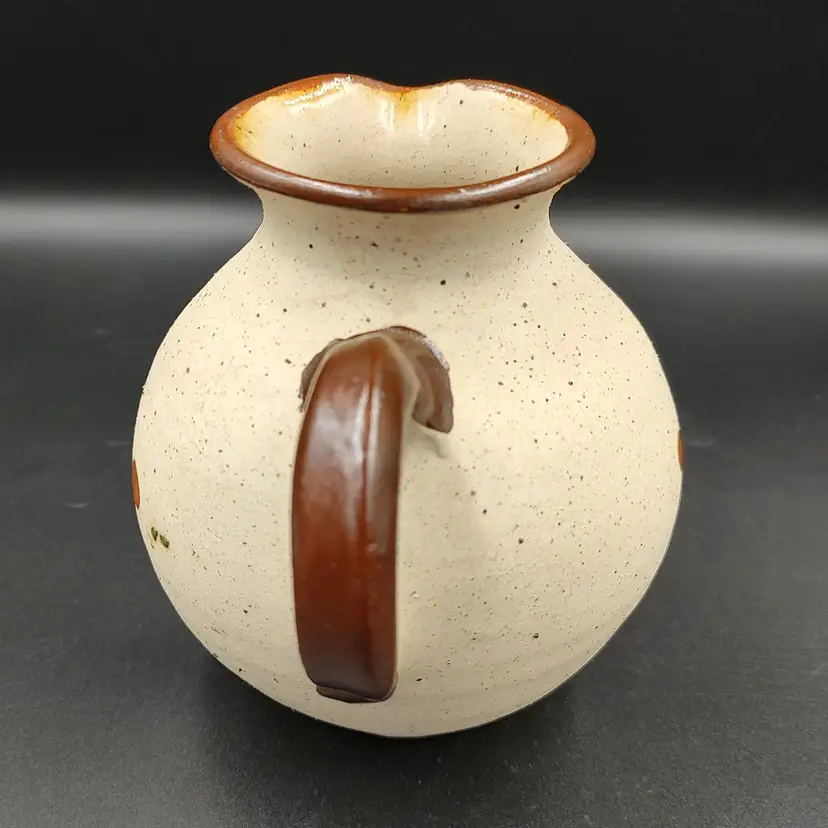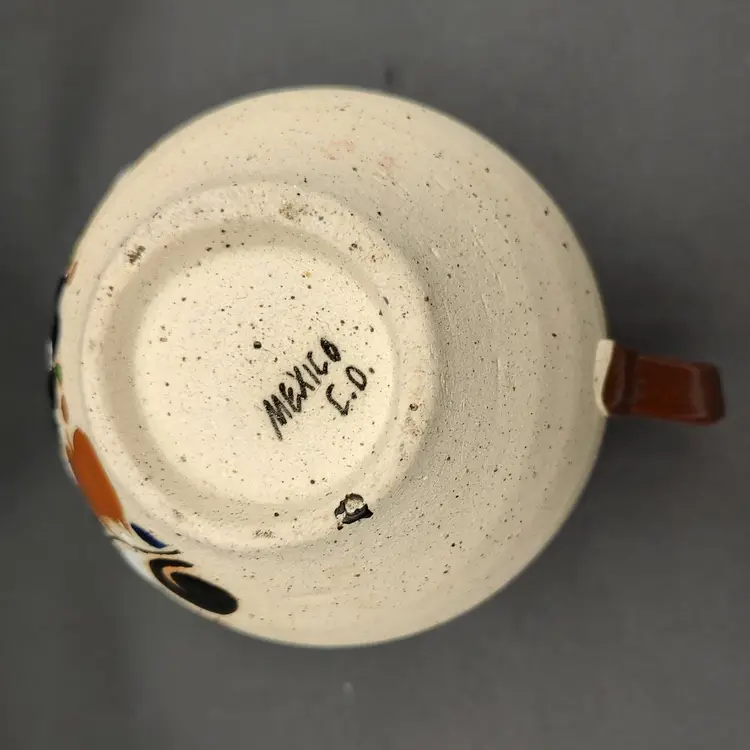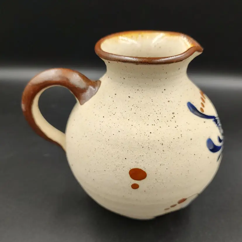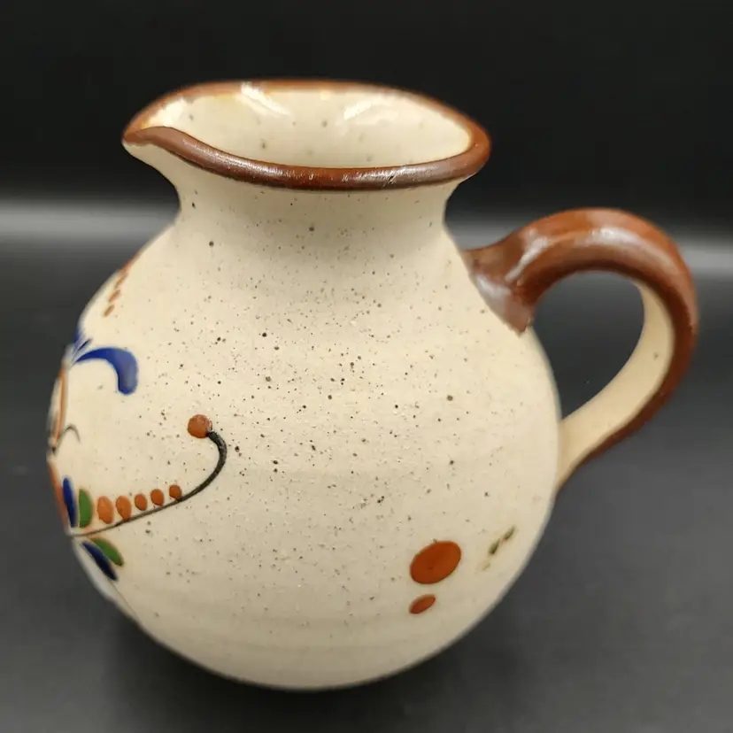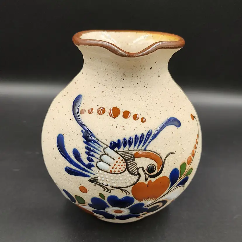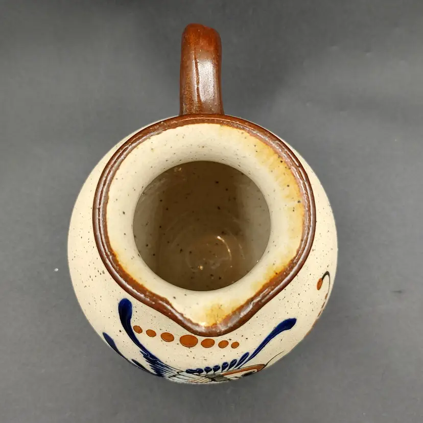 Vintage 1970 Mexican Tolona Folk Art Pottery Pitcher Bird and Floral Motif. Height 5" x diameter 5" x length 6". Holds 2 cups. Made in Mexico