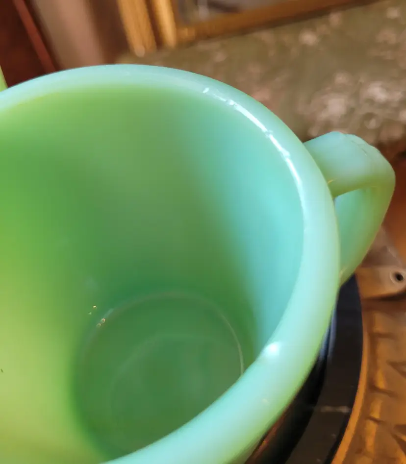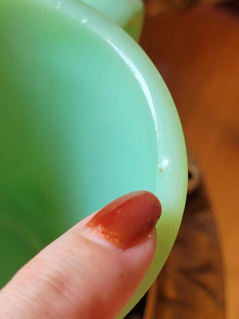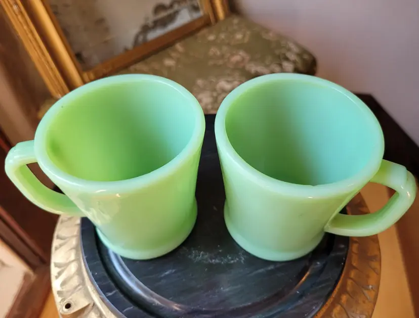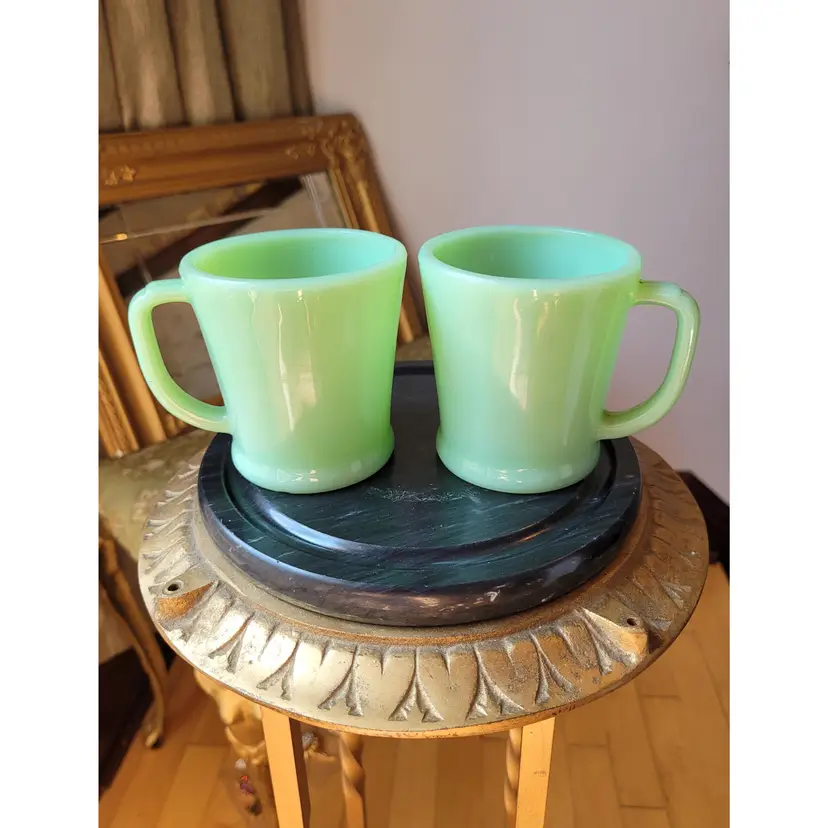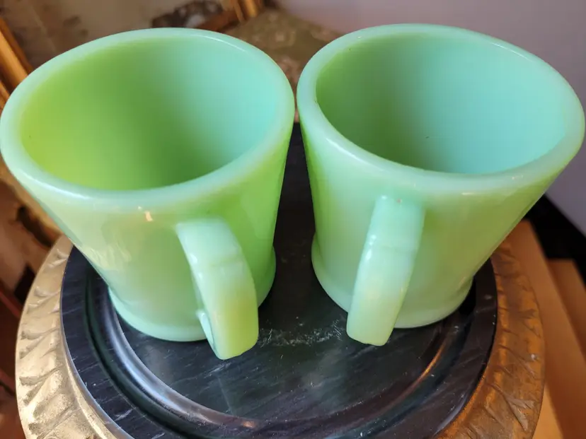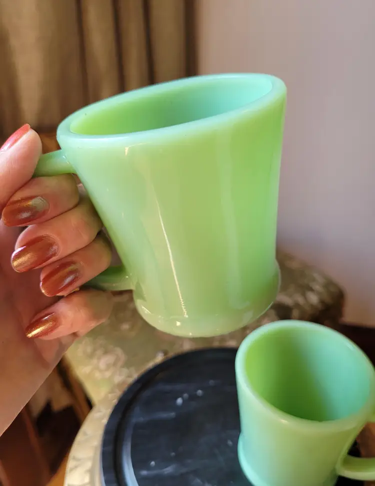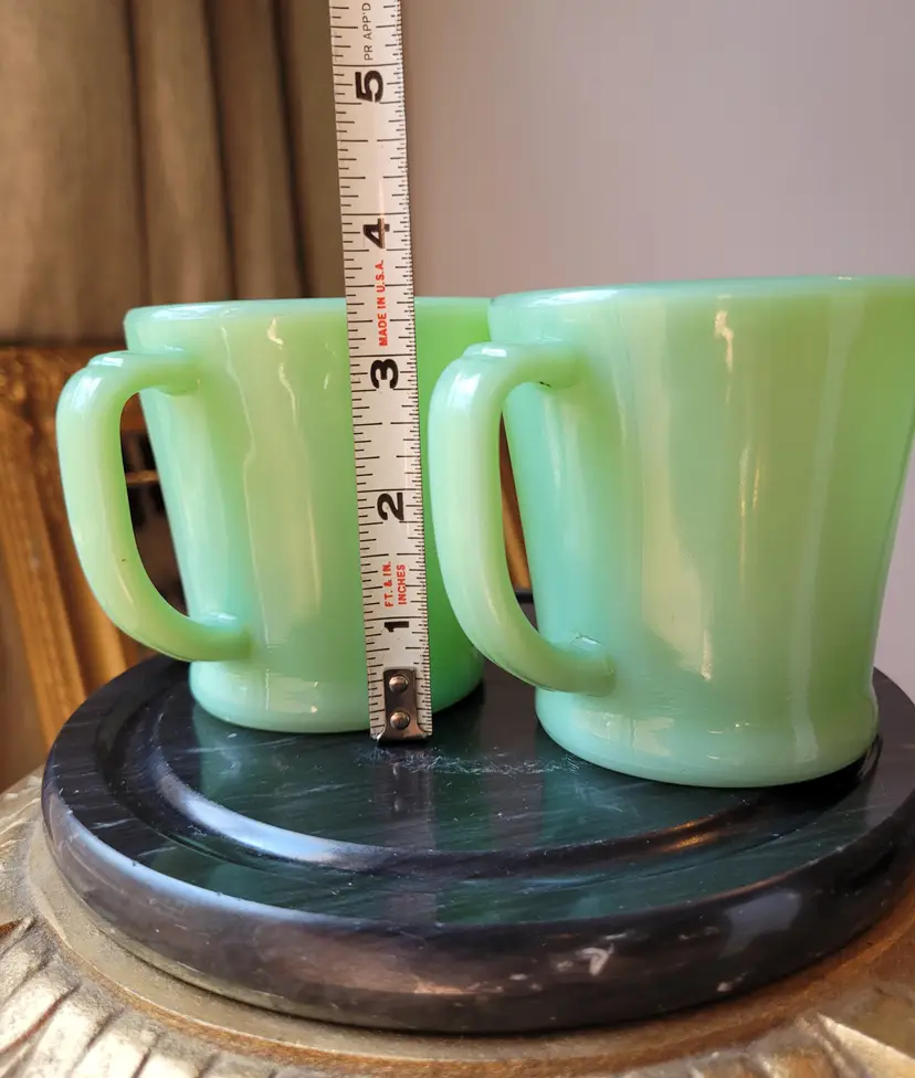 Gorgeous green jadeite mug set! These are circa 1940s/50s and from an estate. They are in good condition but one does have some flea bites at the rim that I've pointed out in pictures. Please see pictures for details and measurements.