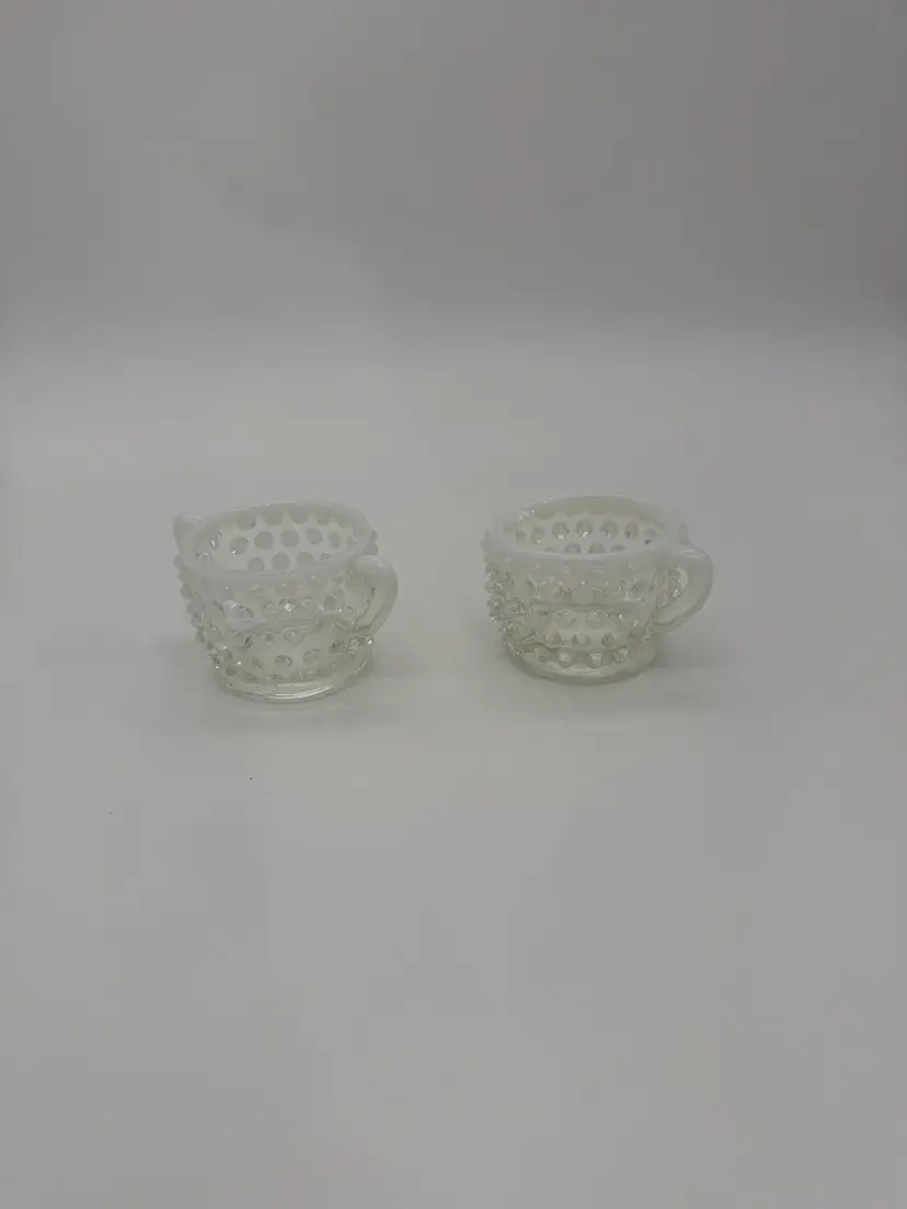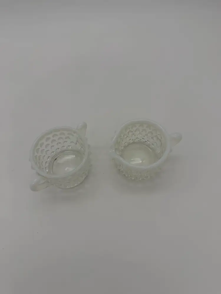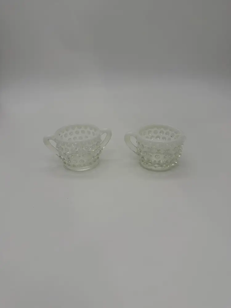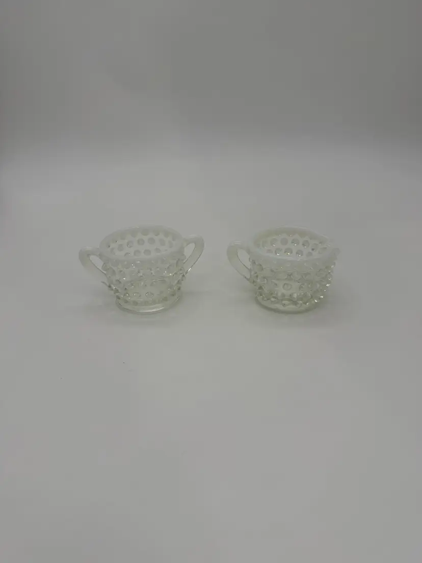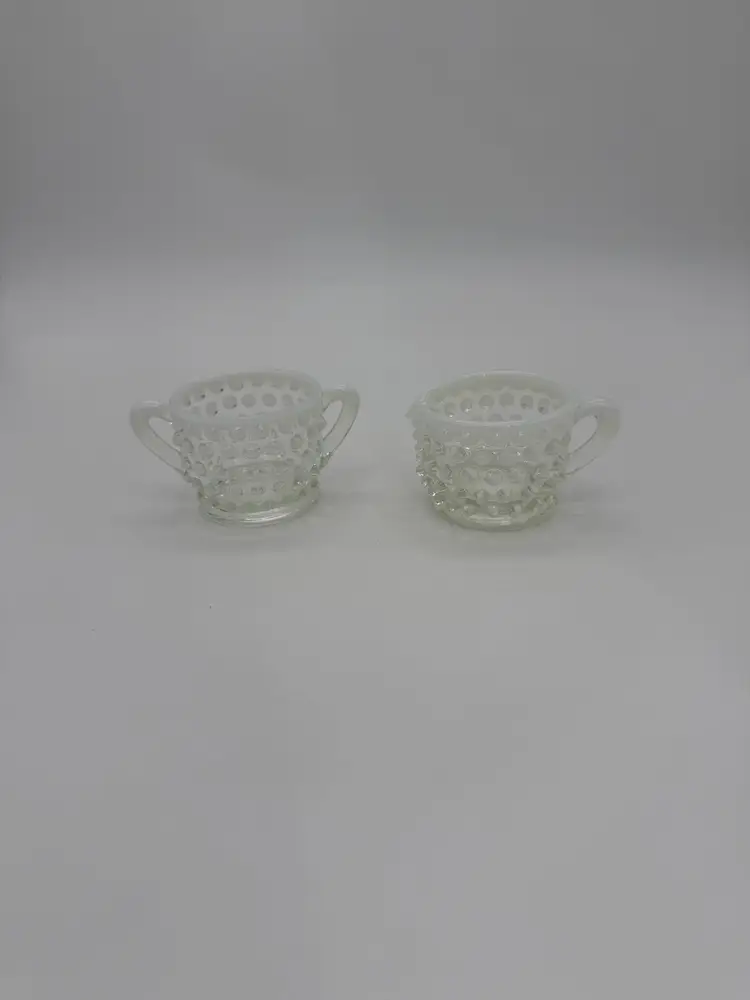 This vintage Mid Century Moonstone Fenton Glass Hobnail Sugar & Creamer Set with Handles is a beautiful and unique addition to any kitchen or dining room. The clear glass with bluish milky white accents gives it a distinctive and elegant look, perfect for collectors of Victorian or Mid Century style decor. Made in the United States with a pressed glass production style, this set of two has a capacity of 3 oz and weighs together 9.7 oz. The round shape, glossy finish, and intricate hobnail/moonstone pattern make this set a charming and functional piece for serving sugar and creamer in style. Excellent Condition!