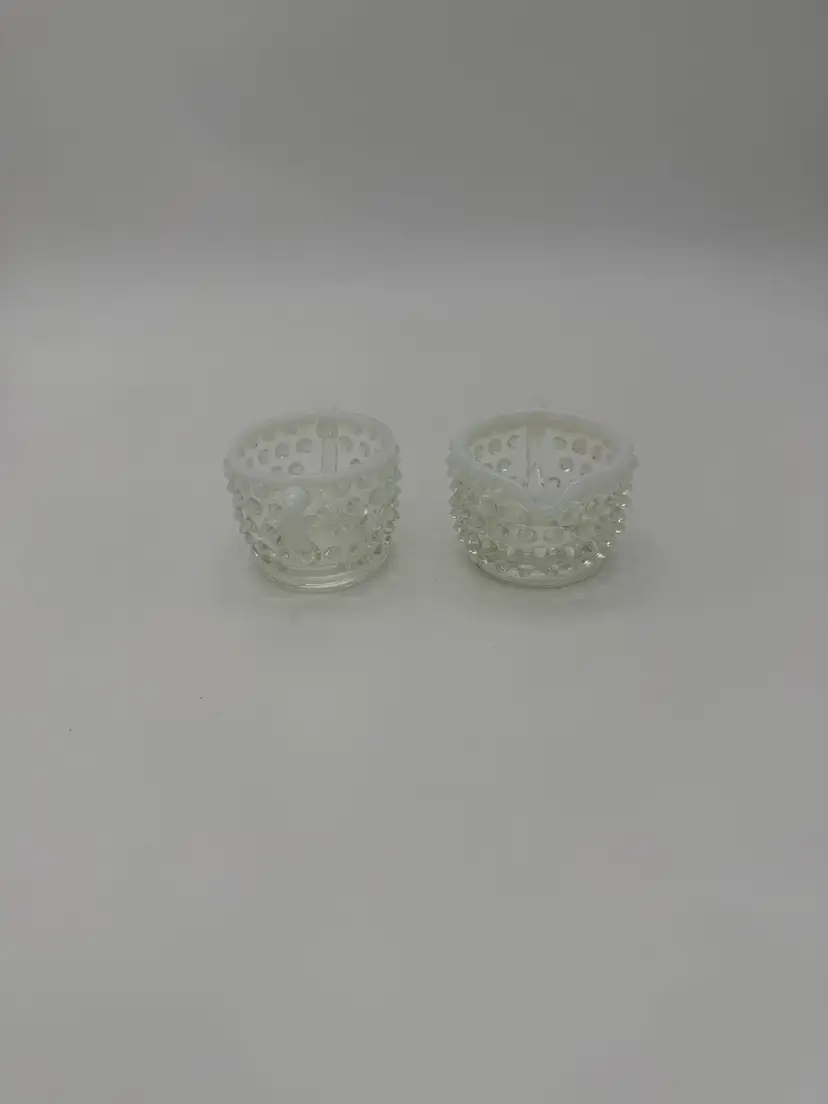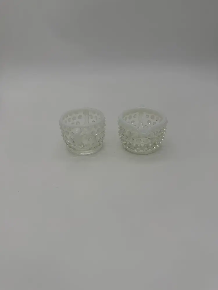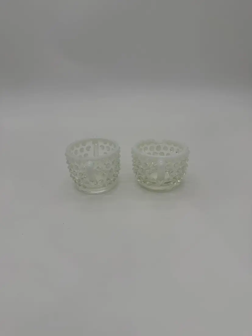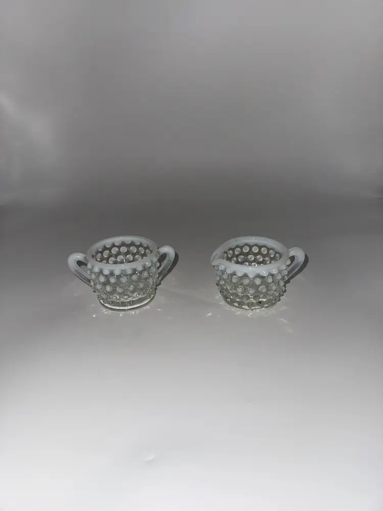 This vintage Mid Century Moonstone Fenton Glass Hobnail Sugar & Creamer Set with Handles is a beautiful and unique addition to any kitchen or dining room. The clear glass with bluish milky white accents gives it a distinctive and elegant look, perfect for collectors of Victorian or Mid Century style decor. Made in the United States with a pressed glass production style, this set of two has a capacity of 3 oz and weighs together 9.7 oz. The round shape, glossy finish, and intricate hobnail/moonstone pattern make this set a charming and functional piece for serving sugar and creamer in style. Excellent Condition!